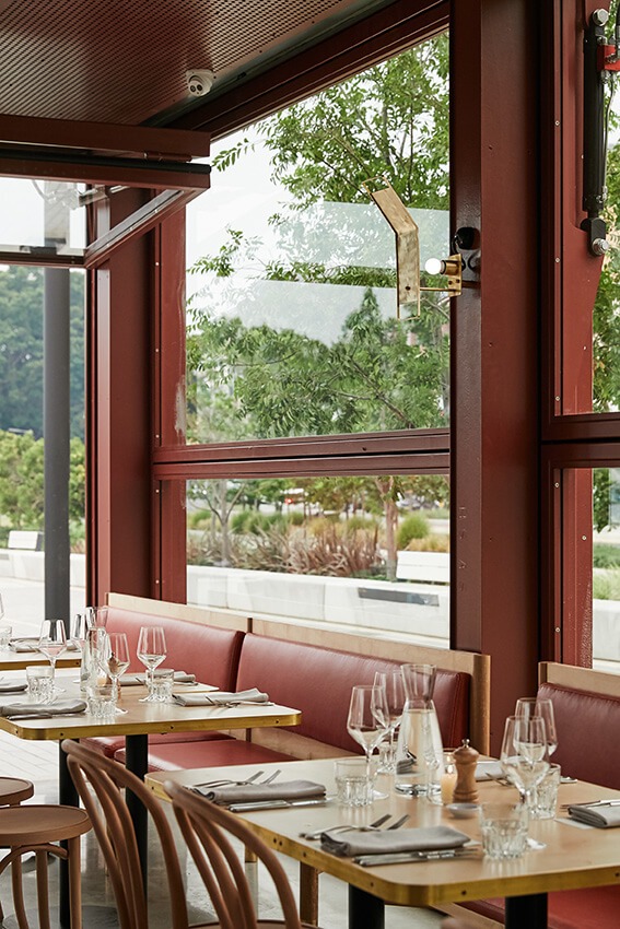 The new café pavilion is deliberately modest, light and finely detailed, in deference to the strong aesthetic of the masonry Signal Box. A new spiral stair, which takes its cues from the existing interior stair, provides visual public access to the mezzanine housing the lever switch gear and the rooftop. A steel awning delicately connects old and new and its axis guides visitors moving eastward to the pavilion dining room echoing an arriving train. The pavilion’s dimensions are based on the longitudinal geometry of the Signal Box interior and the facades are divided into three glazed door partitions to reflect the imperial proportion system commonplace in railway geometry. The hydraulic operation of the windows emulates the miniature hydraulic lever gear and the circular rooftop enclosure makes reference to a former turntable structure uncovered during ground works that remains concealed underfoot. The steel structure is finished in a matte red oxide in tribute to the old ‘red rattler’ carriages and nearby shipping containers.