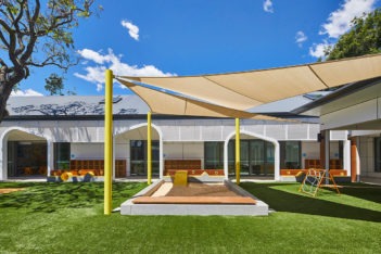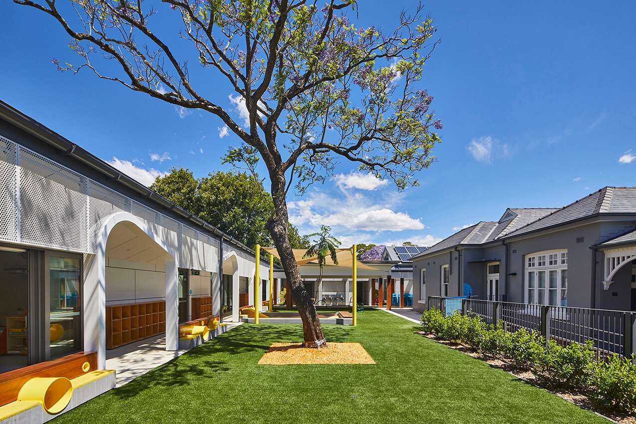 The Meriden School Lingwood Campus is home to a heritage listed Federation house set to the rear of a large block. Rather than dominate the site with new development, Allen Jack + Cottier have sensitively wrapped their new passive house designed classrooms around the rear boundary, retaining the house as the key site address. In doing so, the remainder of the site is given over to landscape and play. All interventions in the site are sensitive to the Federation house form, while scaled for their occupants, preschoolers and kindergarteners.
