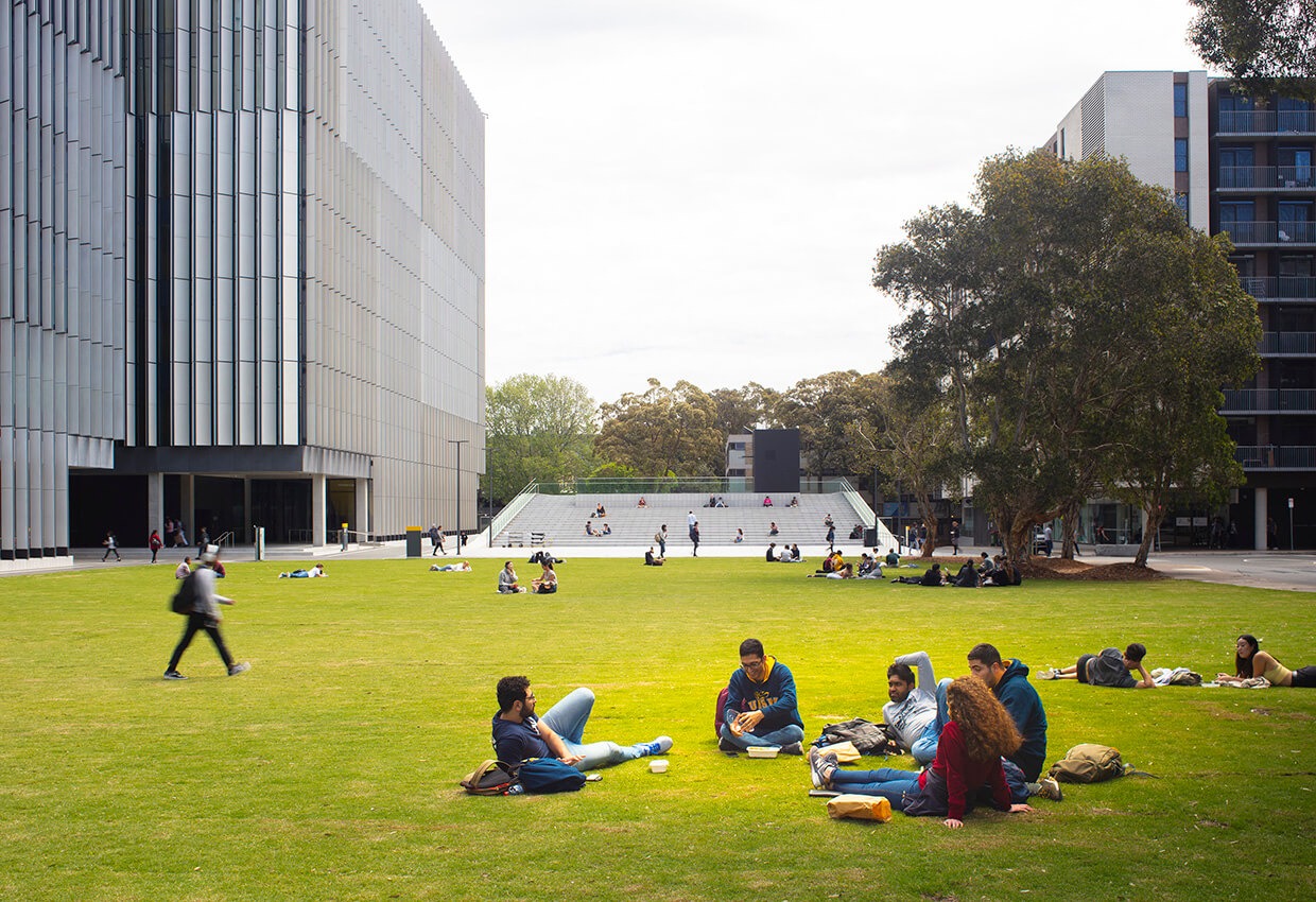 The Alumni Green succeeds as a subdued, large, north facing, landscaped space between the residential colleges and the broad colonnade of the Science buildings, a new open space for the campus that connects the upper library campus down to the new light rail station of Anzac Parade. Unexpectedly, vertical metal blades of the Science Building intermittently extend to the ground to define the wide, north facing colonnade.