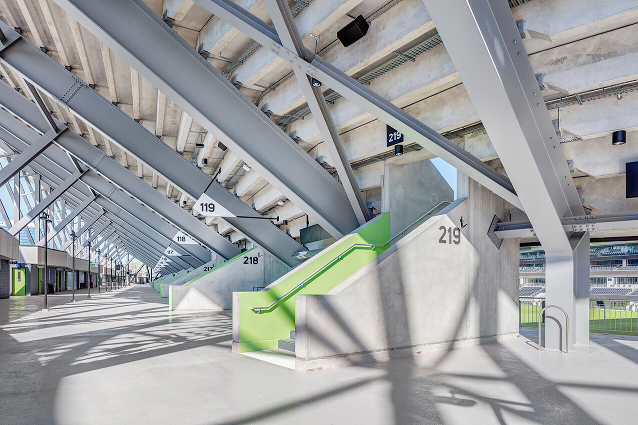 The stadium in Parramatta sits humbly within this context and yet delivers a project with an unexpected intimacy, humanity and tactility. Designed with a sophisticated understanding of stadia, every attempt has been made to offer humanising spaces, capable of traversing wide-ranging programmatic requirements, from a local weekend game to a full capacity star-studded concert. The decision to work with Australian steel inspired visual cues to memories of our city, exposing that an intimate experience is possible in this important civic building. The detail too, in the use of only local sections, is masterfully executed.