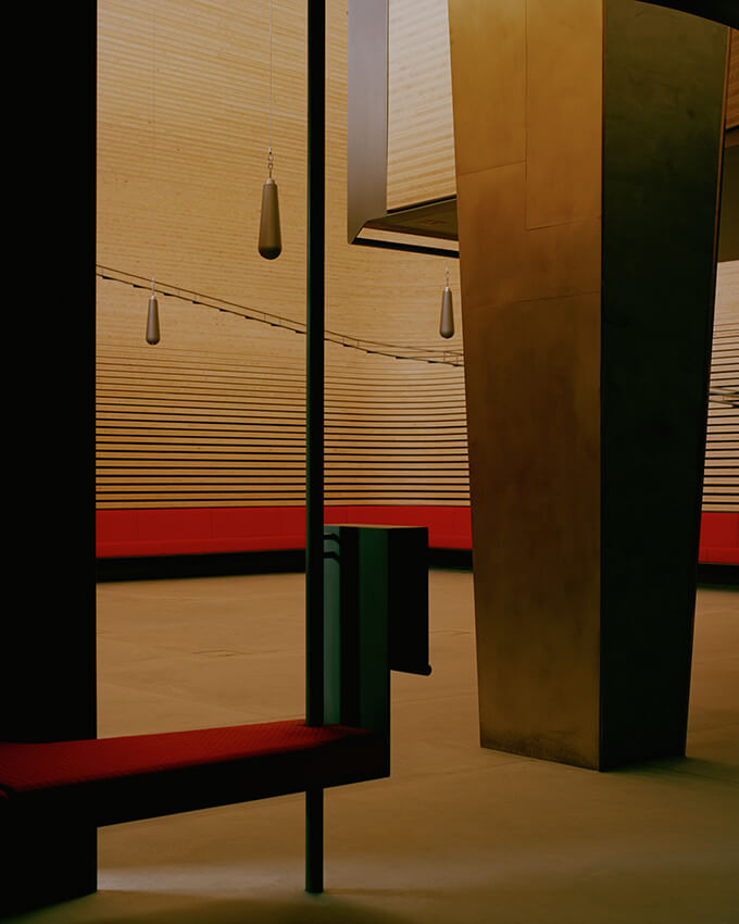 Standing as an imposing sentry to the Upper Kensington Campus Gate Nine Arrival Precinct, lahznimmo have reestablished its address by folding open its entrances to a gold, purple and royal blue interior. This rich interior takes its cues from the existing tapestry Banner, installed by the artist Mona Hessing and spanning 20m across the northern foyer. These sonorous colours and textures are juxtaposed against the cool off-form concrete walls and soffits, which have been painstakingly restored, elevating the intended brutal beauty of this modernist monument.