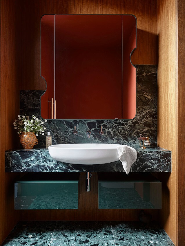 It is rare that a house can provide a cinematic experience. Grant Pirrie House frames the second chapter of a client’s life with art and architecture with the adaptation of space that originated with the already highly accomplished work of Graham Jahn. Jahn’s work acts as a springboard to a further developed interior to suit a new stage of life. The return-movements upon one’s own paths is reminiscent of Pierre Chareau’s Maison de Verre in Paris. Concurrently the design develops into a contemplative piece work of darkness and shadow as it does a work of light and detail. The masterful play of colour and materiality originally developed by Jahn are progressed by Kerridge, who acknowledges the composition’s dual authorship, providing a respectful deliberation into the earlier work. The life and loves of the client are evident as you sequence through space, reminding us that a rich palette is as much the client’s animation as it is the hand of a great architect. Pragmatic at times but mostly artful, this interior develops the idea of working over the respected achievements of a peer, honouring their mastery and feeling comfortable to edit as required. It also considers that the entirety of the architectural profession may indeed be ‘one’ if it embodies respect, reverence and reticence in everything that it does as a whole. This is the work of a culture and profession at its best.