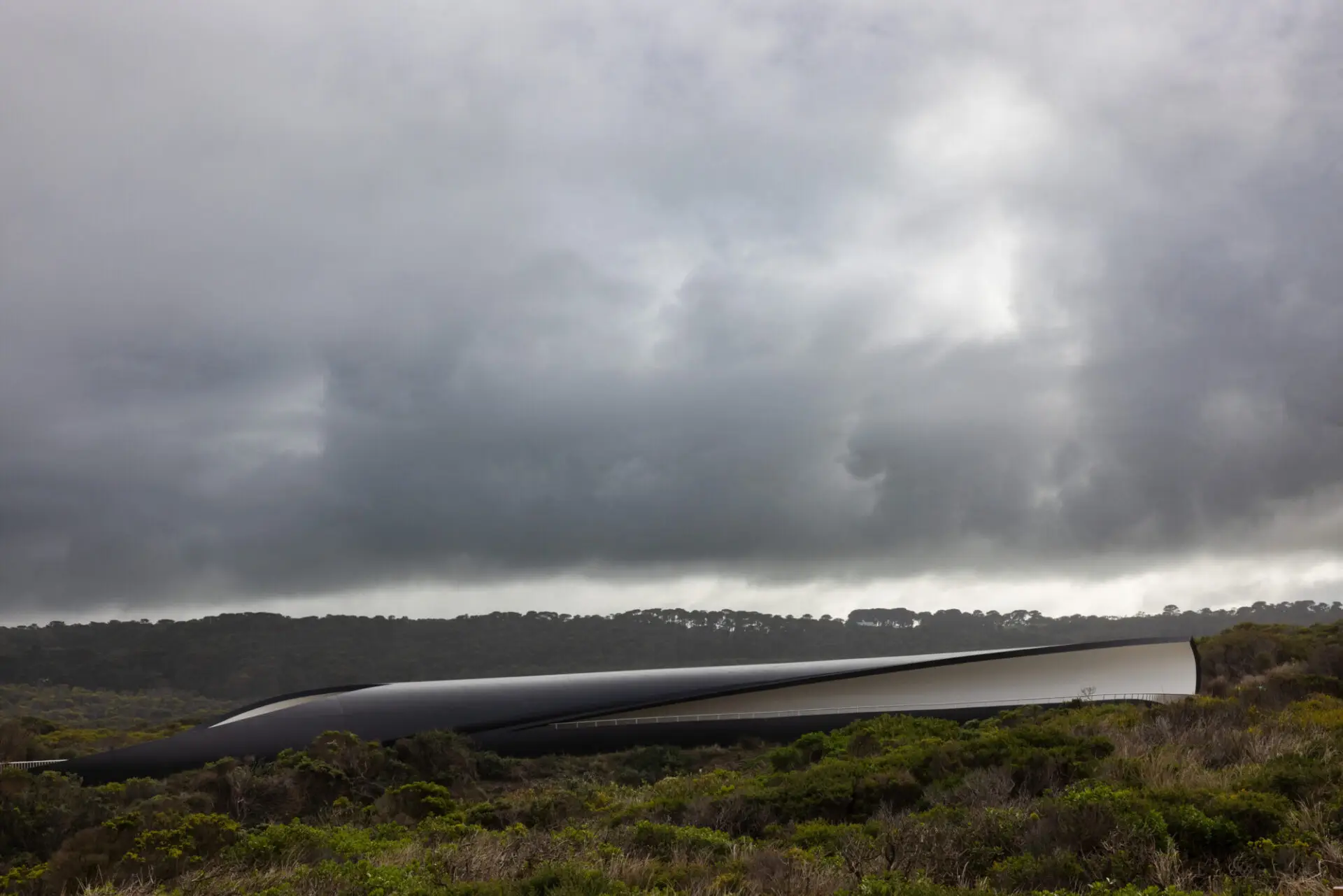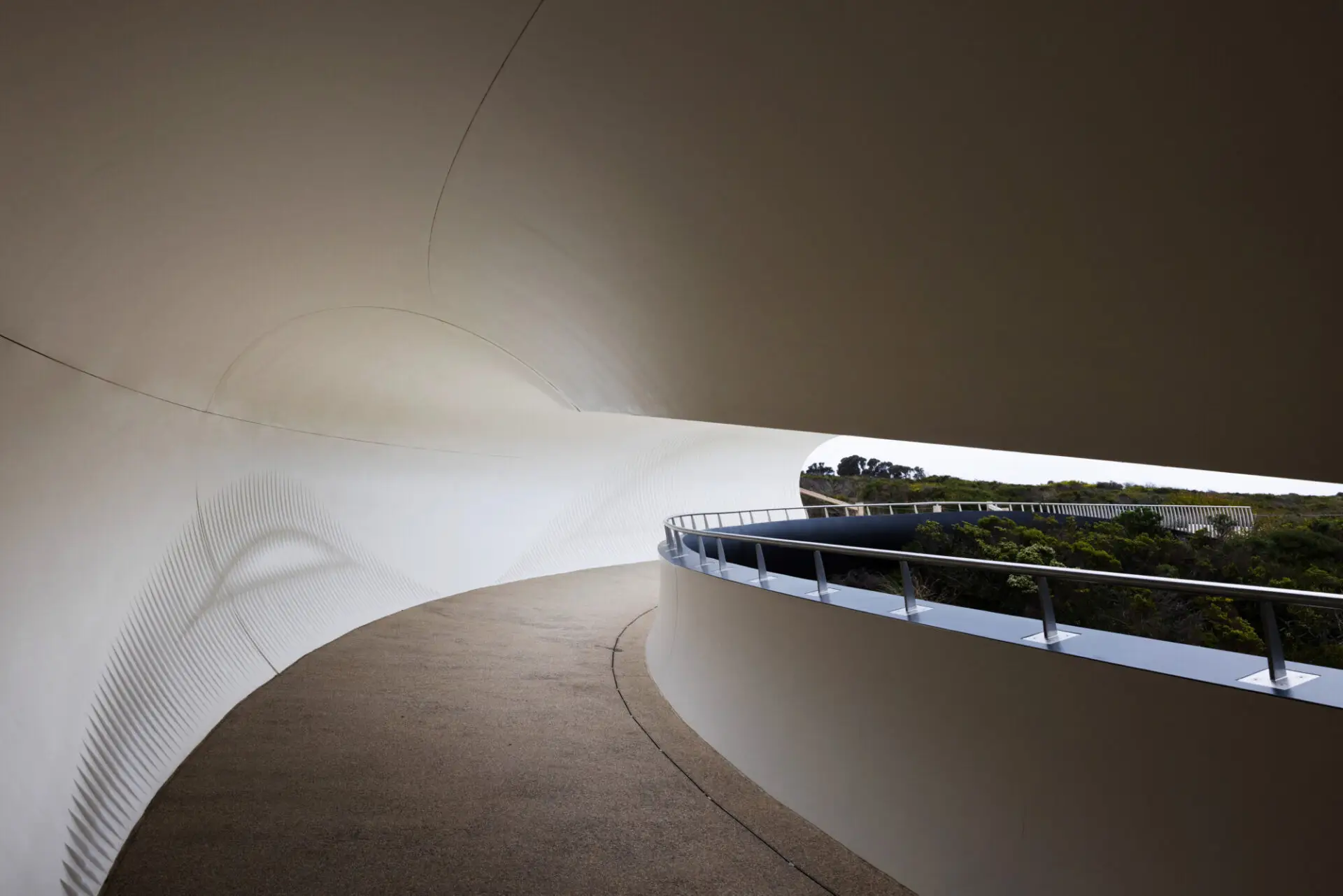 Both are contemporary expressions of Indigenous culture; monotone and highlight colours reflect the black and white cockatoo moieties central to Eastern Maar society, one lookout represents clapsticks, while the other reflects the Southern Right Whale. One cantilevers dramatically over cliffs for a thrilling visitor experience at the continent’s edge, while the other is immersed in low-level landscape, wrapping around the blowhole with a wave-like organic form, concealing then revealing the site’s drama.