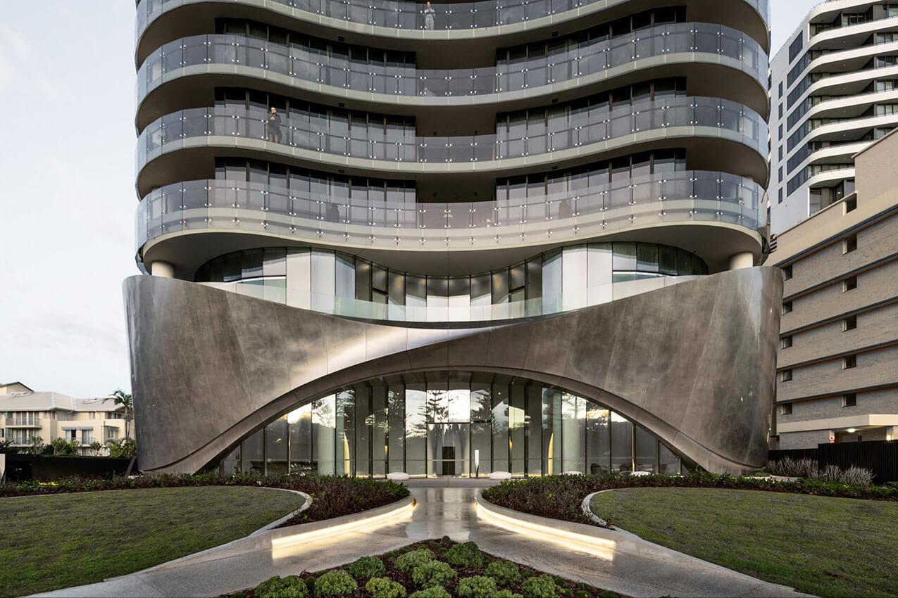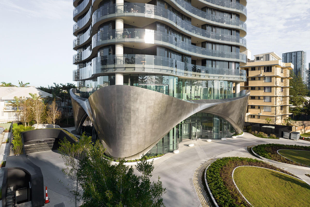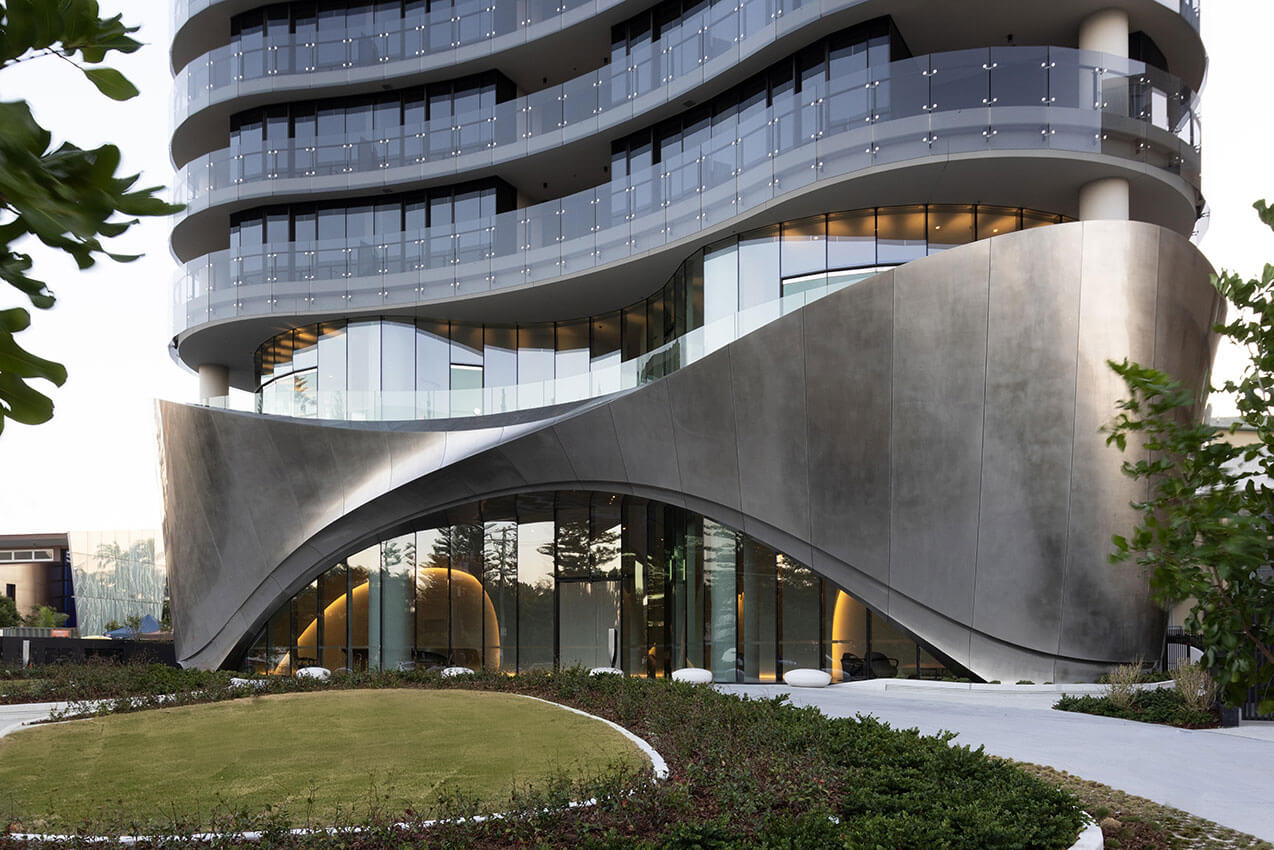 The contoured, sculptural form of the two-storey pedestal base for 272 Hedges Avenue in the Gold Coast, Australia, is inspired by wind and water patterns on rock and sand, creates a contextual connection to the streetscape and coastal parklands.