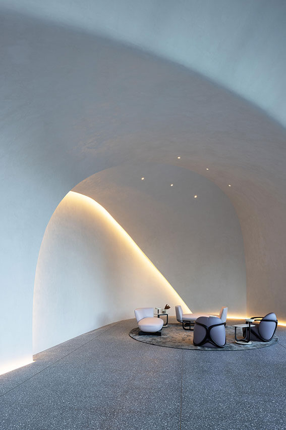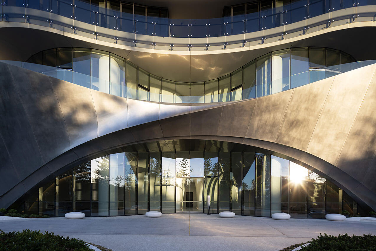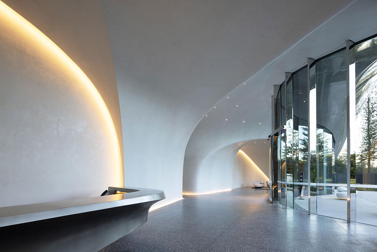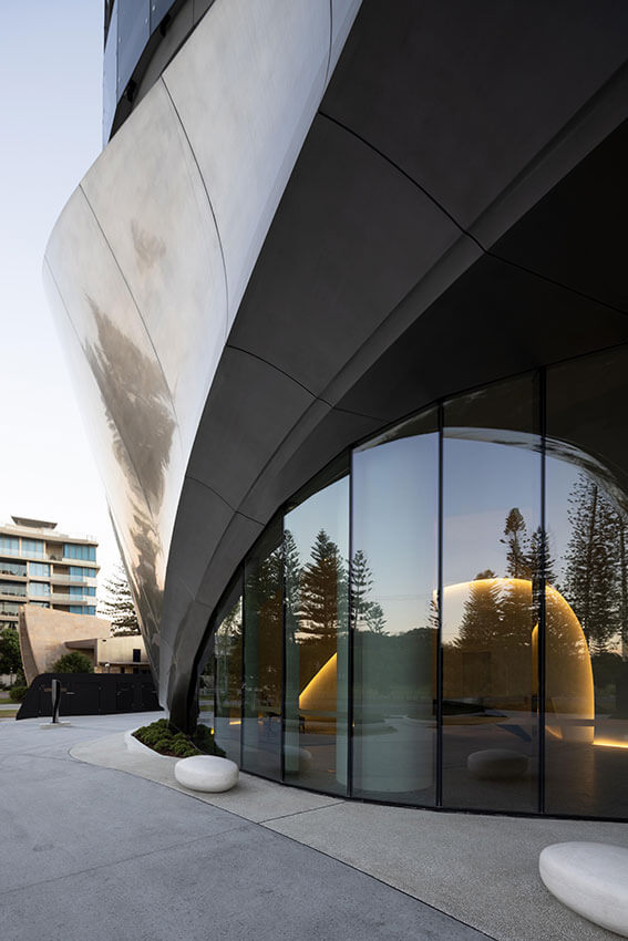 The contoured, sculptural form of the two-storey pedestal base for 272 Hedges Avenue in the Gold Coast, Australia, is inspired by wind and water patterns on rock and sand, creates a contextual connection to the streetscape and coastal parklands.