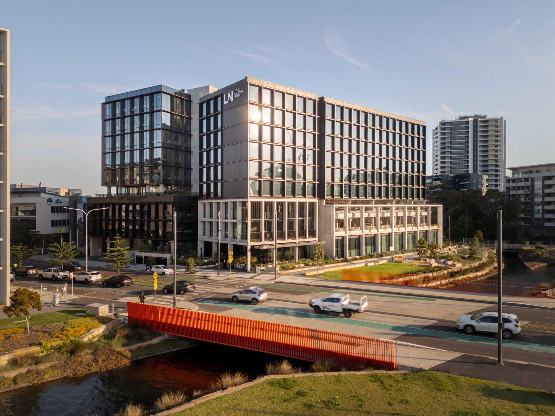The hotel and office buildings are expressed as distinct yet complementary volumes, connected by landscaped podium terraces and a shared carpark podium lined with active frontages. The hotel engages Cottage Creek and its parkland, offering 179 guest rooms and refined amenity spaces designed by Luchetti Krelle. The commercial building features flexible, light-filled floorplates, a café opening to Honeysuckle Drive, and a low-carbon CLT/GLT structure.