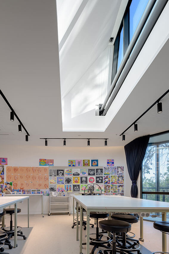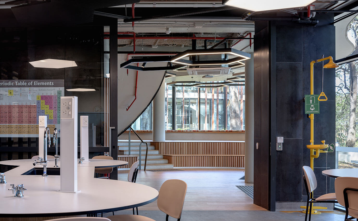 Its two organically shaped wings – one for science, one for art – are joined centrally by a curved glass-enclosed walkway. In the spirit of scientific inquiry, the science wing expresses its material construction with exposed structure and services, while the art workshops and studios are naturally lit from windows and skylights to the south.