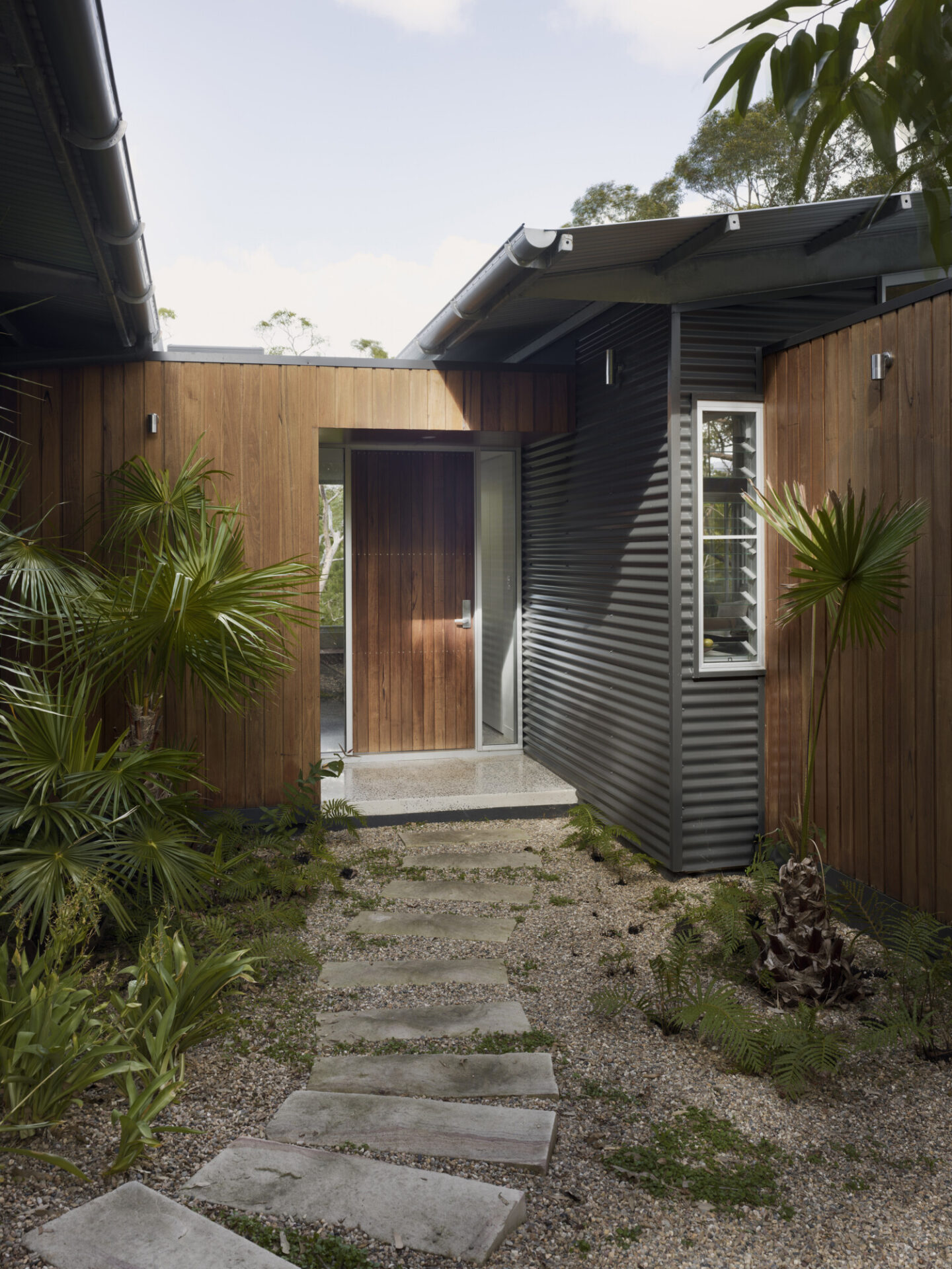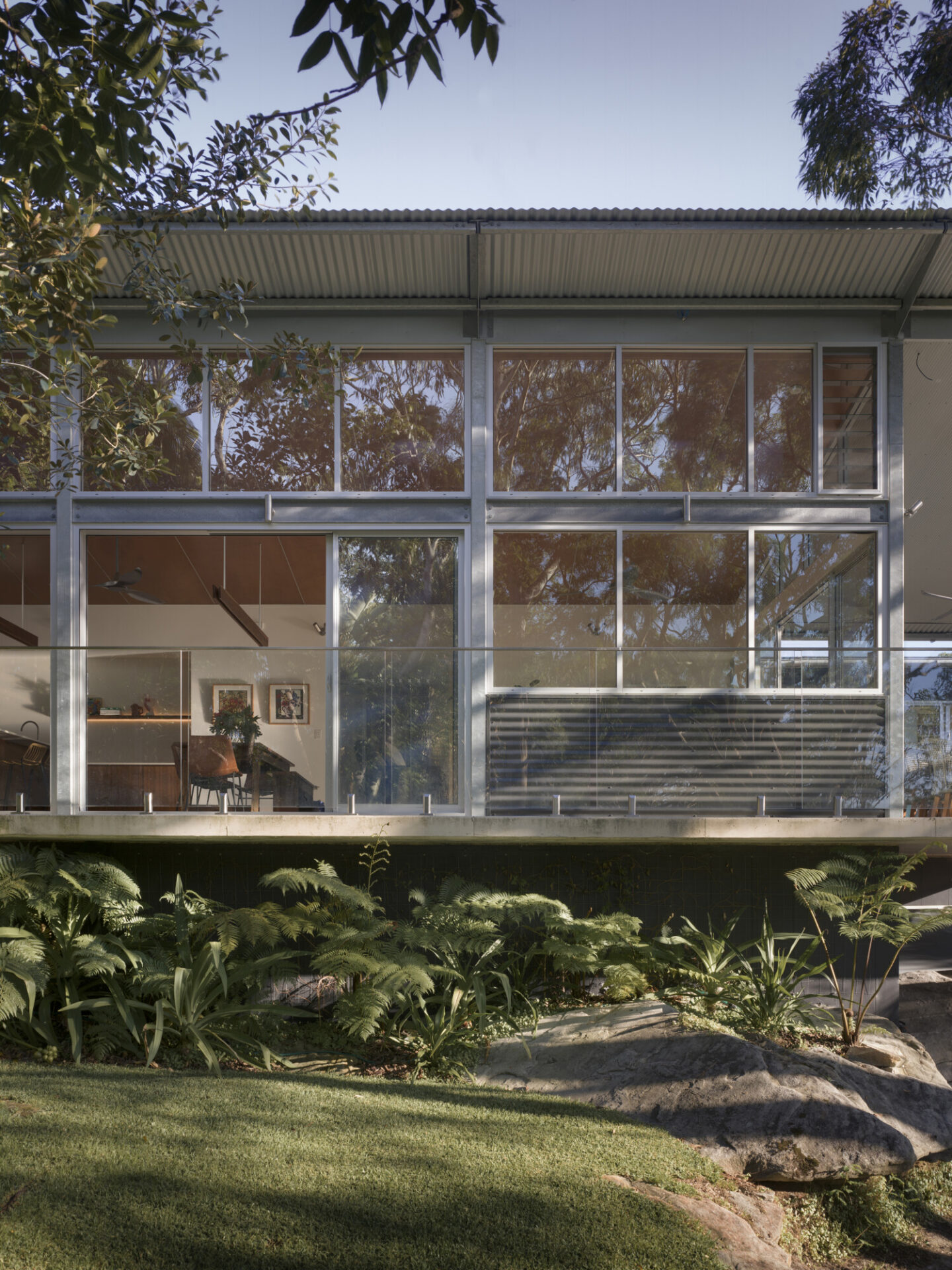 Alcheringa is a new home set within a rare remnant of bushland at Yowie Bay, quietly encircled by suburbia but retaining the feeling of a much older landscape. A registered Aboriginal midden, a creek winding through the property and a geologically-significant sandstone outcrop together shaped the direction of the project.