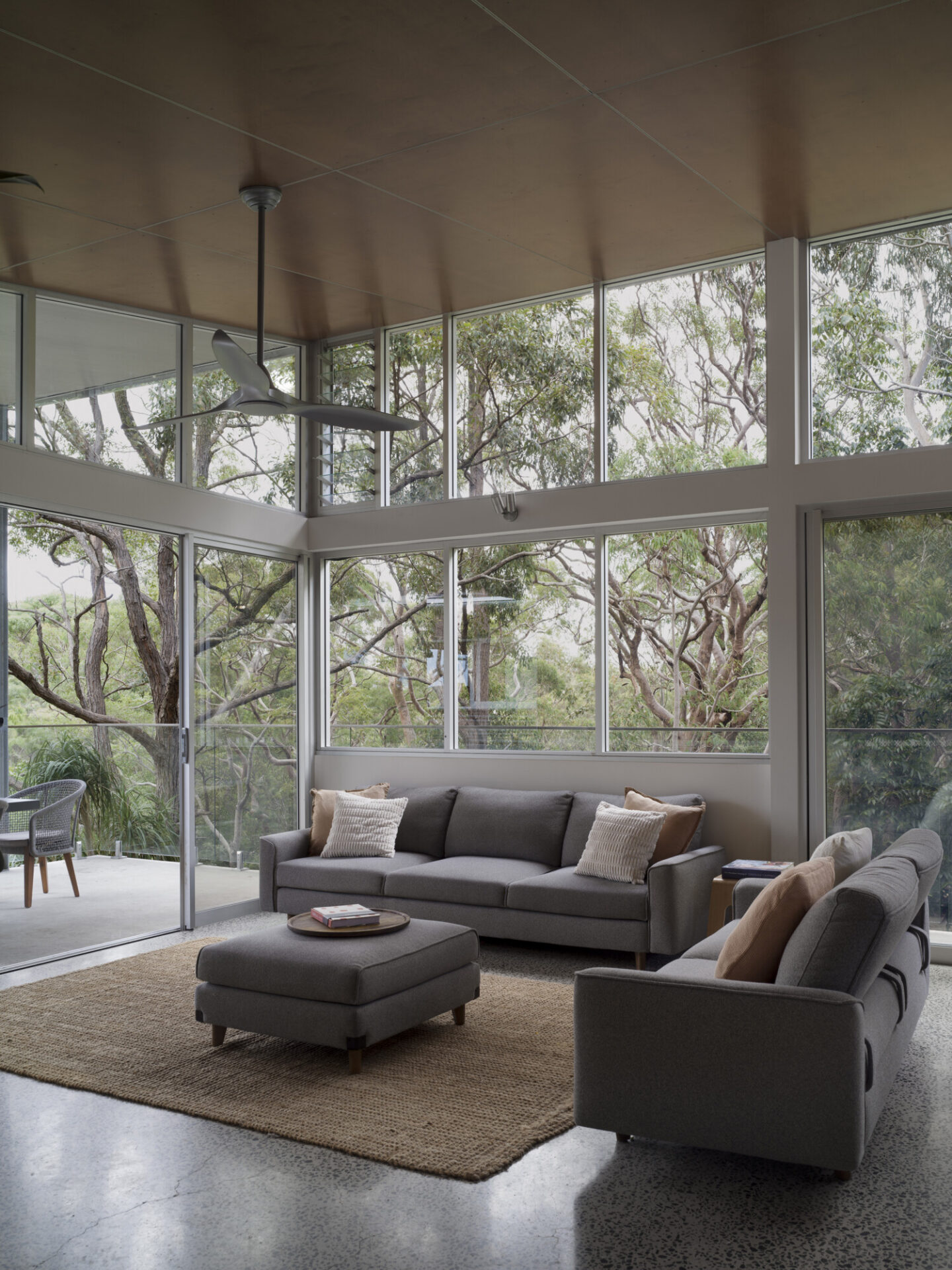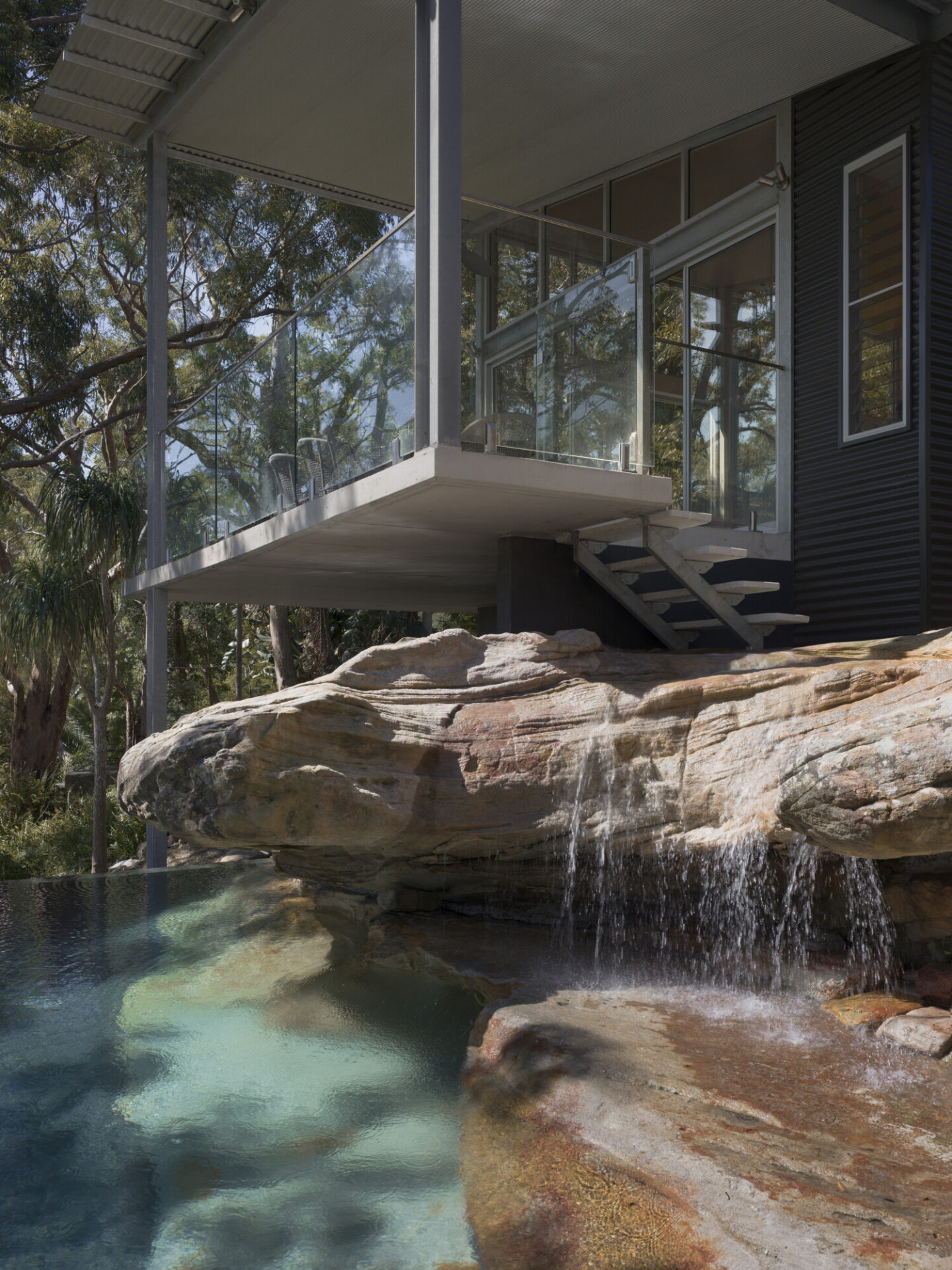 The home has been designed to BAL-40 standards within the footprint of the former 1950s fibro cottage to retain the native landscape. Rather than being seen as an obstacle, the sandstone outcrop was integrated into the structure of the central infinity pool. Two narrow pavilions connected by a central breezeway frame and lead to the pool and bushland, creating a gentle rhythm between public life and private retreat while also supporting passive performance.