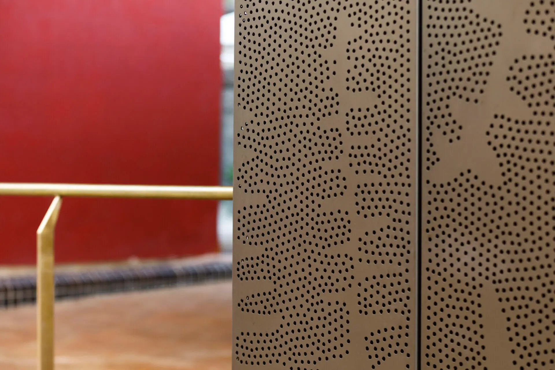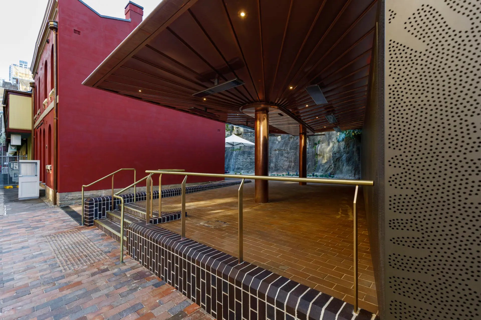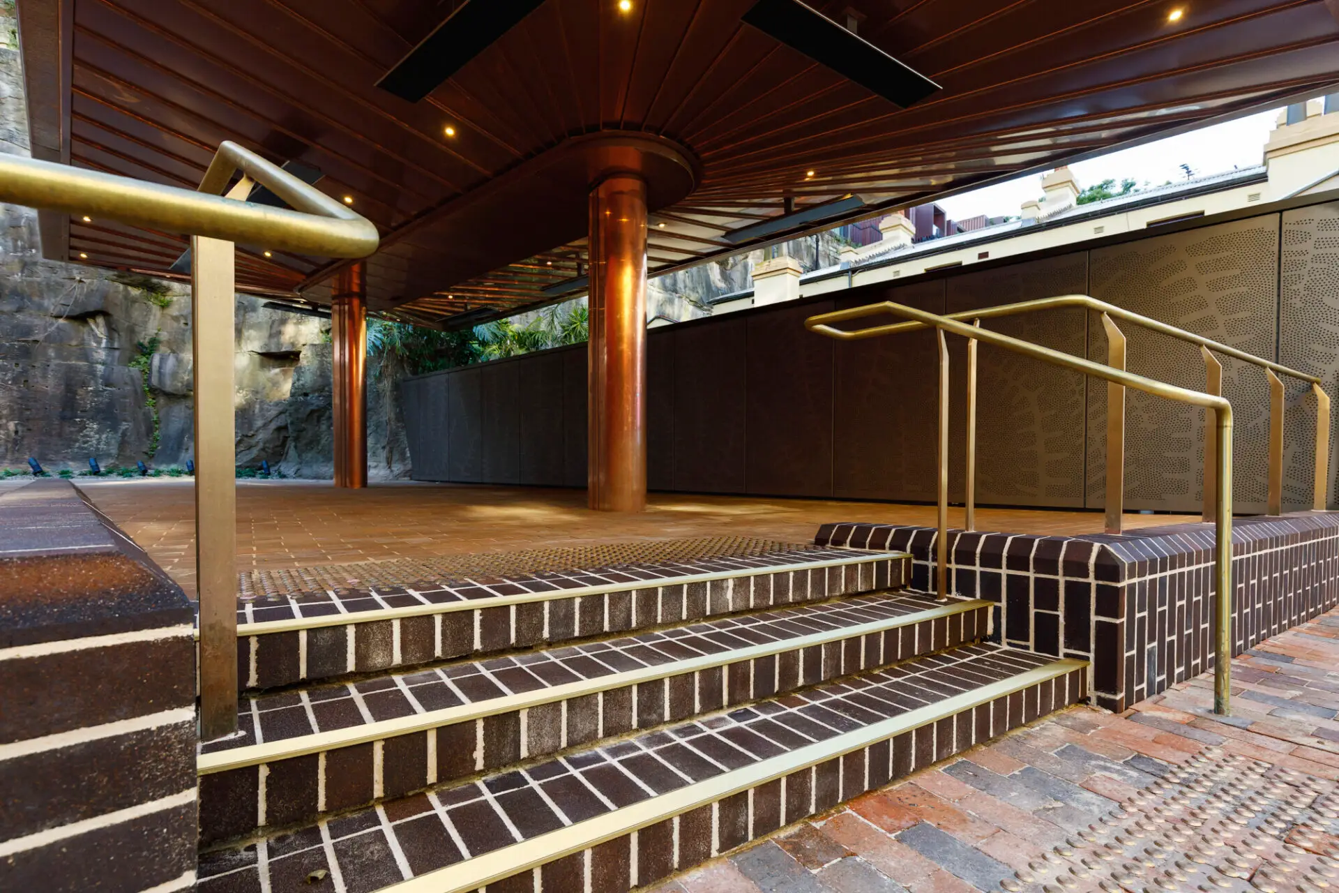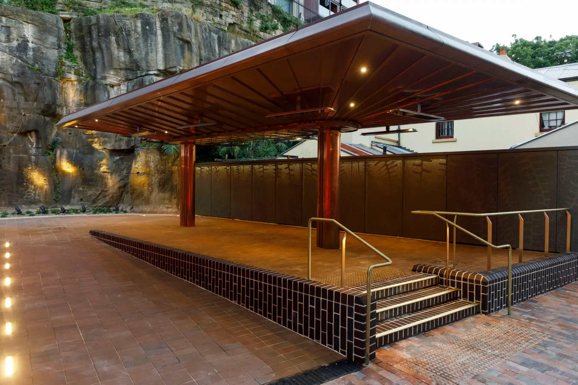 A low‑scale canopy supports use, providing shelter, lighting and services while sitting below the surrounding terraces and sandstone escarpment. Finished in copper, it reflects the tones of the sandstone and brickwork and reinforces the character of the space. Custom‑designed screens incorporate artwork by Gumbaynggirr artist Sancia Janggalay Ridgeway, referencing the Pouched Coral Fern and acknowledging Indigenous connection to Country and the site’s sandstone landscape.