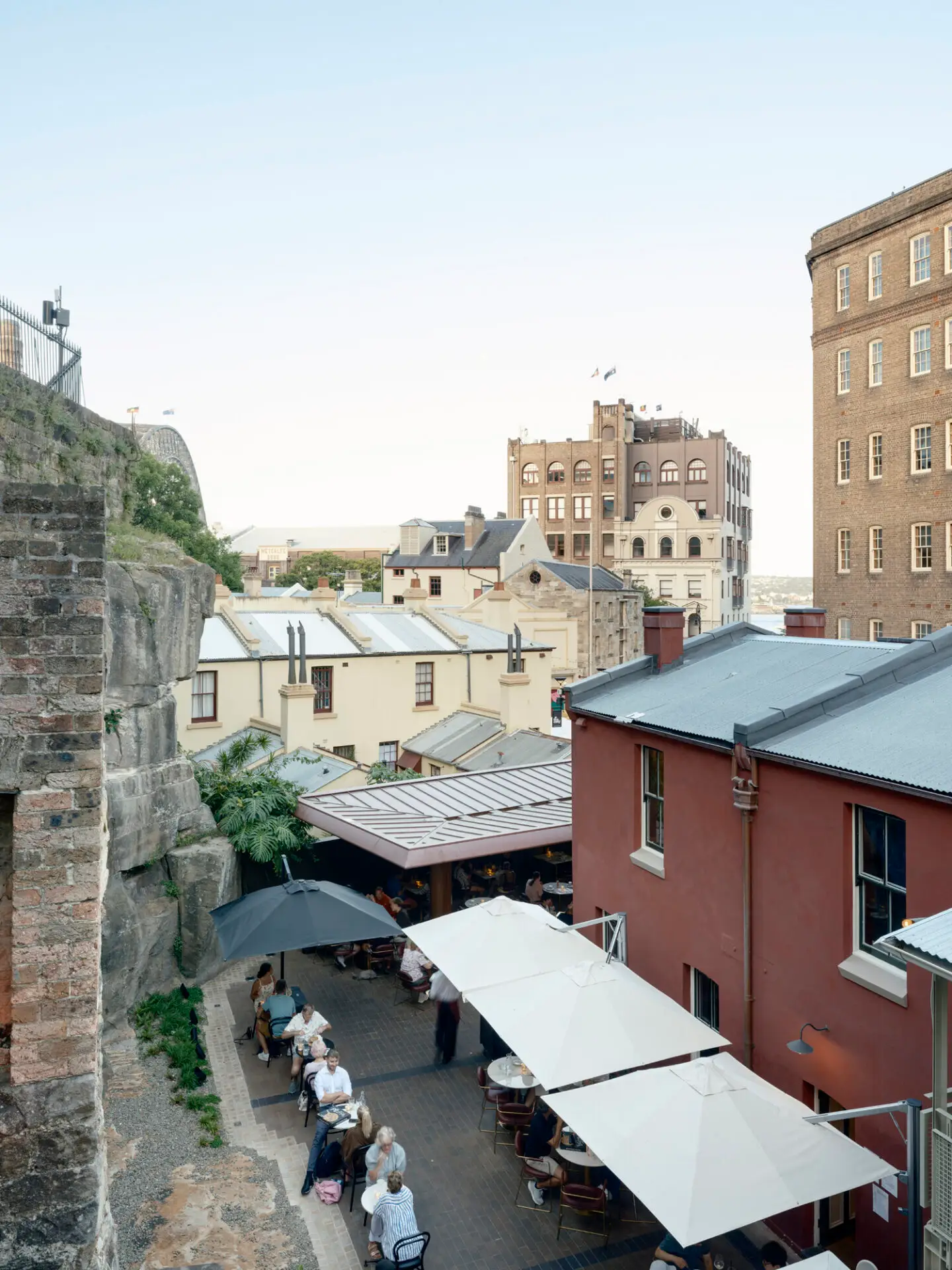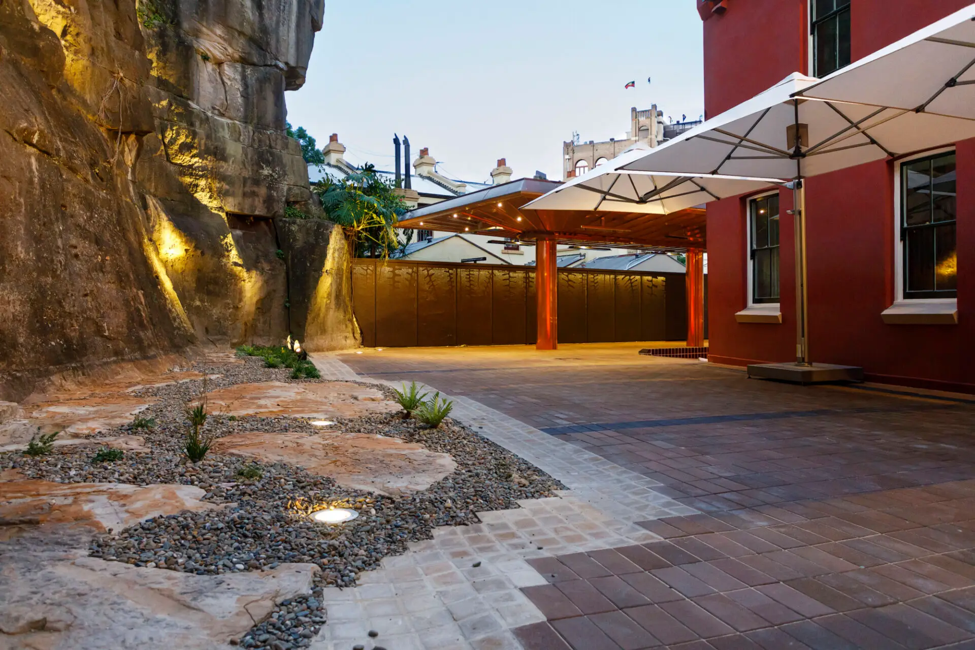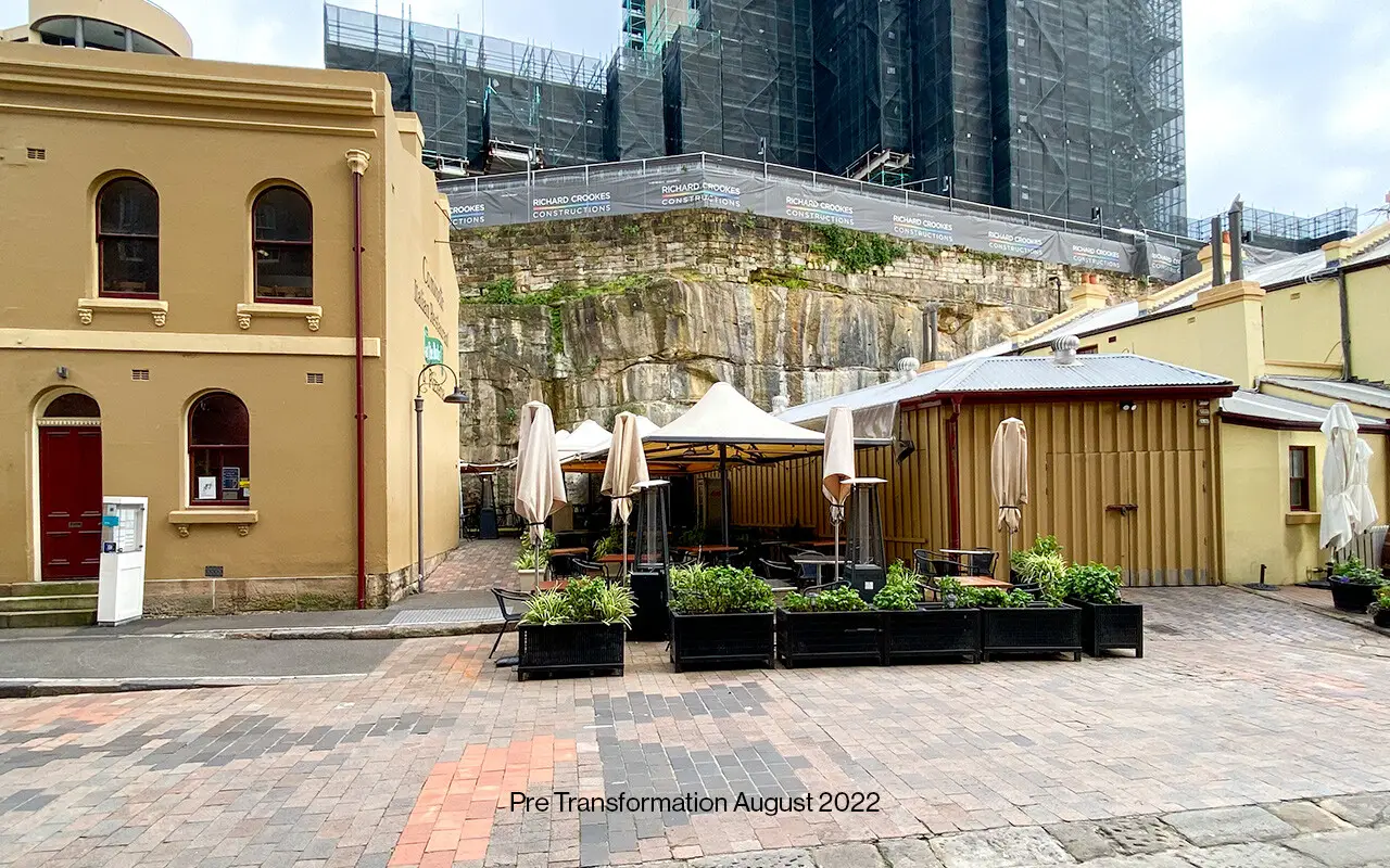 The design of the Argyle Terrace Courtyard has transformed how people experience The Rocks. Formerly cluttered and perceived as privatised, the courtyard now reads as a welcoming public space, with clutter removed, new landscaping, dining infrastructure, and a legible, accessible connection to the sandstone cutting. The design carefully balances contemporary use with the heritage sensitivities of the precinct, using refined detailing and high-quality materials to reinforce its character. It defines a clear outdoor dining zone, opens the possibility for a future sandstone walk, and creates a vibrant public space people want to explore and enjoy.