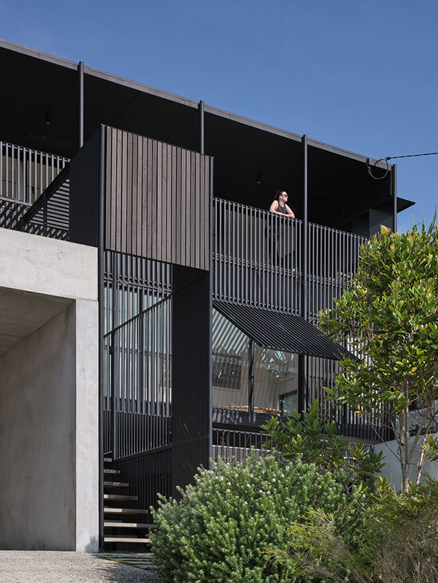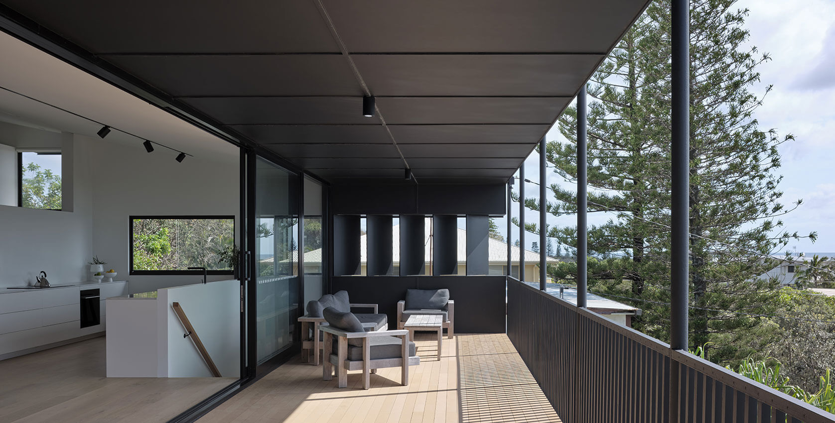 A wide verandah spanning the entire width of the long living room acts as a coastal ‘Aediculae’, from which one is immersed in the nearby Pacific Ocean panorama.