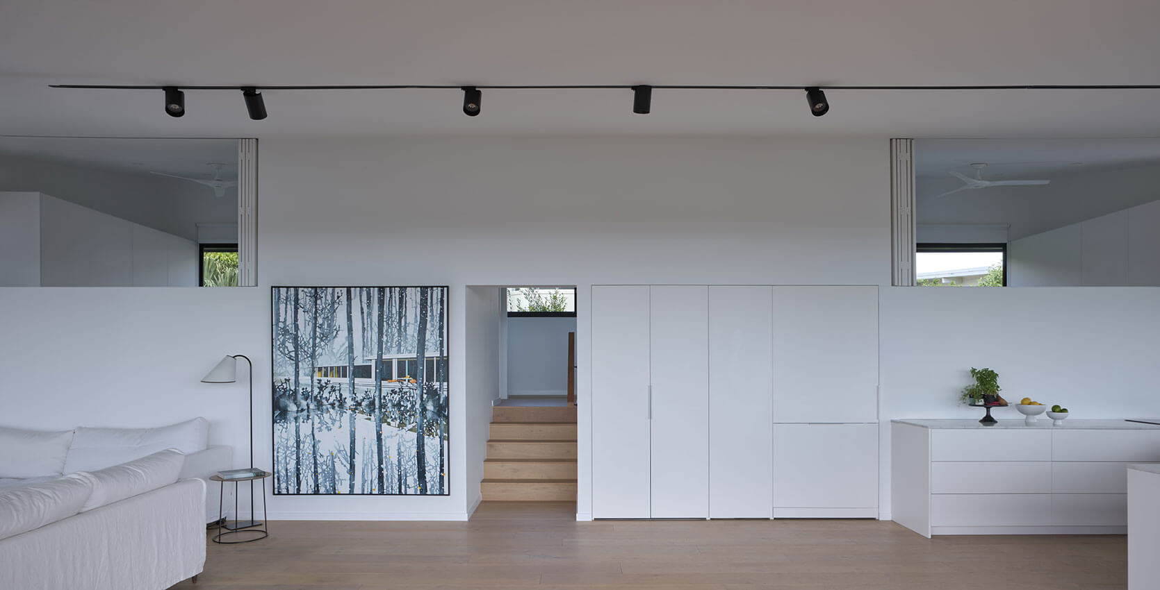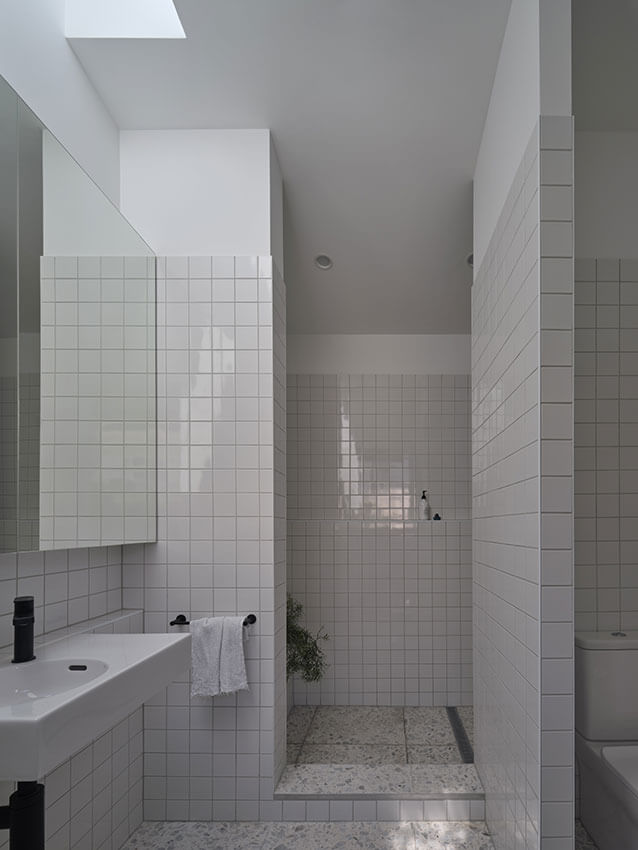 Internally, a split-level cross section registers the topography below, and yields suitable privacy for the intimate rooms within the compact plan. Large openings from the bedrooms privileges these terminal spaces with expanding views through the open-planned living room.