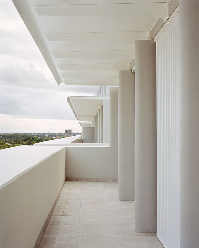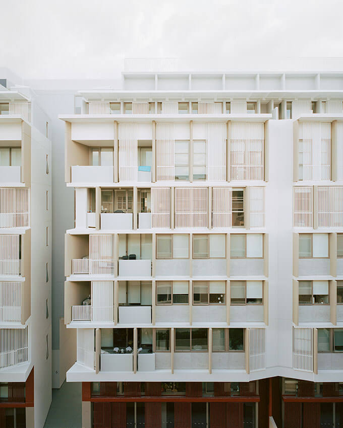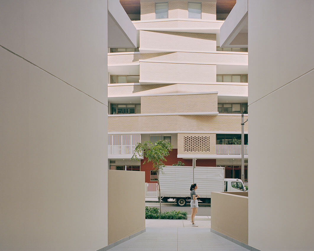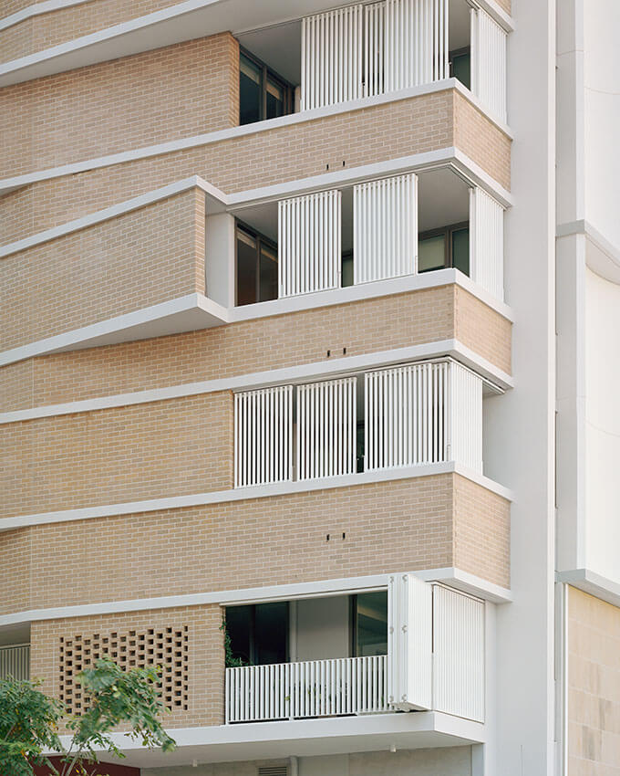 The building facades take on unique identities, with repetitive elements utilised to draw the eye to the length of the structures. The detailing of the screens, the angled bay windows, and the hit and miss bricks that create privacy and shadow play are all a standout.