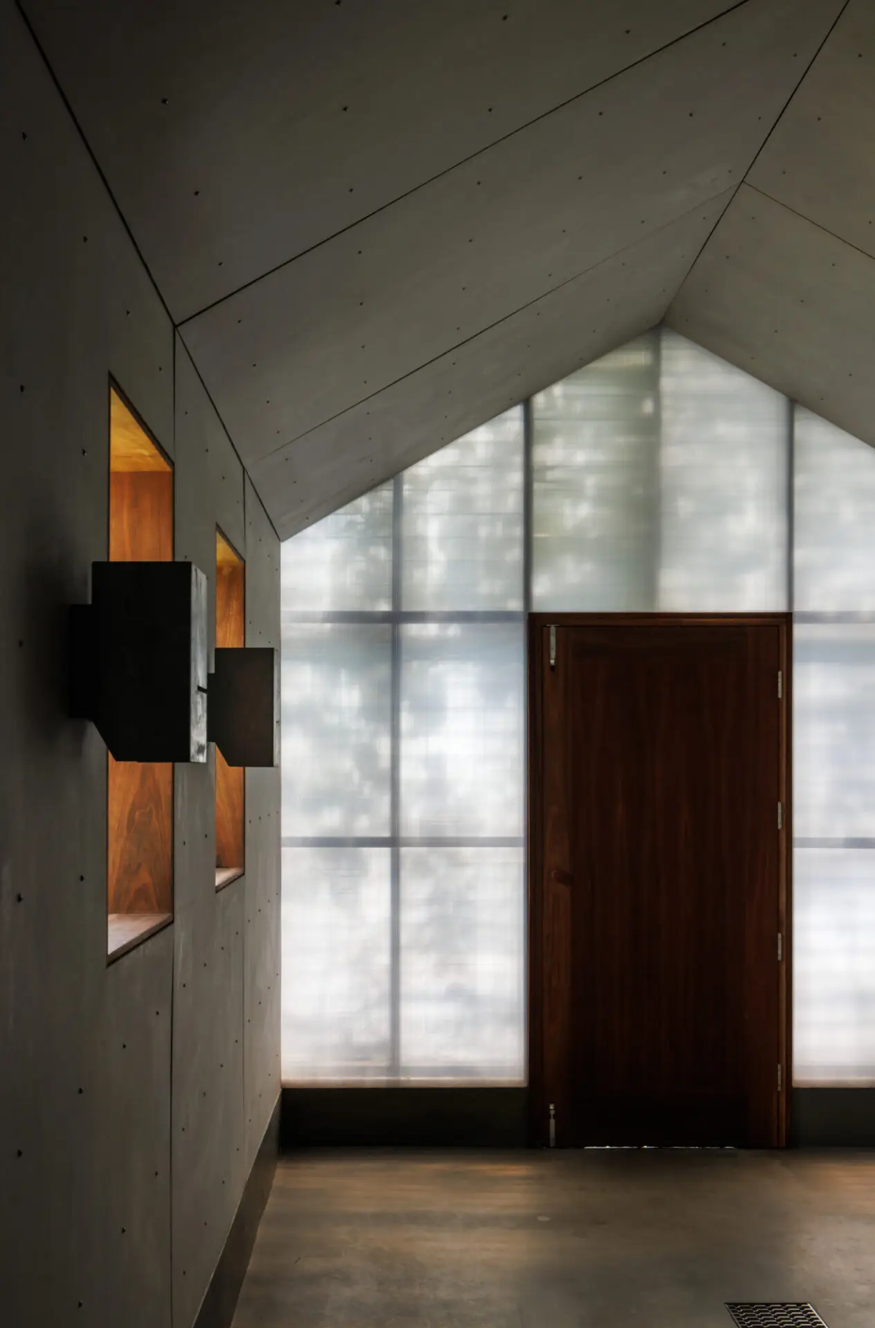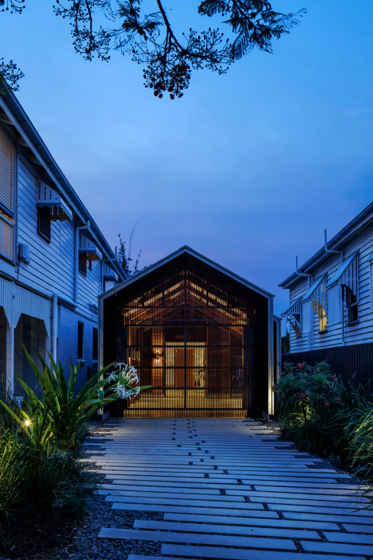 Designed by Osaka-based Atelier Luke, the project responds to the local ‘timber and tin’ vernacular of Brisbane through a refined palette of Australian hardwood and galvanised steel. A restrained, timber-screened frontage defers to the heritage streetscape, concealing a voluminous interior defined by a striking exposed timber portal frame.