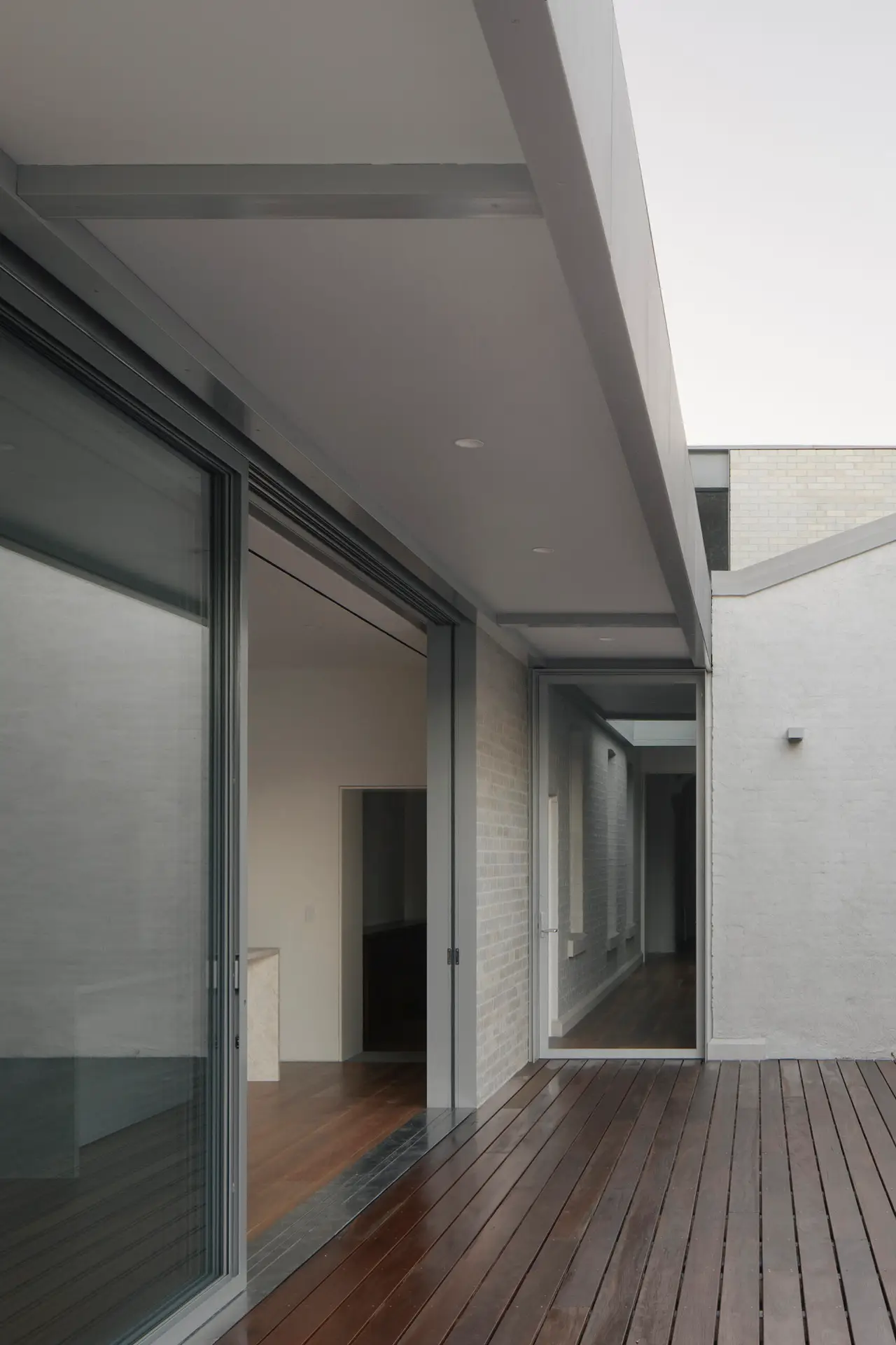 Through the concept of a continuous linear verandah, this 20 metre insertion is positioned centrally to bring light into the former dark center of the building via an integrated skylight, while providing shading to the new kitchen and living addition.