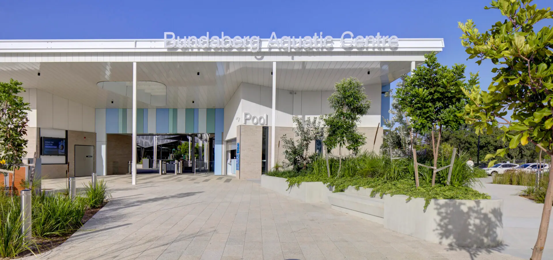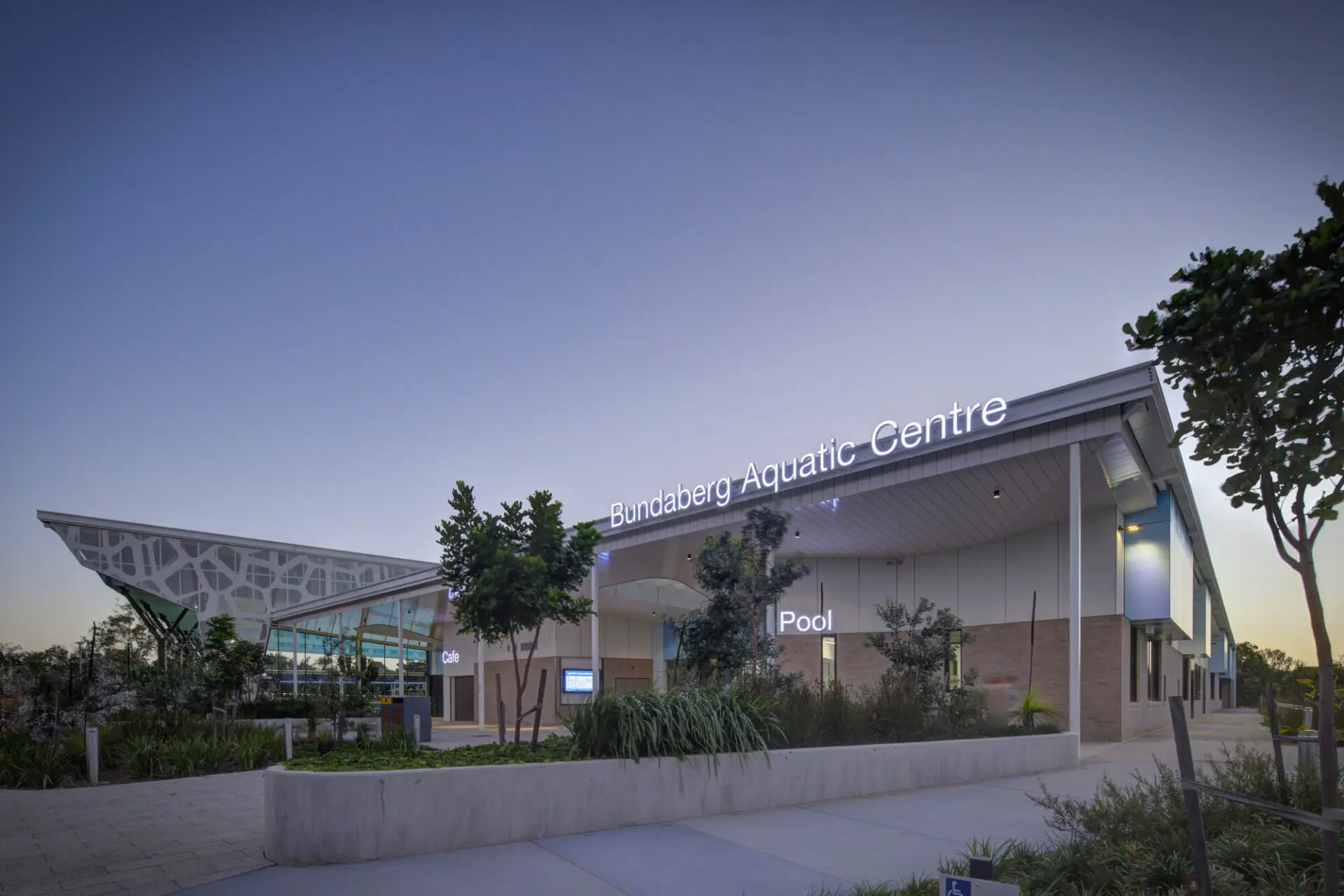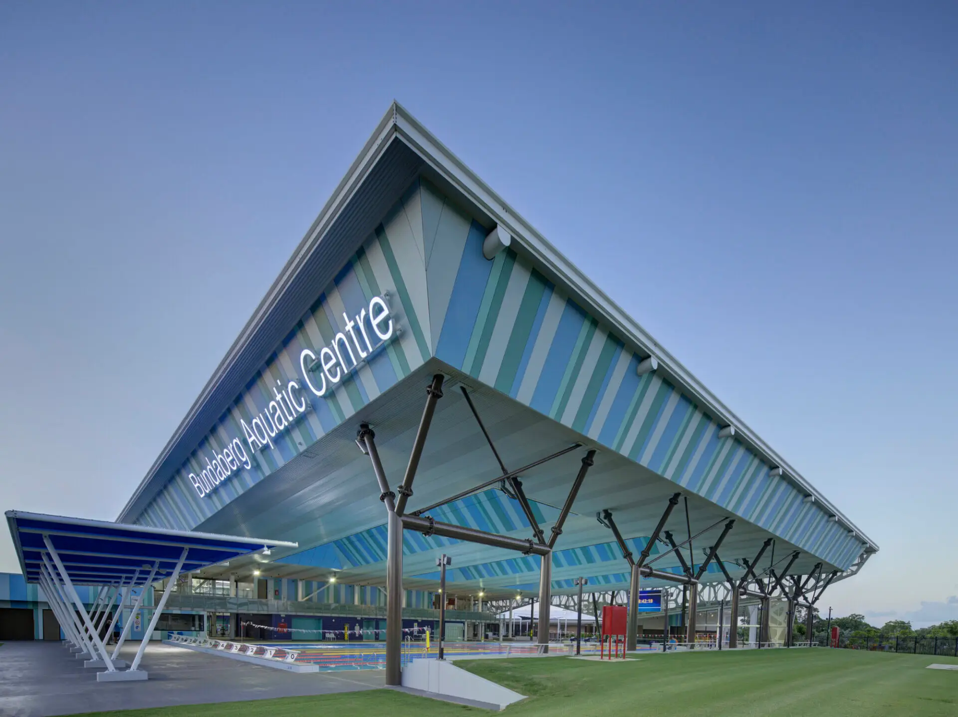 The Bundaberg Regional Aquatic Facility is for elite athlete training, learn to swim, remedial training and recovery for all community members. Designed for regional events, and as a national/ international training venue, it is designed to World Aquatics standards with 3 pools, gyms and multipurpose rooms. A covered roof, 50m ten lane pool (swimming, waterpolo, underwater hockey), a 25m 6 lane competition/training pool and a 25m warm water program pool for learn to swim, recovery, and recreational activities. All pools enjoy a high level of accessibility with ramps, lifts and hoist options. The design concept references the original Anzac Pool being highly visible to the community, and celebrating its purpose as a community asset. Taking design cues from the linear nature of lane swimming, the original site's showground pavilion structure, the original Anzac Pool change rooms and the region's geological volcanic history.