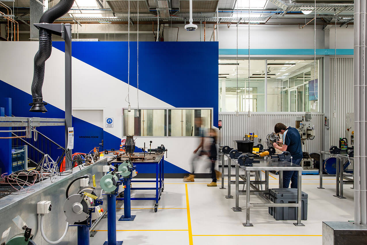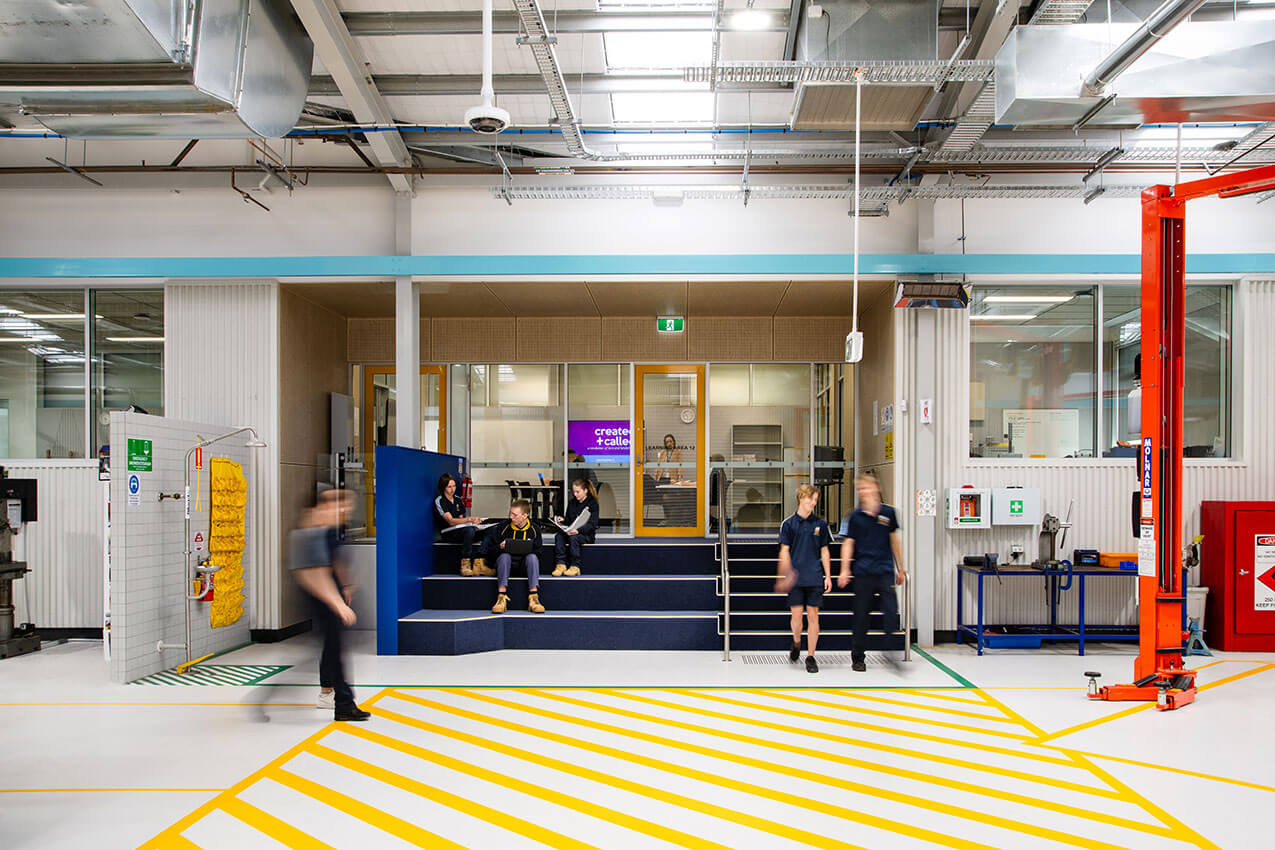 Informed by thorough consultation, GGA planned workshop layouts to optimise safety and process flows. Fulfilling the design philosophy of campus transparency, new acoustically separated classroom and staff spaces connect the workshop to rest of the campus both physically and visually. Colour and materiality unify the spaces and provide a fresh approach to the typical workshop typology.