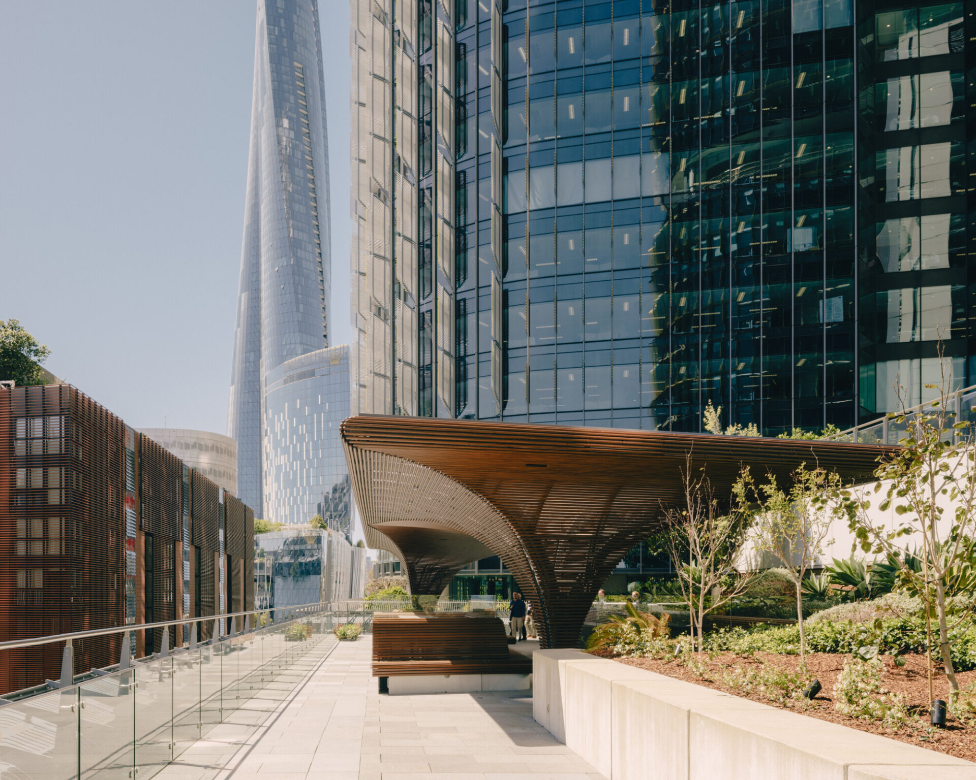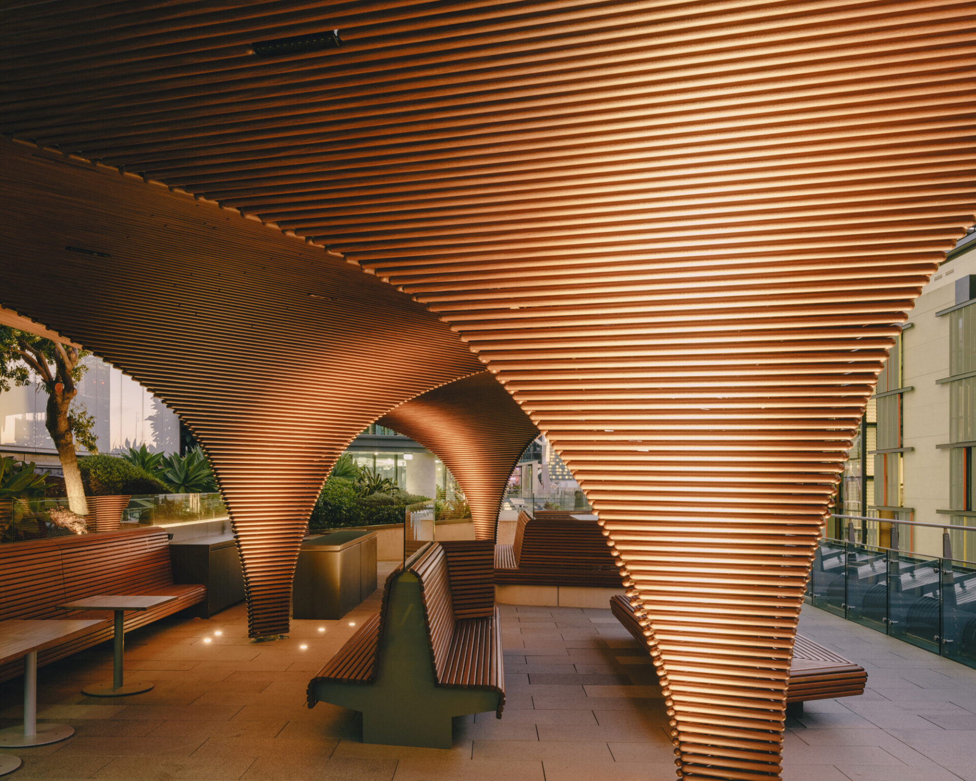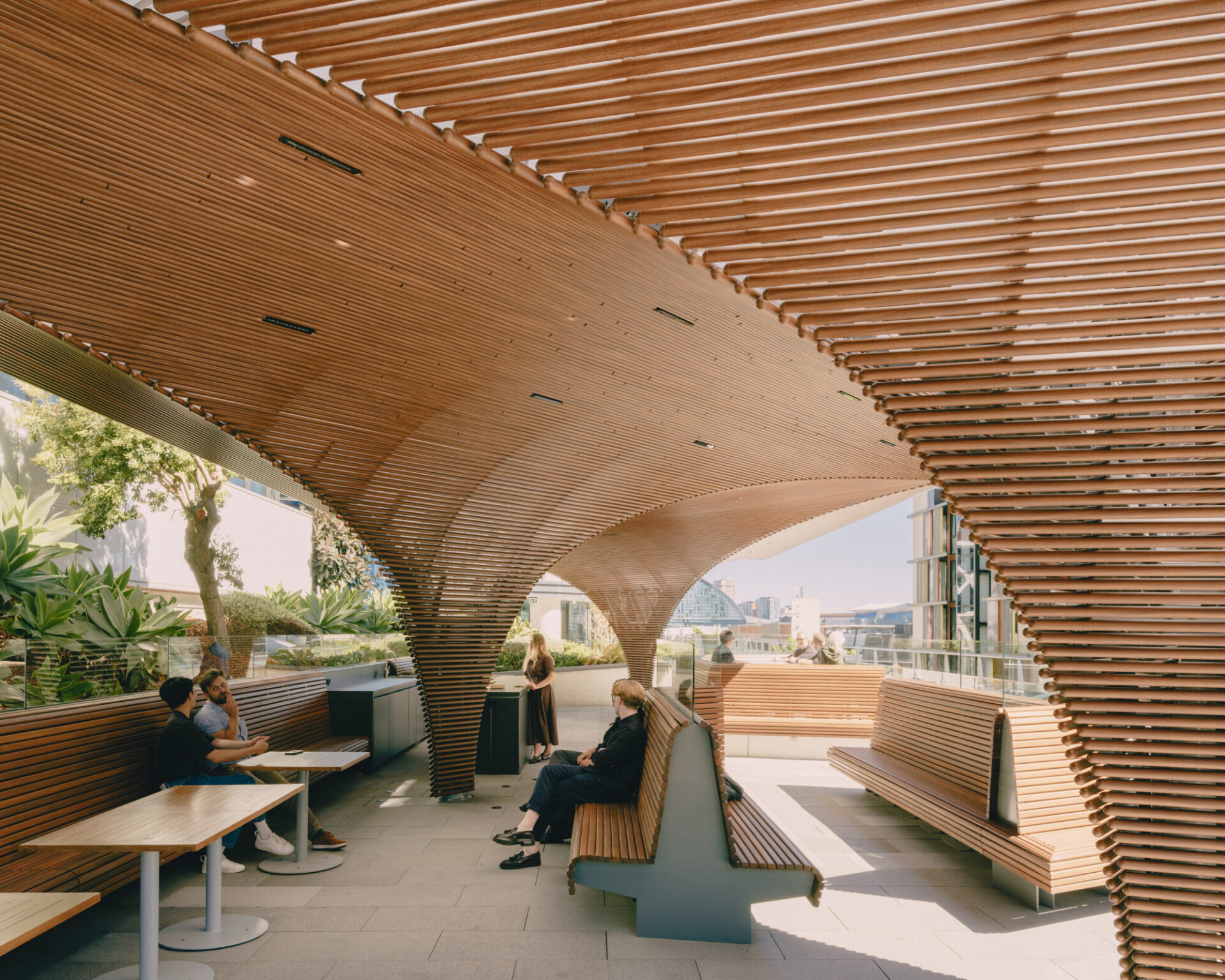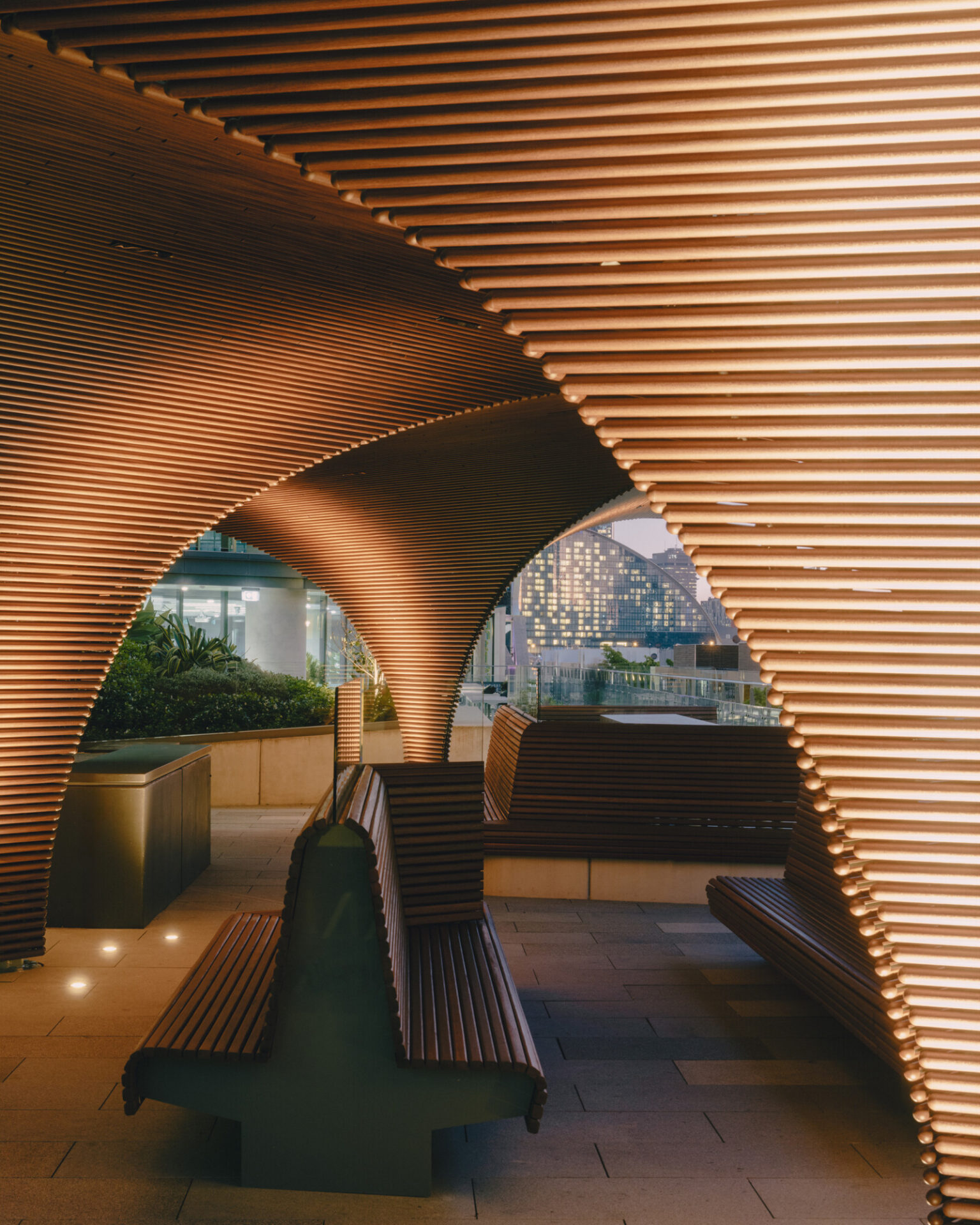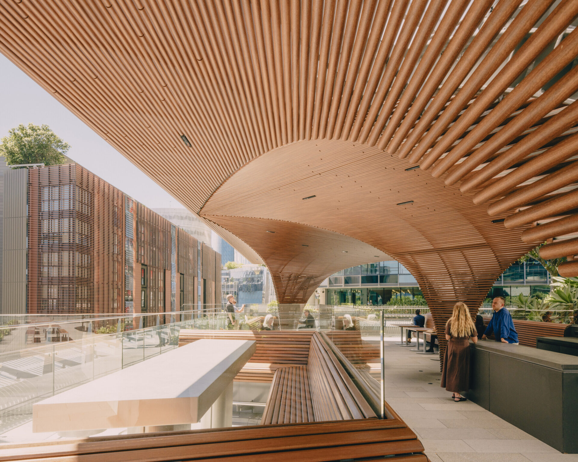 The Carpe Diem Rooftop Pavilion is a 200sqm sculptural addition to the landscaped terrace of International Towers Sydney Tower 3 in Barangaroo. Conceived as a free-form architectural artwork, the freestanding structure transforms an underutilised podium roof into a flexible, year-round destination for tenants and visitors. Beneath a fluid, floating canopy wrapped in a finely detailed aluminium screen with a timber finish, the pavilion provides weather protection and a versatile setting for informal work, gatherings and curated events.