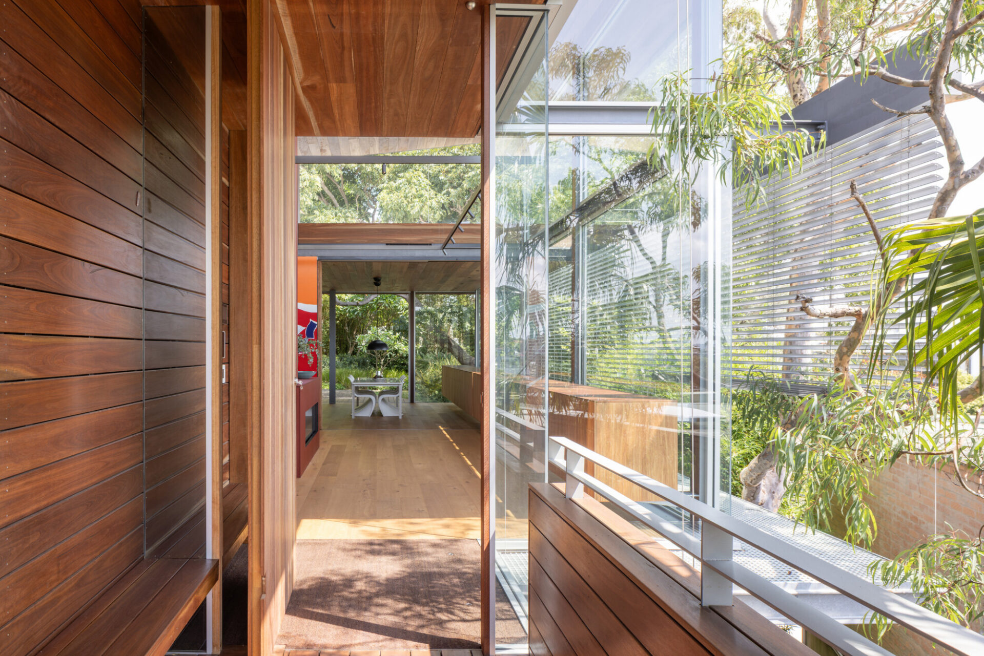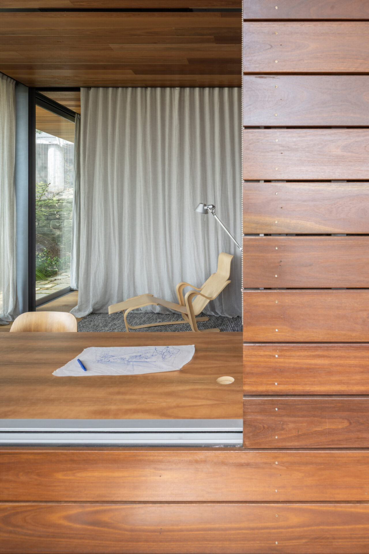 The house is a continuous flow of connected spaces allowing circulation between rooms and to the “magic garden” of tall grasses and native bush.
