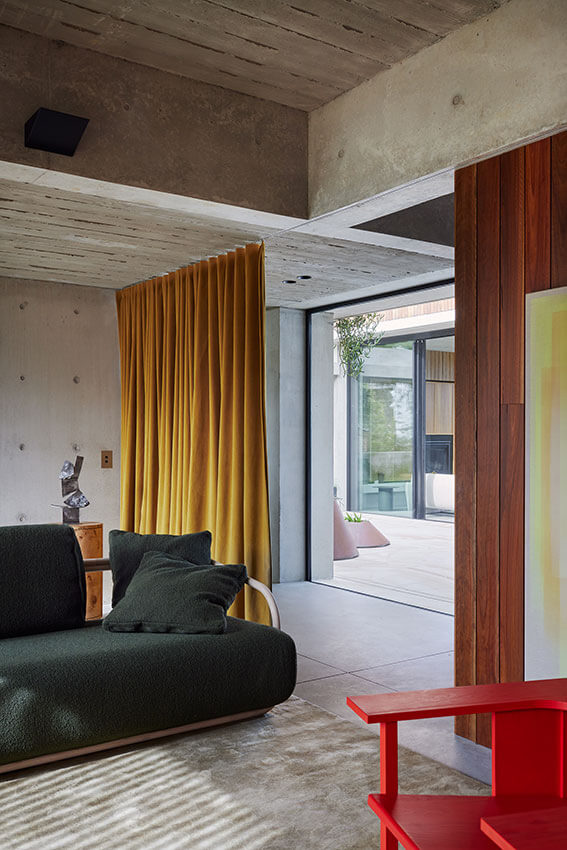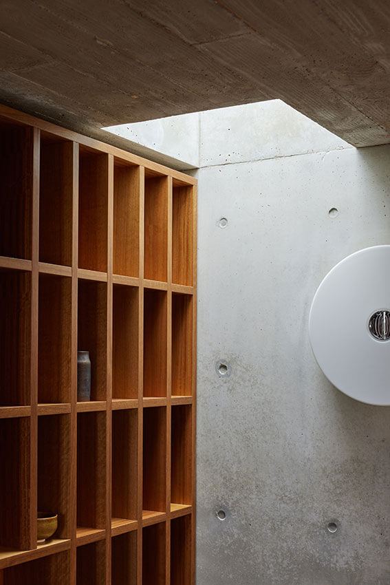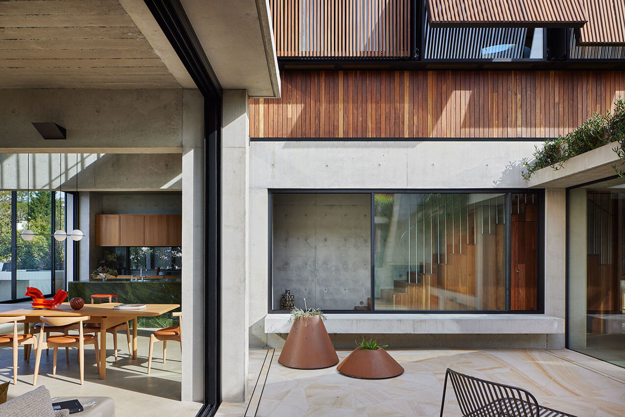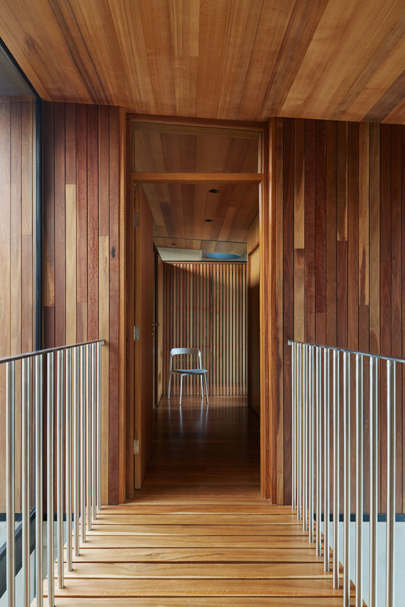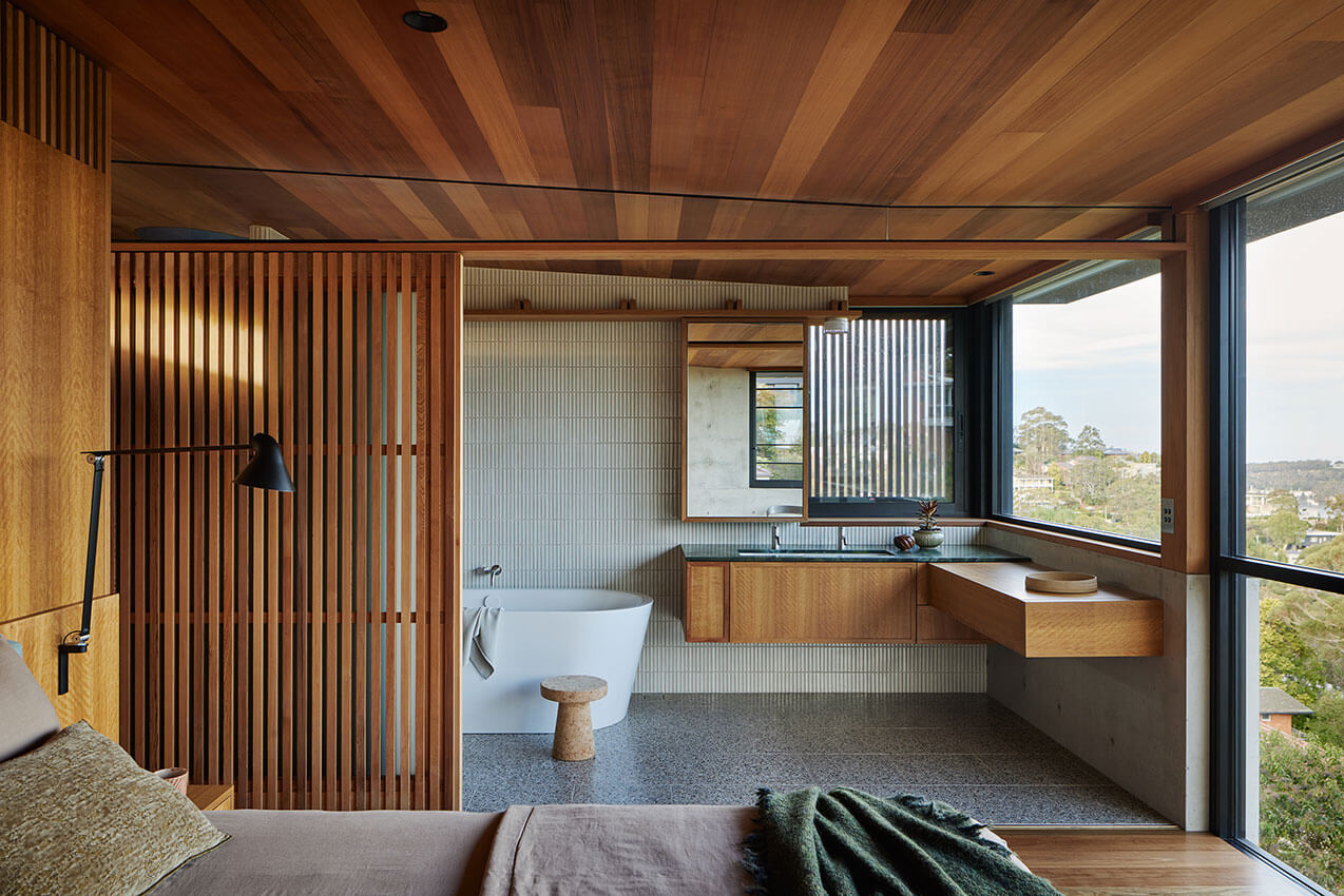 Complementing this alliance of architecture and landscape, is the material palette, selected for its inherent beauty, timelessness, and propensity to echo midcentury modernism. The house is organised into three distinct sections and spatial and material variegations applied across the levels accord with their function, heightening the experience of living within the landscape where shelter and refuge, exposure and prospect are paramount.