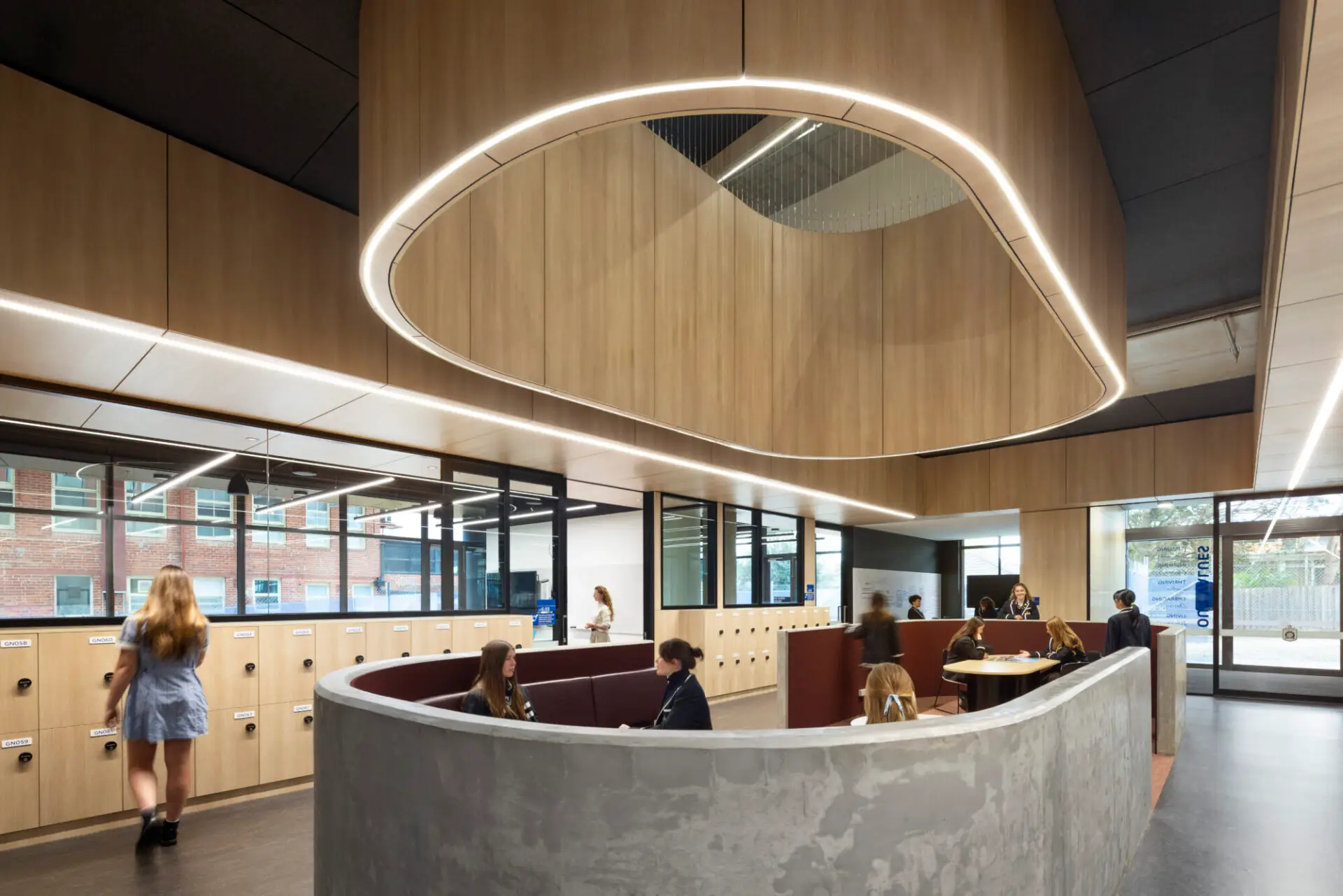 The new senior school building transforms the senior campus into a vibrant heart of community and wellbeing, guided by the school’s Mind for Life philosophy and Strategy 2031. Inspired by a river metaphor, its spaces support “tidal” patterns of gathering, exploration, and regrouping, anchored by a light‑filled Learning Living Room, atrium and a series of perches that make learning visible and social for all. A welcoming, transparent ground floor and landscaped terraces extend education into nature, creating a benchmark for wellbeing‑centred education environments. The five‑storey form is softened through curves, setbacks, and warm brick tones that respect neighbourhood context while unifying the campus. Supporting 950 students and 50 staff, the building integrates adaptable learning precincts, STEM hubs, and a 350‑person multipurpose venue. Delivered within an $83.4M budget and targeting 6 Star Green Star and WELL Gold, the project blends technical excellence, sustainability, and inclusive design to elevate everyday student experience.