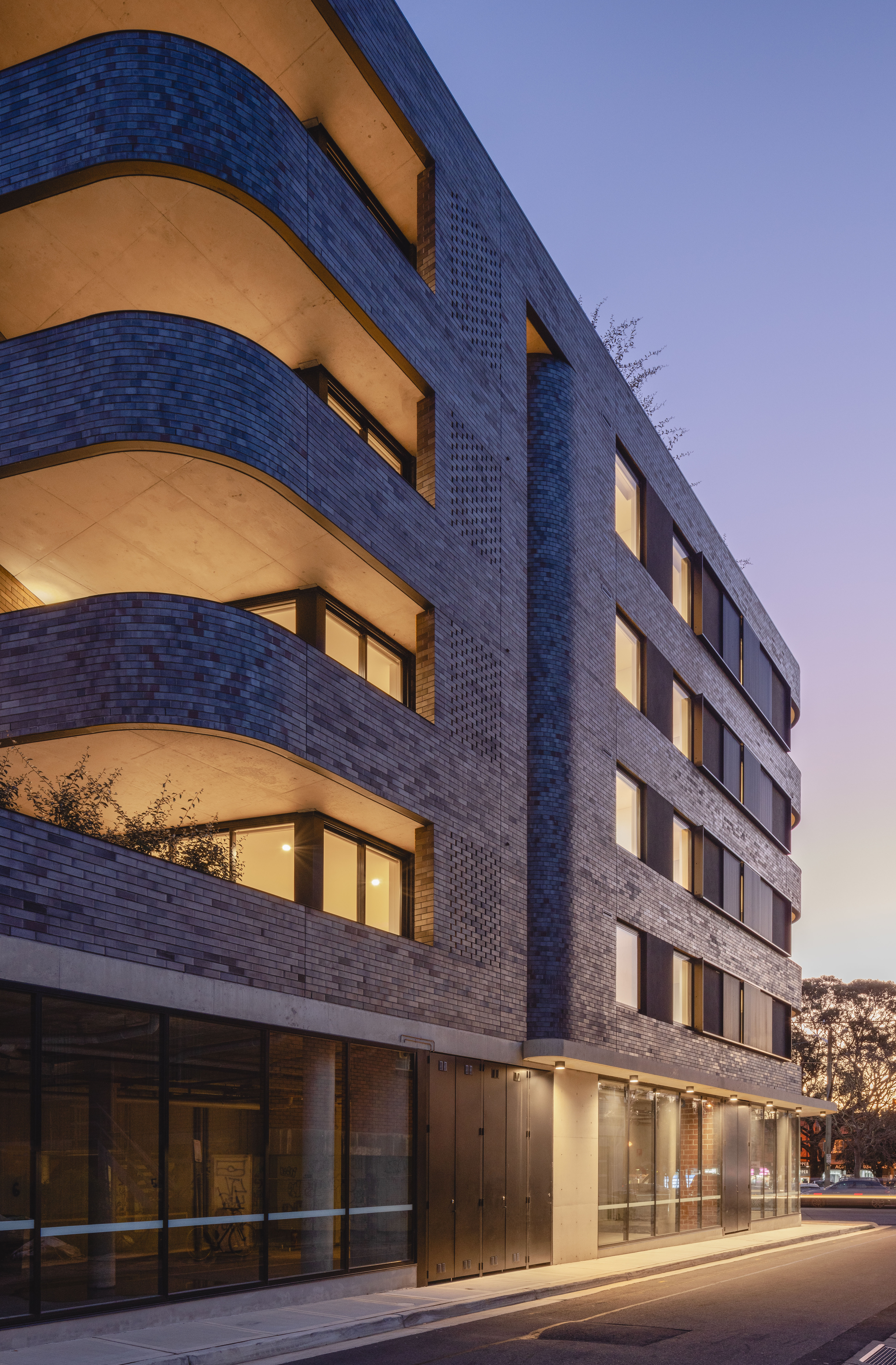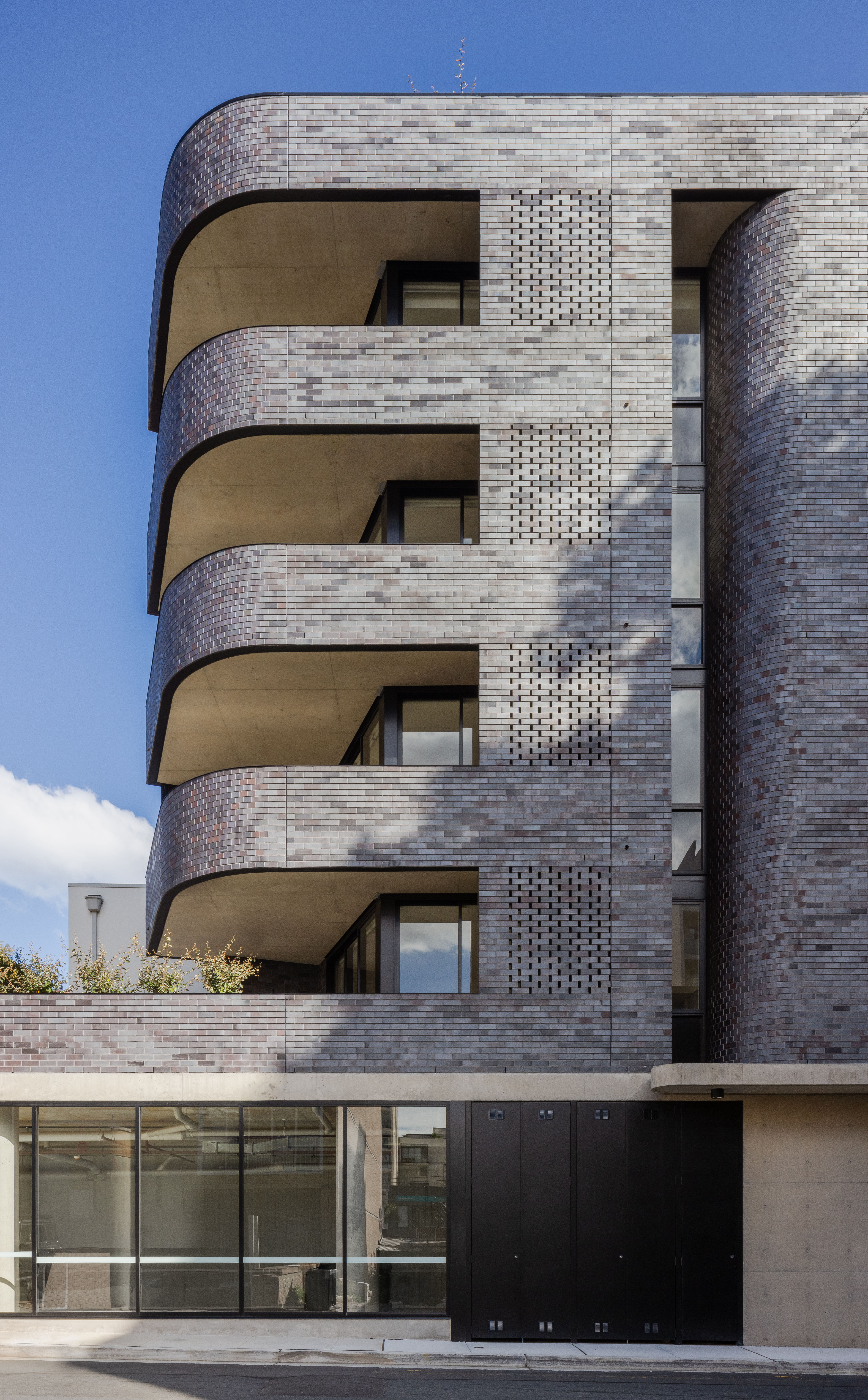 The focus on robust matierals and stong architectural resolution anchors the thin tall facade to its context and activates the laneway as it gentely turns the corner of the site.
