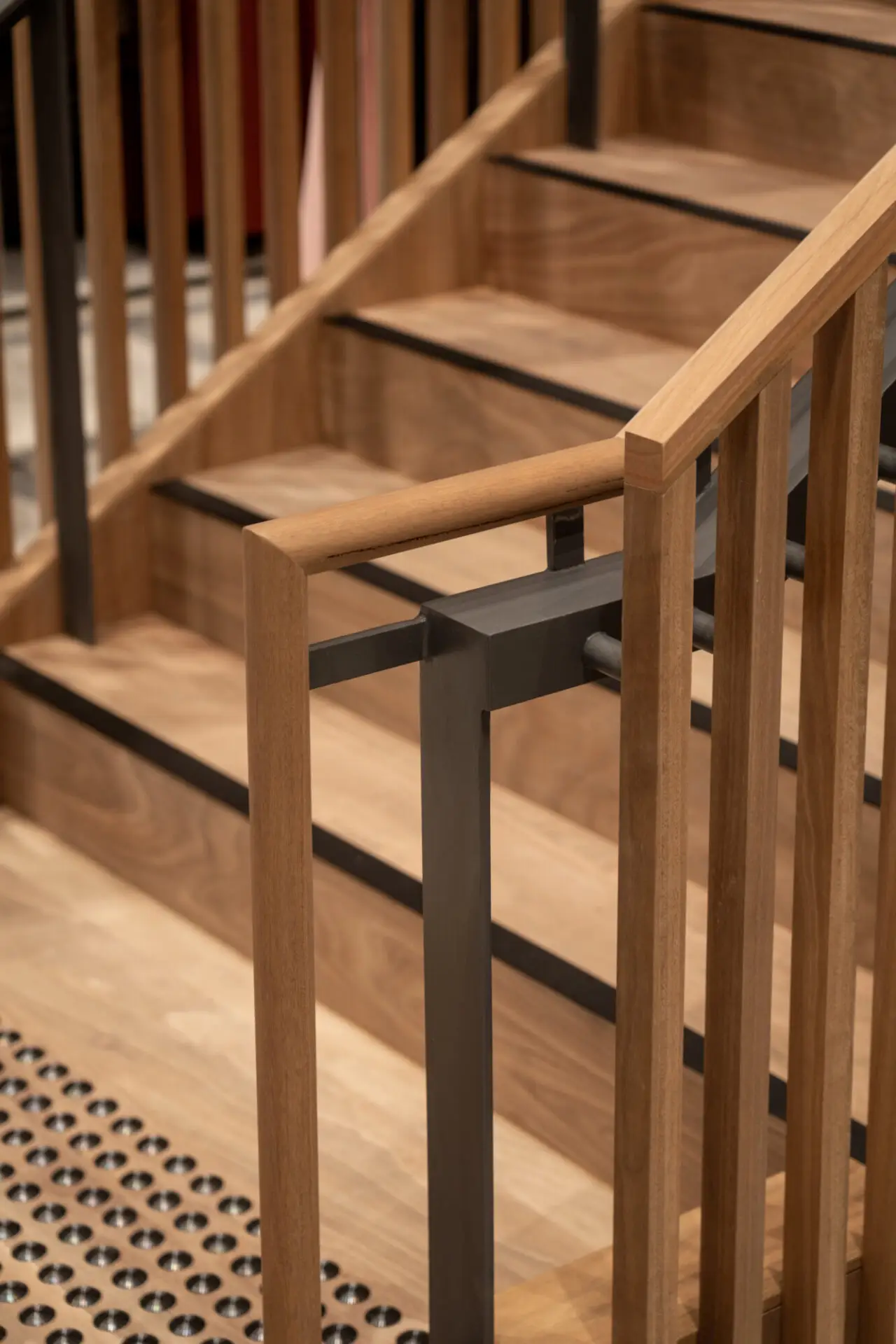 Drawing inspiration from the warm, earthy tones of the nearby Kangaroo Point cliffs, the interior establishes a dialogue between past and present. Original bank counters have been retained and carefully integrated, while timber is used throughout as a unifying material. A timber batten staircase connects the ground floor and mezzanine, enhancing circulation and spatial clarity.