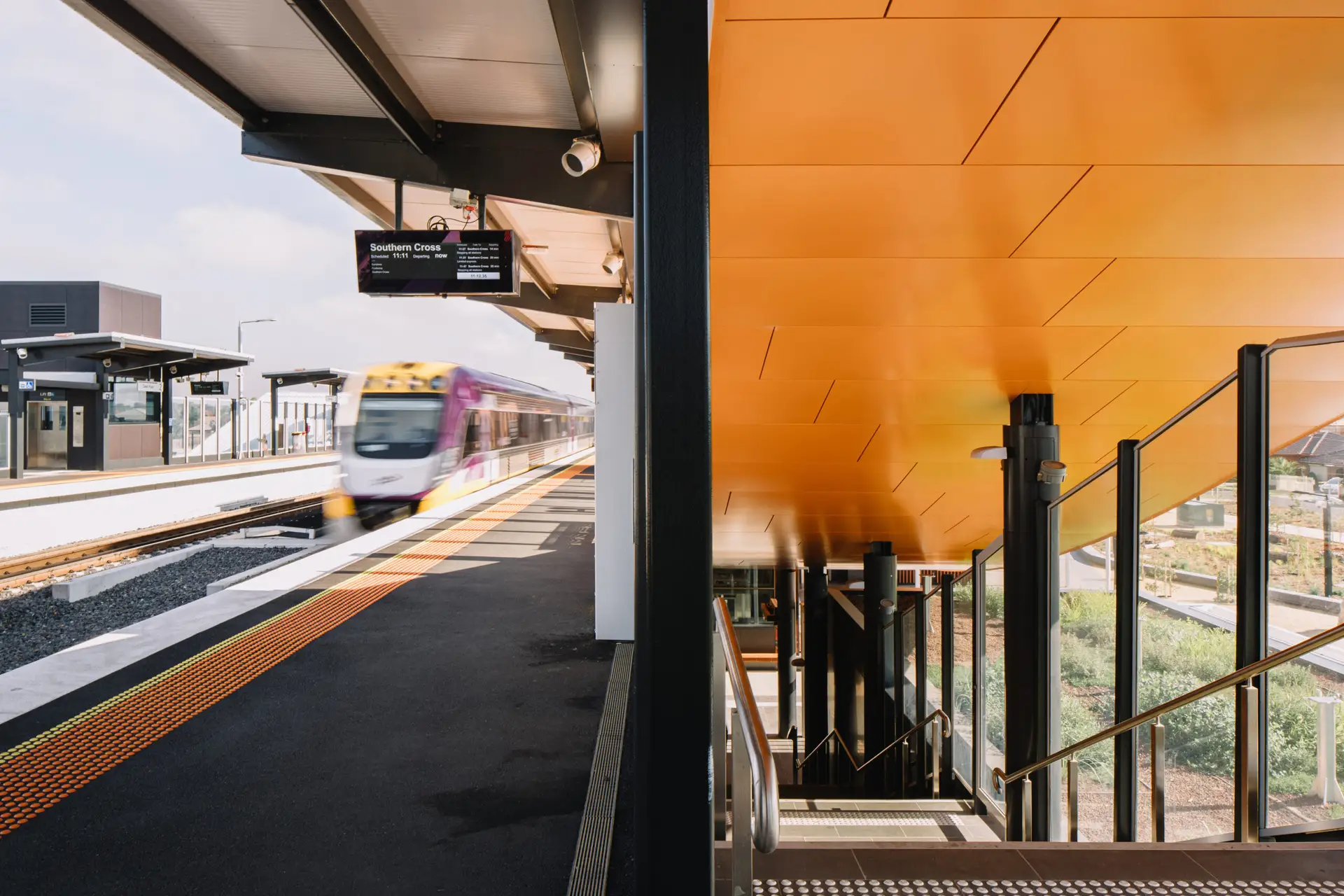 Part of the Mount Derrimut Road Level Crossing Removal project delivered by the Western Program Alliance (WPA), Deer Park Station was co-designed with First Nations consultants, Balert Mura, Hassell (landscape), and Traditional Owners.