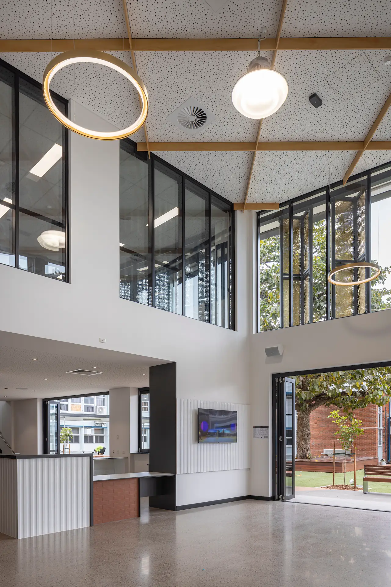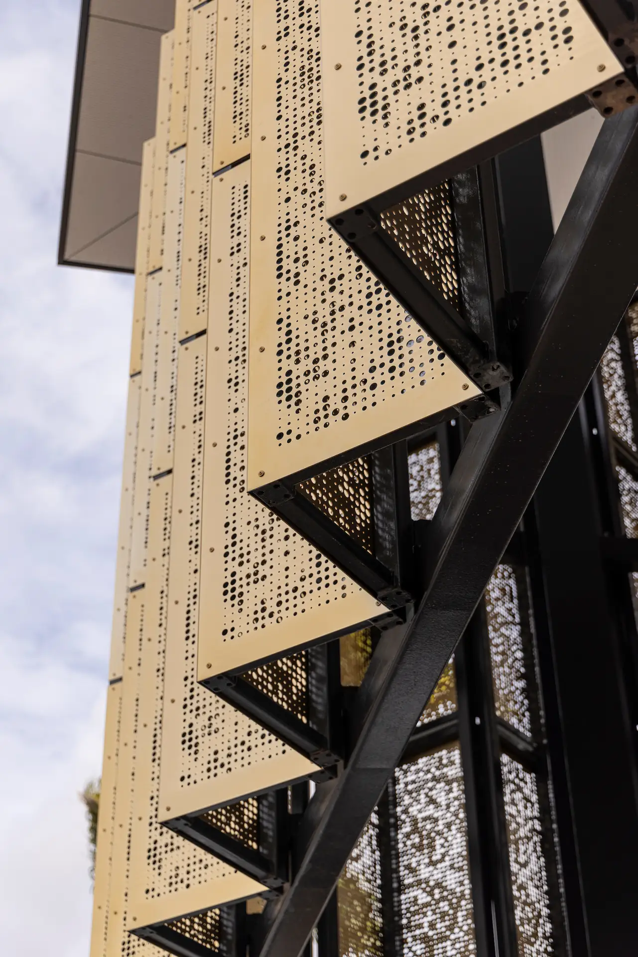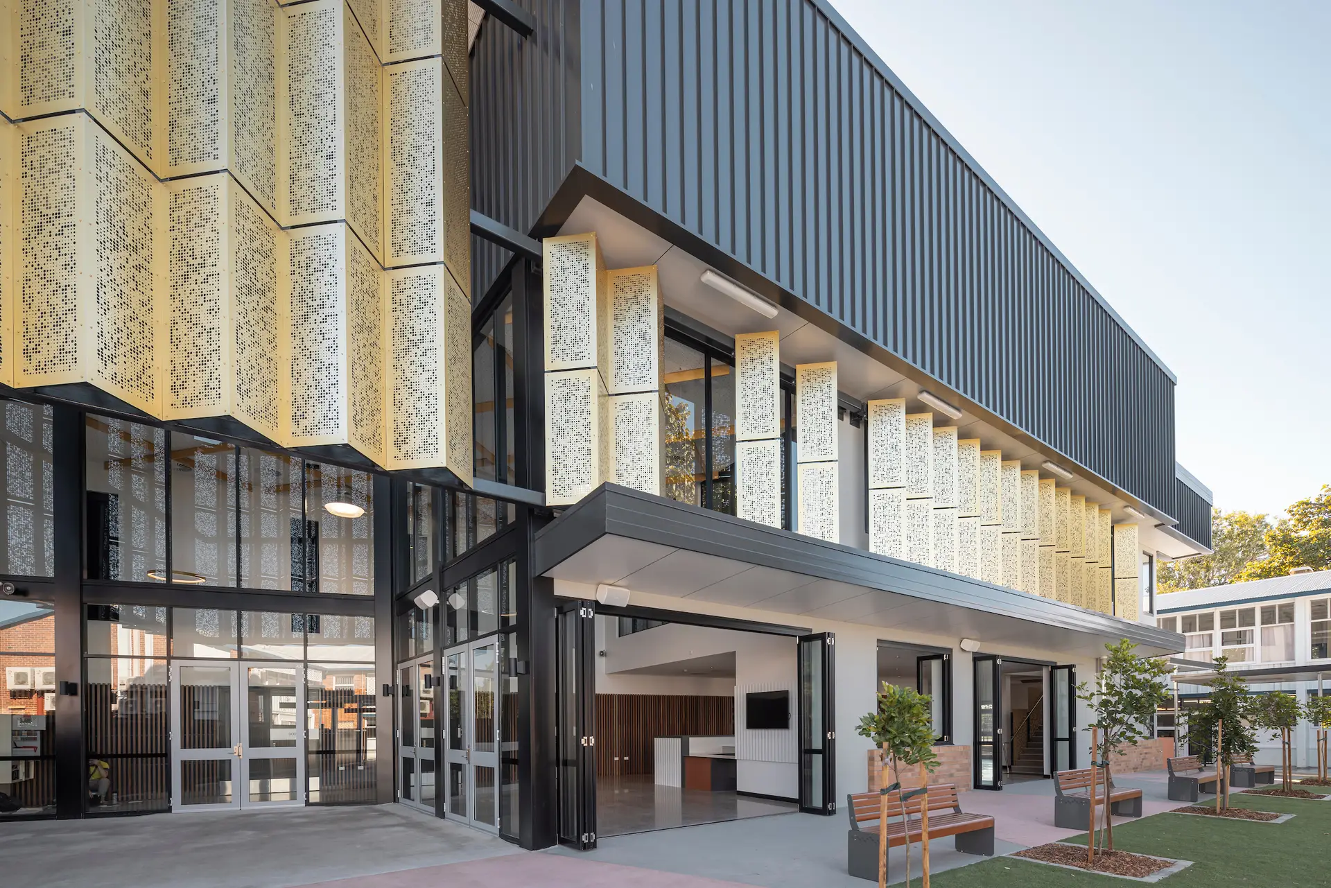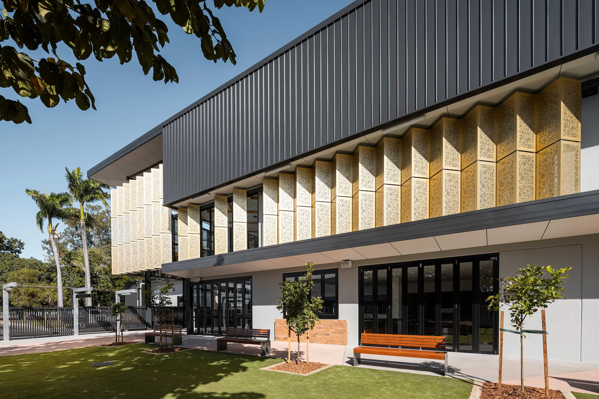 A carefully curated palette of materials including brick, concrete, profiled metal sheeting and gold sun screening responds to immediate civic context and broader climatic conditions of tropical North Queensland.