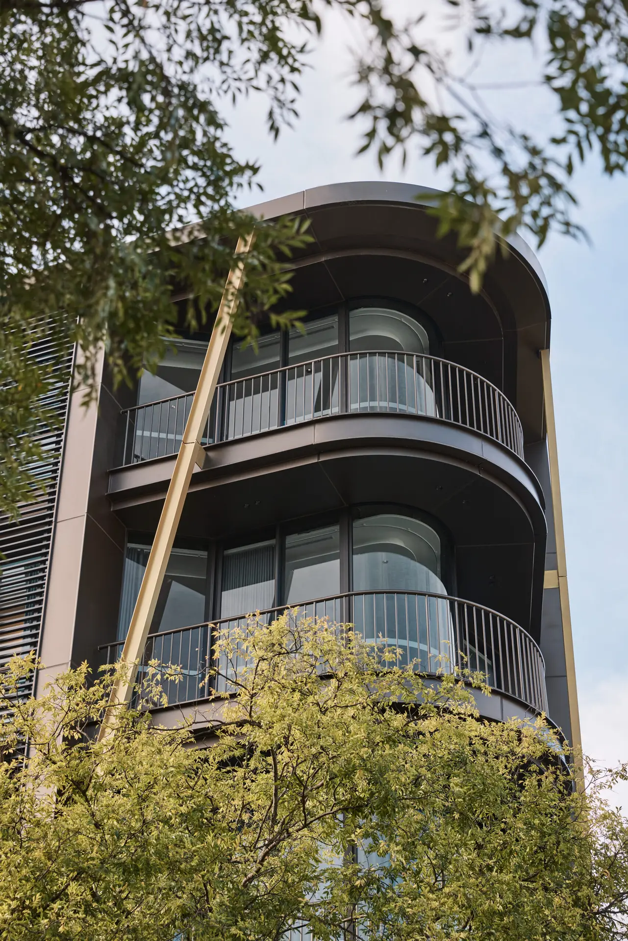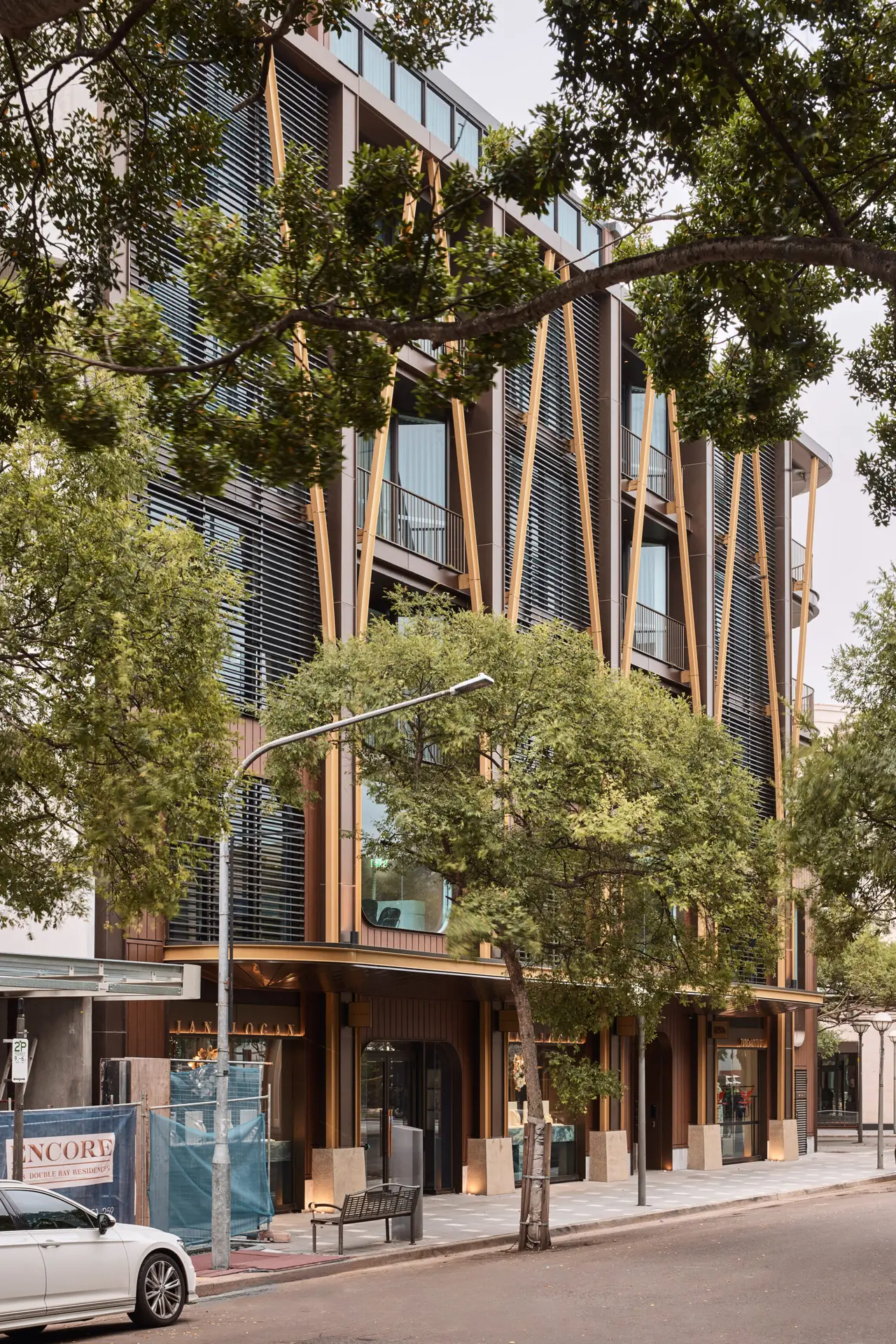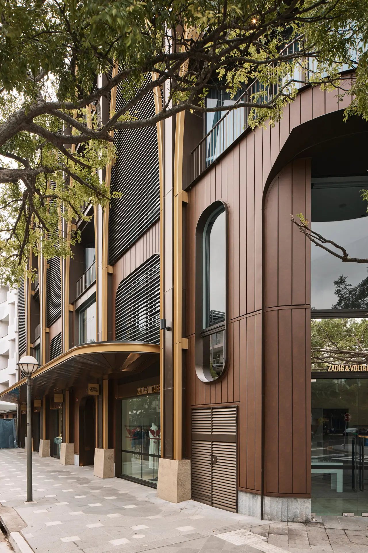 Inspired by the surrounding Chinese elm trees, the façade’s tall arches and warm material palette create a dynamic interplay of light and shadow, seamlessly blending with the streetscape. The design of the façade also prioritizes natural light and ventilation, with operable windows and a louvred façade system enhancing energy efficiency.