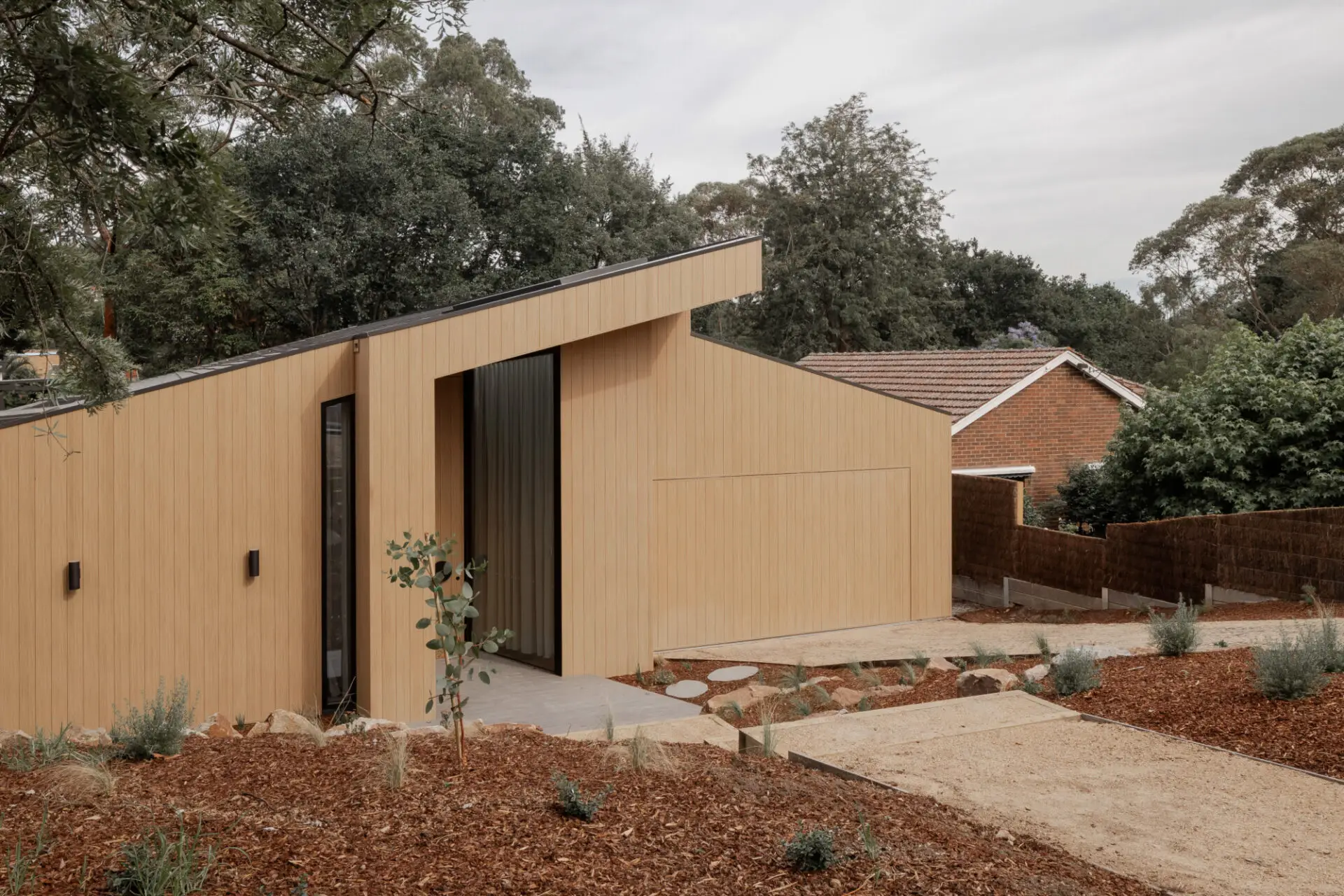 Eaglemont Modern House is a contemporary family residence located beside the Glenard Drive Reserve within Melbourne’s historic Glenard Estate. Designed for a professional couple and their three young sons, the home responds sensitively to its sloping site and garden-suburb context through a sculpted folded roof form that steps with the terrain.