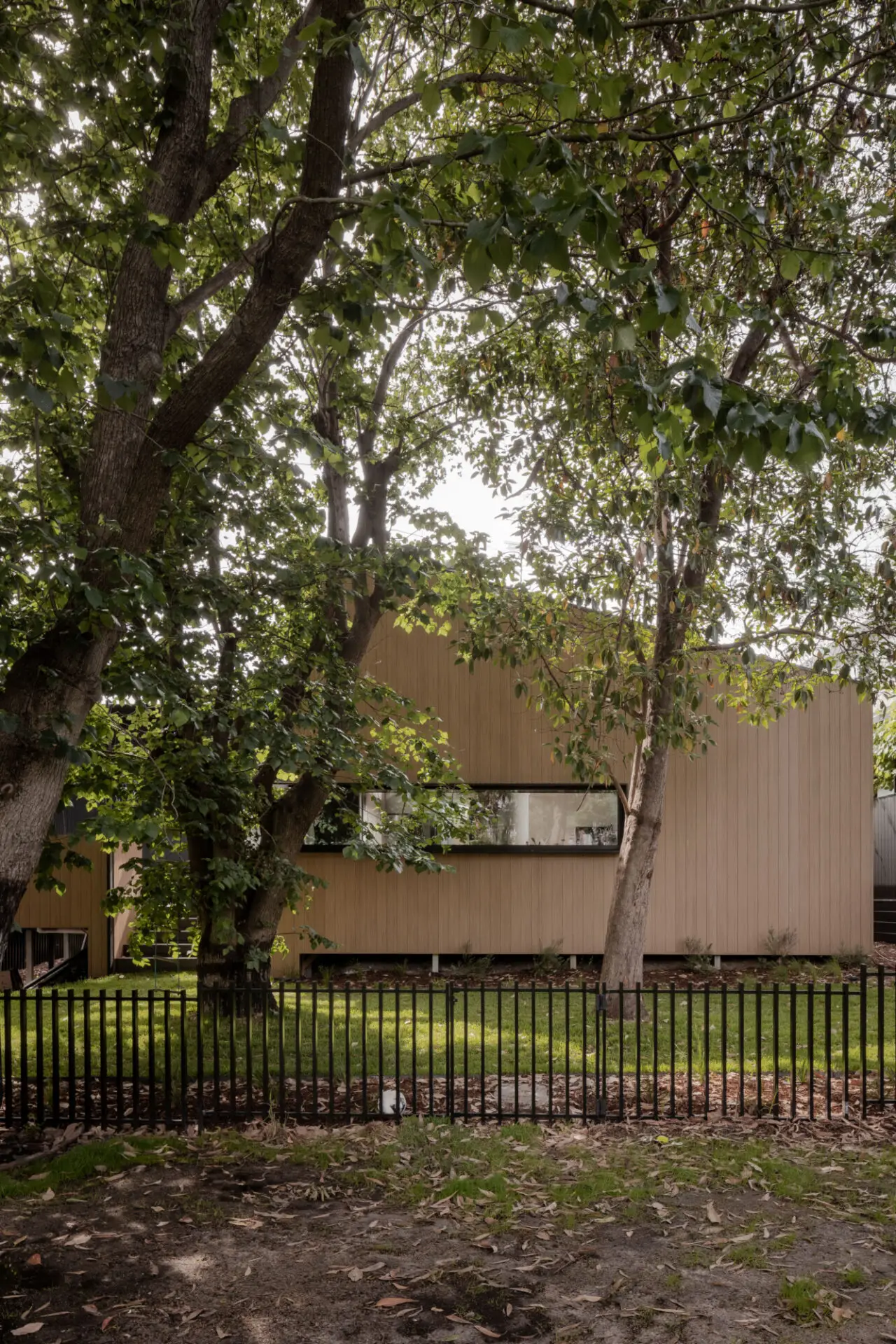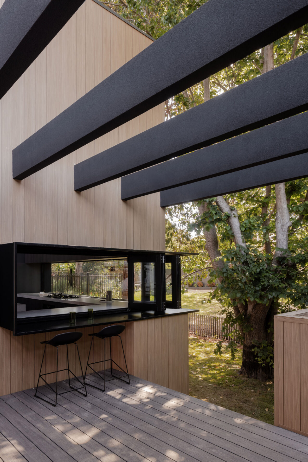 North-facing living spaces, sloped ceilings and carefully framed glazing draw soft natural light deep into the home while maintaining privacy from the street. A restrained material palette of Knotwood aluminium timber cladding and black steel detailing balances warmth with durability, creating a low-maintenance and enduring façade.
