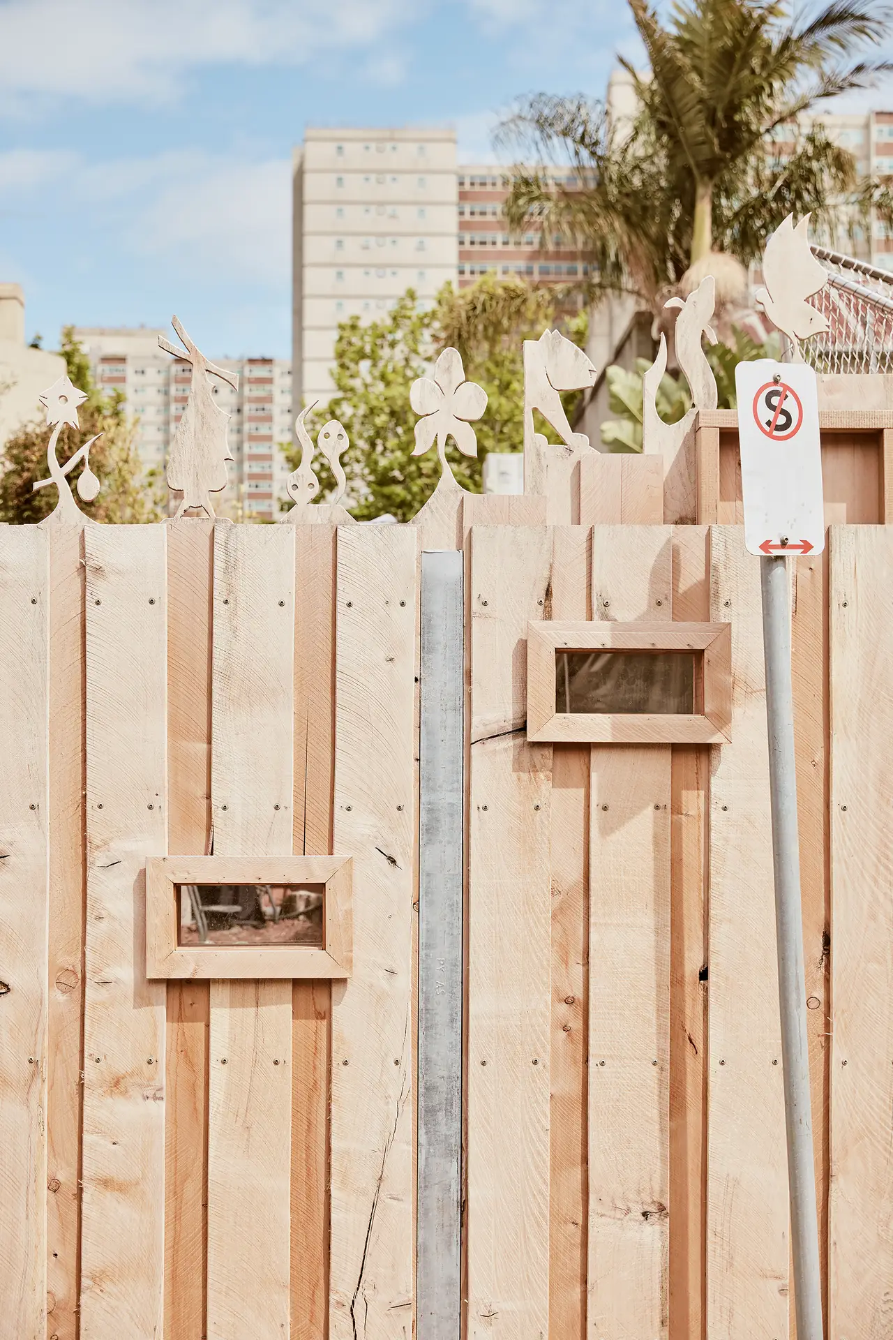 A stainless steel ‘trunk’ of expanded mesh supports raised platforms of steel and timber, connected by a timber post-and-beam structure. It engages with the new adjacent fence, featuring viewing windows and decorative finials representing Bundjil and the seven Wurundjeri seasons.
