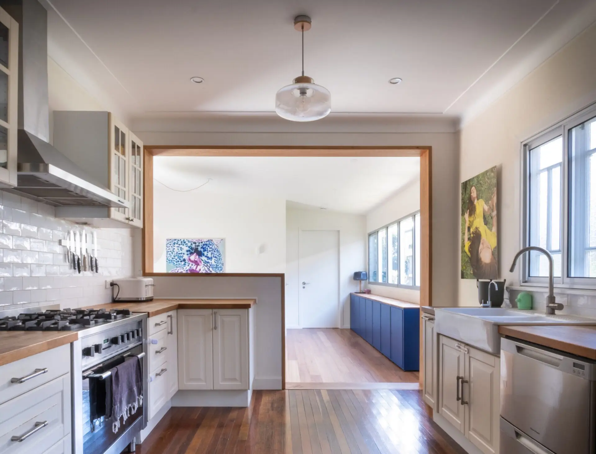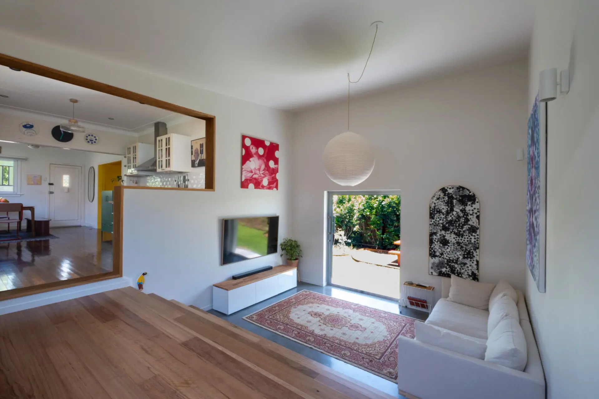 The planning redescribes the arrival sequence, entering via a sunken lounge at ground level. A bleacher stair connects to a new bedroom and the existing house. Social spaces are brought to the centre, allowing bedrooms (new and old) to retreat to the edges. It offers new ways of living and exhibiting art, described as flexible and intuitive by the owners.  Â