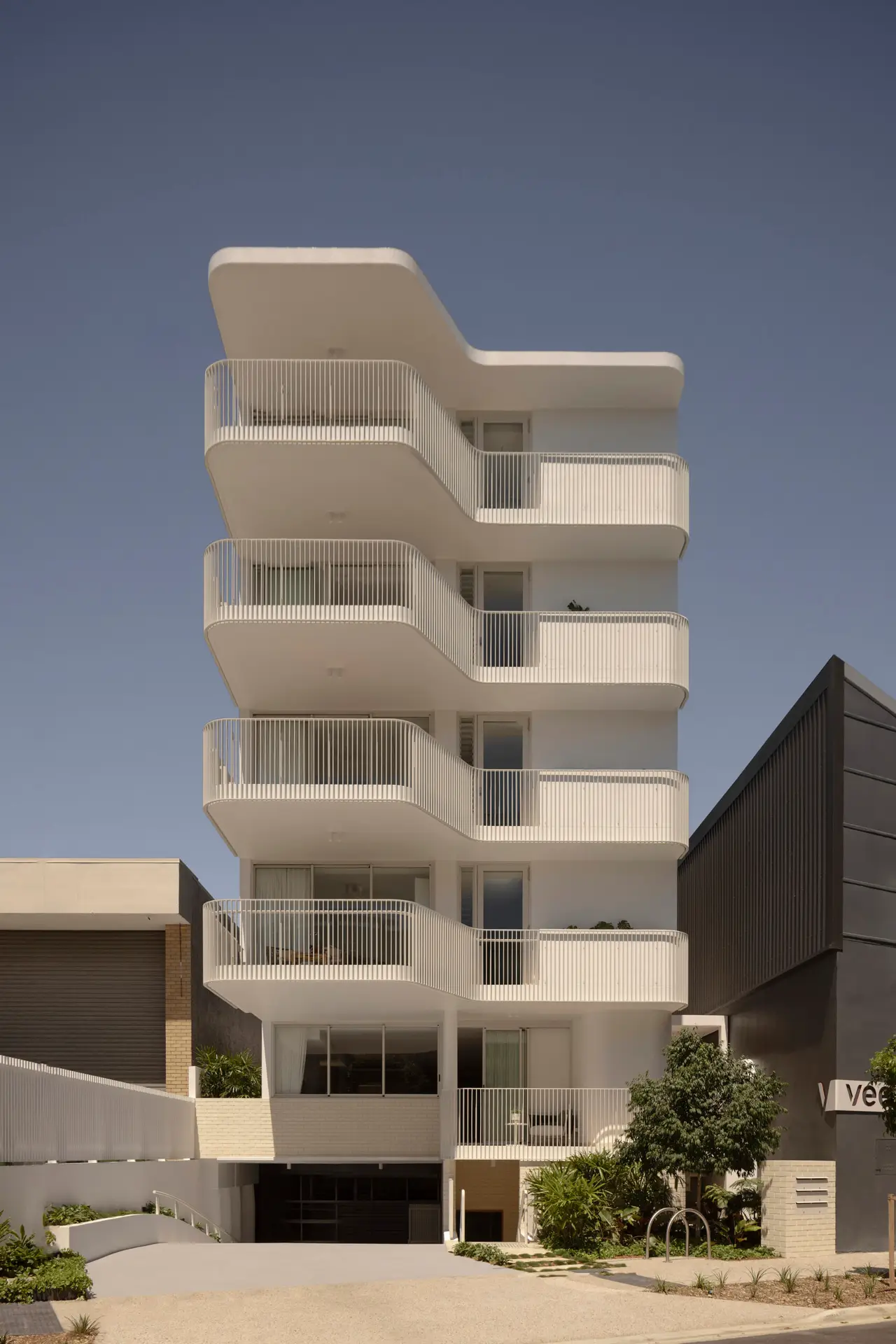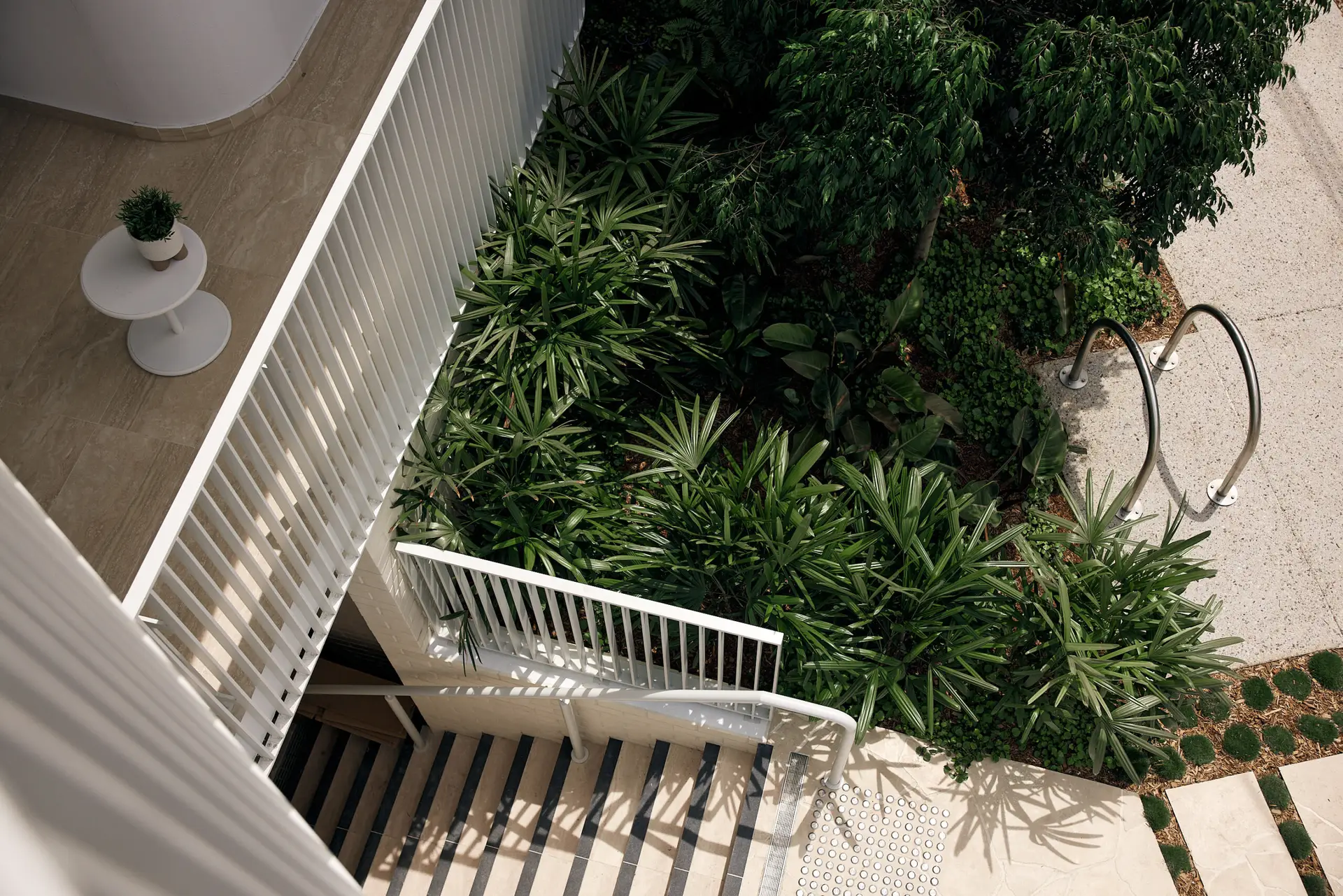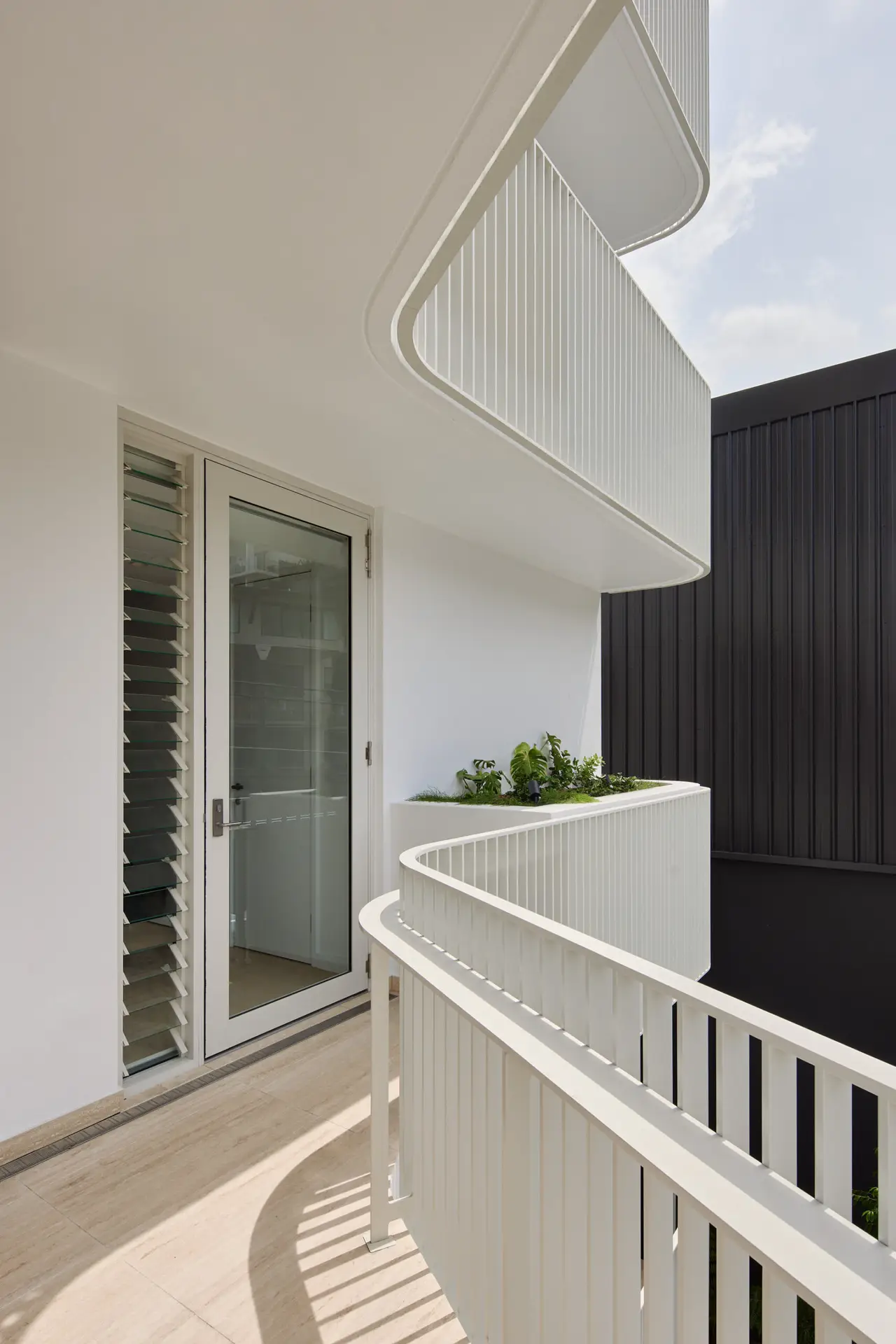 Each residence embraces Brisbane’s subtropical climate, with north-east orientations, spacious balconies, and integrated planters that promote natural ventilation and a connection to nature. Fluted concrete balustrades continue the vertical motif, marrying form and function.
