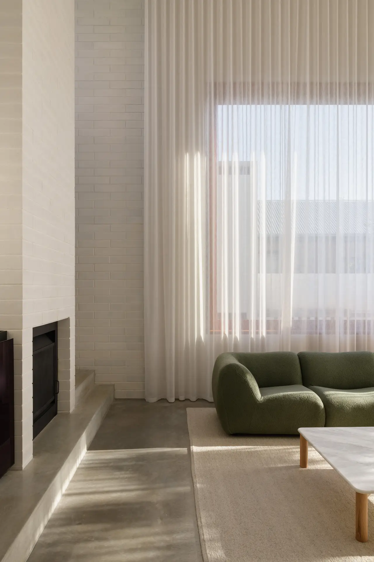 A minimal material palette of concrete masonry simplifies the volumes and unifies spaces. Light as a material, adds layers to solid materials over time. Sheer curtains clothe the interior facades. The time in which to enshroud the solid and void walls, renders the space and expresses a more ephemeral moment in time.