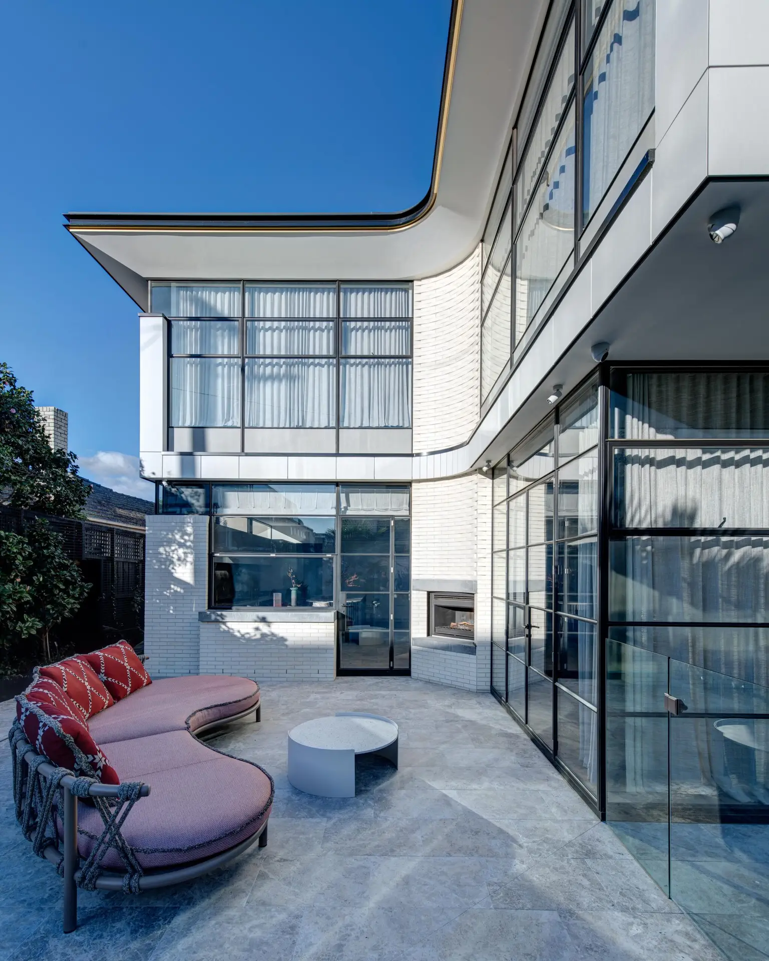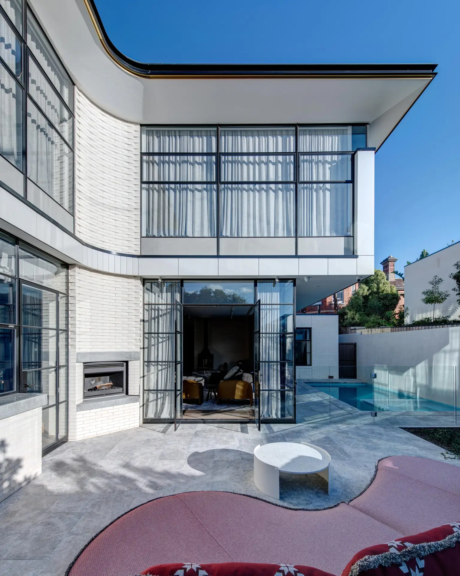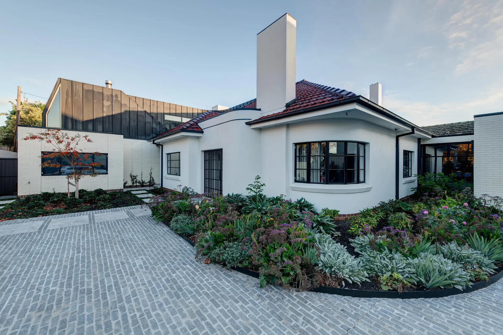 Flow House rethinks a 1940 Art-Deco inspired Interwar cottage into a light filled contemporary home, in which spaces effortlessly flow across a continuum, from the formality of the Interwar, to crisp contemporary areas evoking the Deco, with a soft white palette of Roman bricks punctuated by filigreed black steel frames.