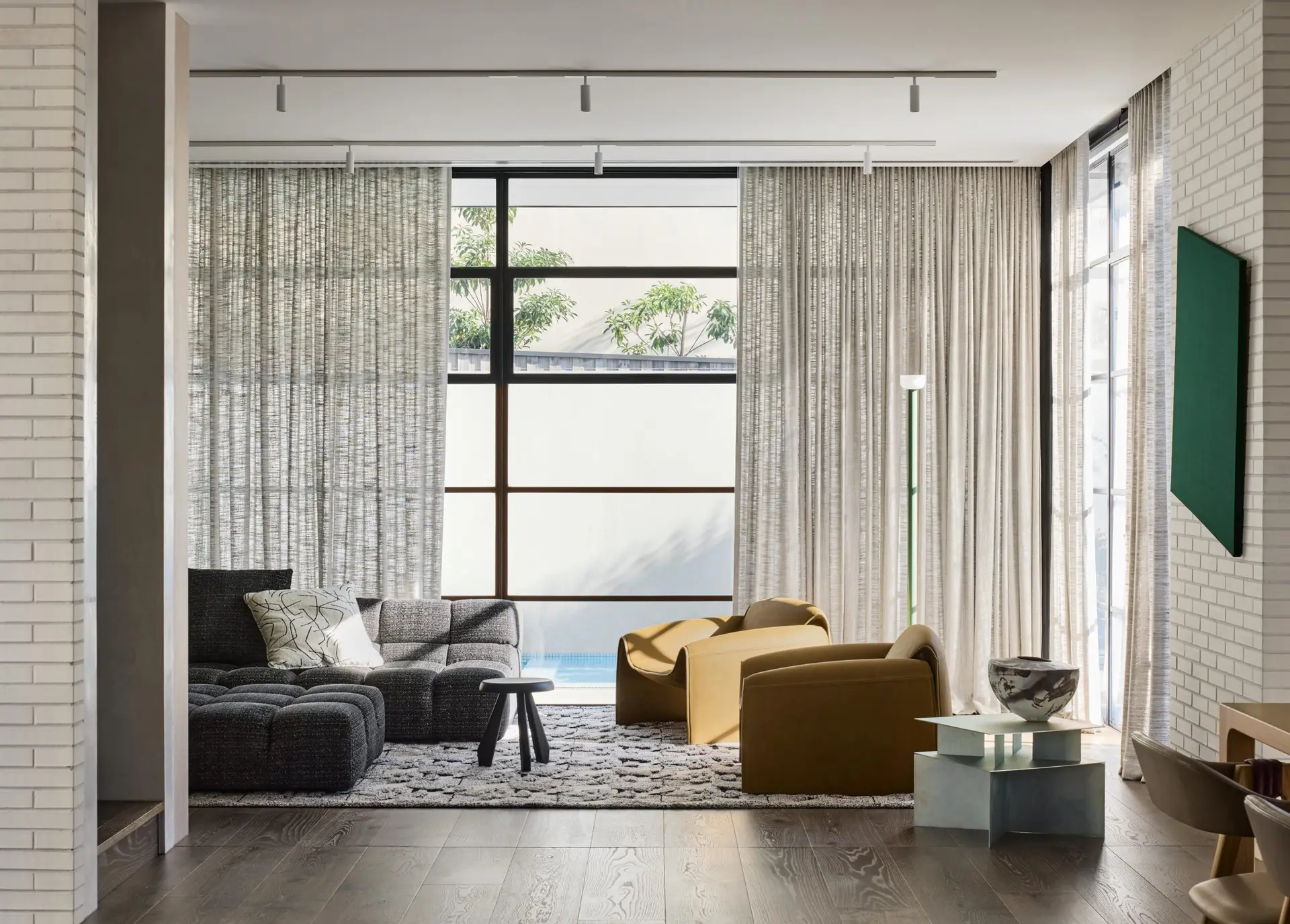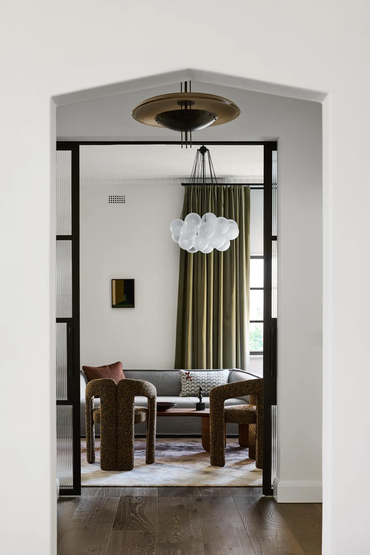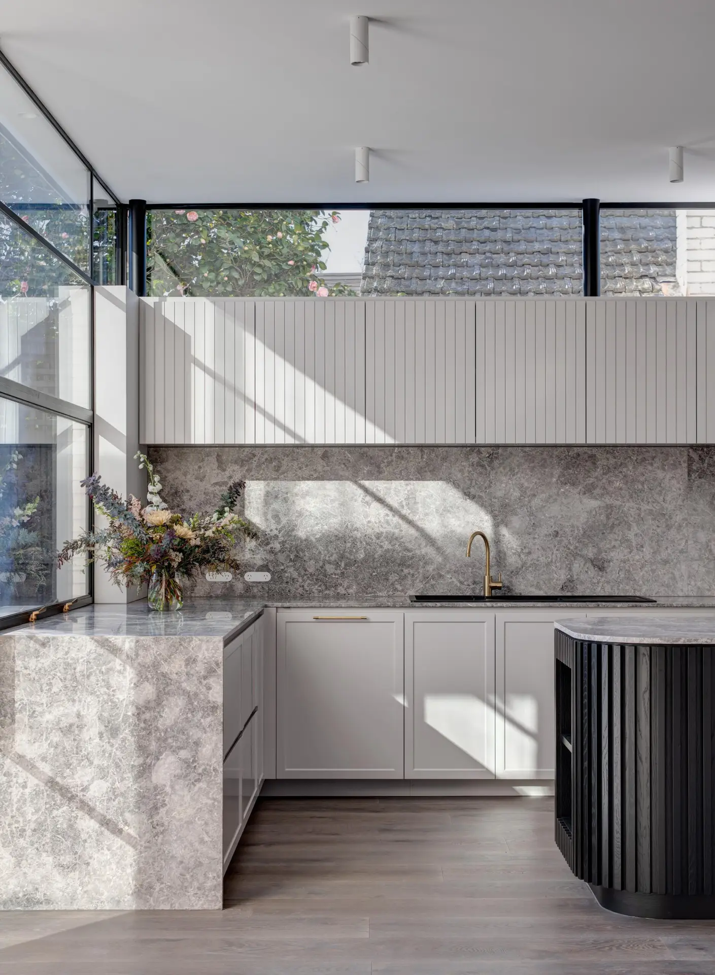 Flow House rethinks a 1940 Art-Deco inspired Interwar cottage into a light filled contemporary home, in which spaces effortlessly flow across a continuum, from the formality of the Interwar, to crisp contemporary areas evoking the Deco, with a soft white palette of Roman bricks punctuated by filigreed black steel frames.