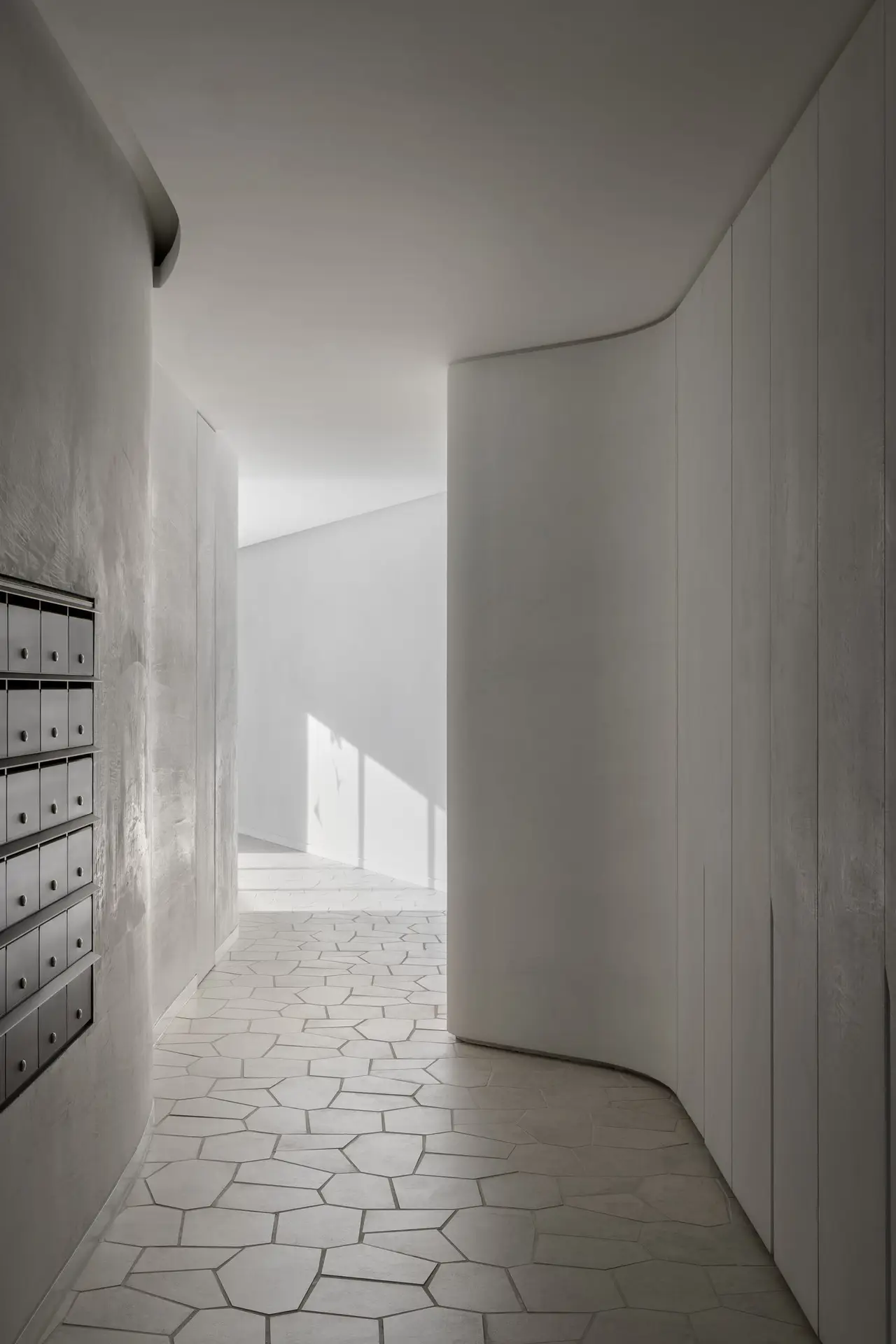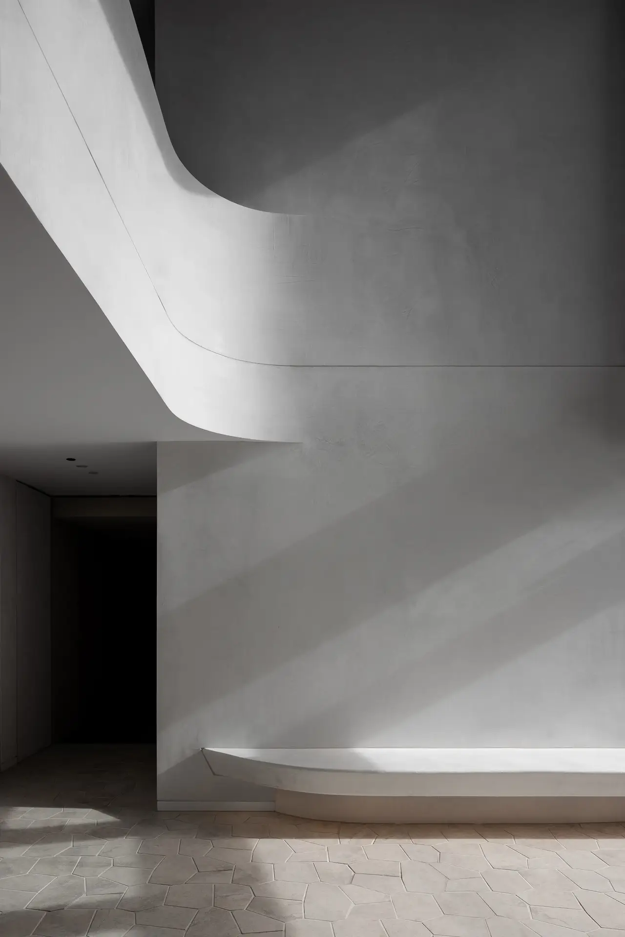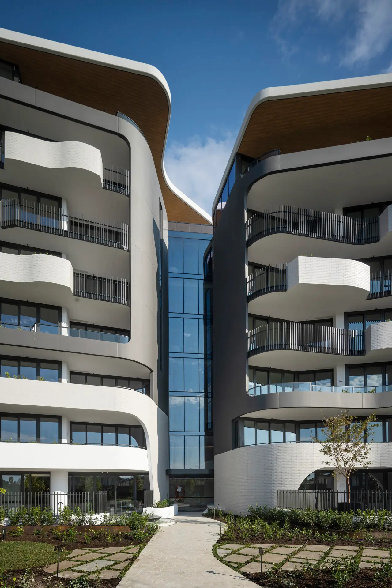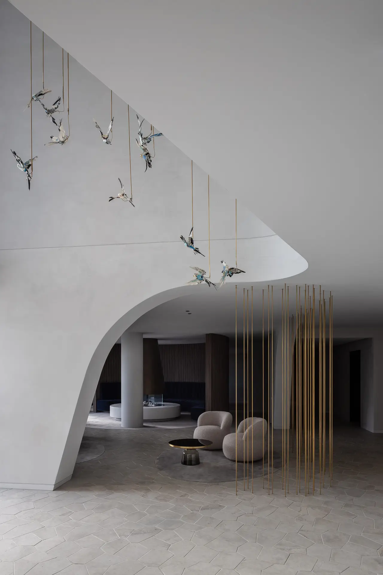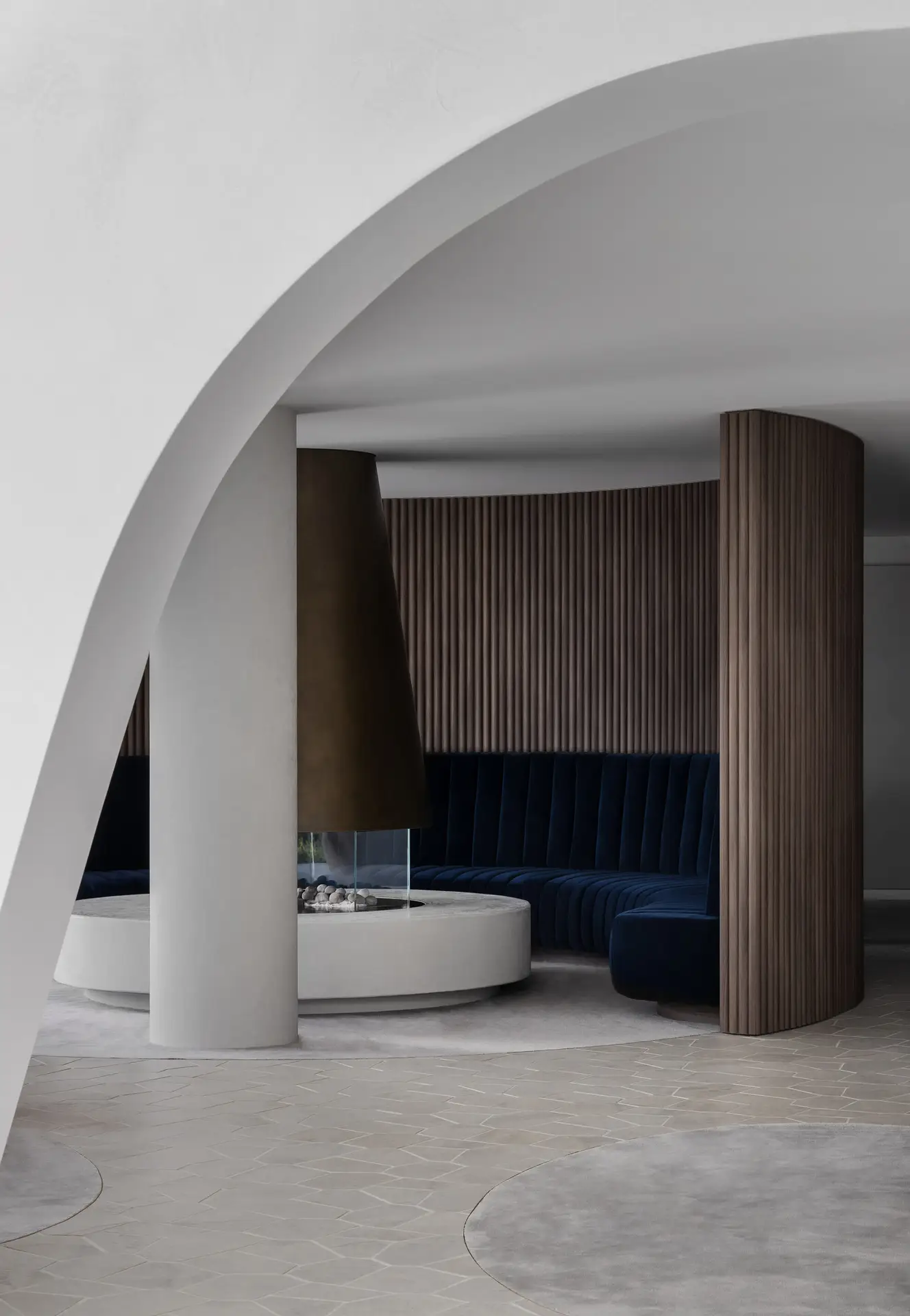 The Forme lobby is a highly sculptural space that carries the exterior launguage of biophillic architecture to the interior creating a wholistic composition and experience. The minimilist finishes harmonize with the organic forms and the play of shadow and light on the sinous surfaces. The simplicity of the space also allows Anna-Wilie Highfield’s bird sculptures to come to life seeming to fly out of the of the two story void. The residents lounge off the lobby acts as the “lounge room” for the greater building. with a circular banquette sourrounding a fire place providing a place for residents to meet, enabling a culture of community.