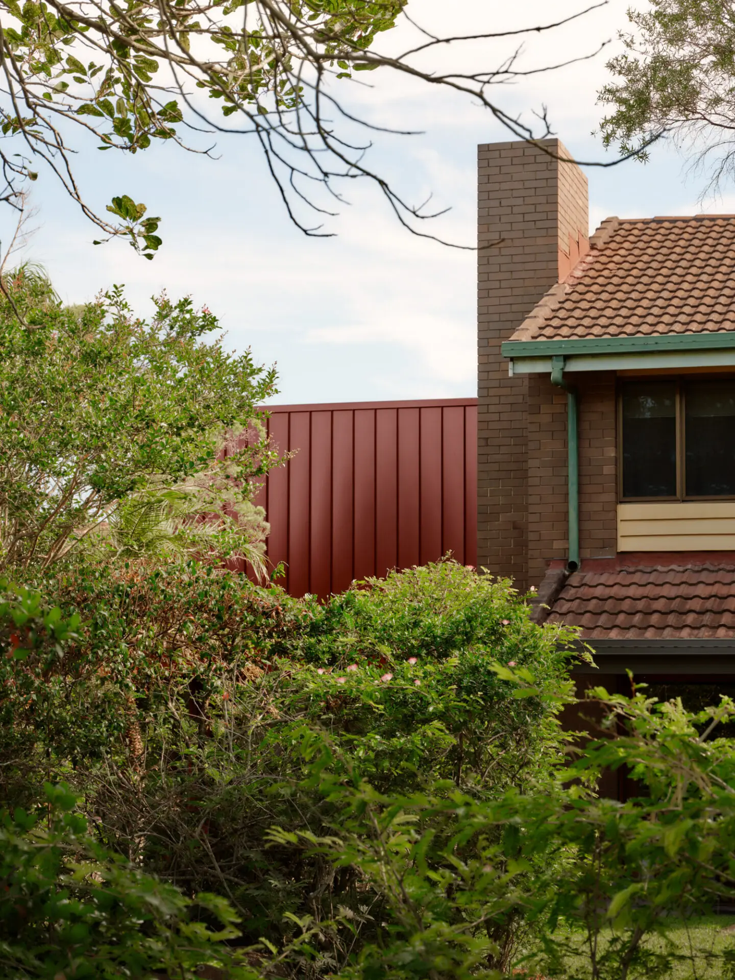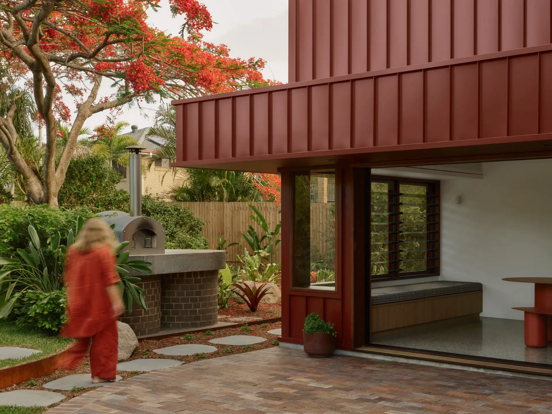 Rather than building bigger, the design focuses on precision and restraint. A lofted volume draws light and air deep into the plan, while large openings dissolve the boundary between inside and out, connecting dining, garden, pool and pizza oven into one cohesive living sequence. The addition respects the original 1979 brick home, continuing its wrapping roof form and responding to its cellular planning, while a bold contemporary material expression clearly distinguishes new from old.