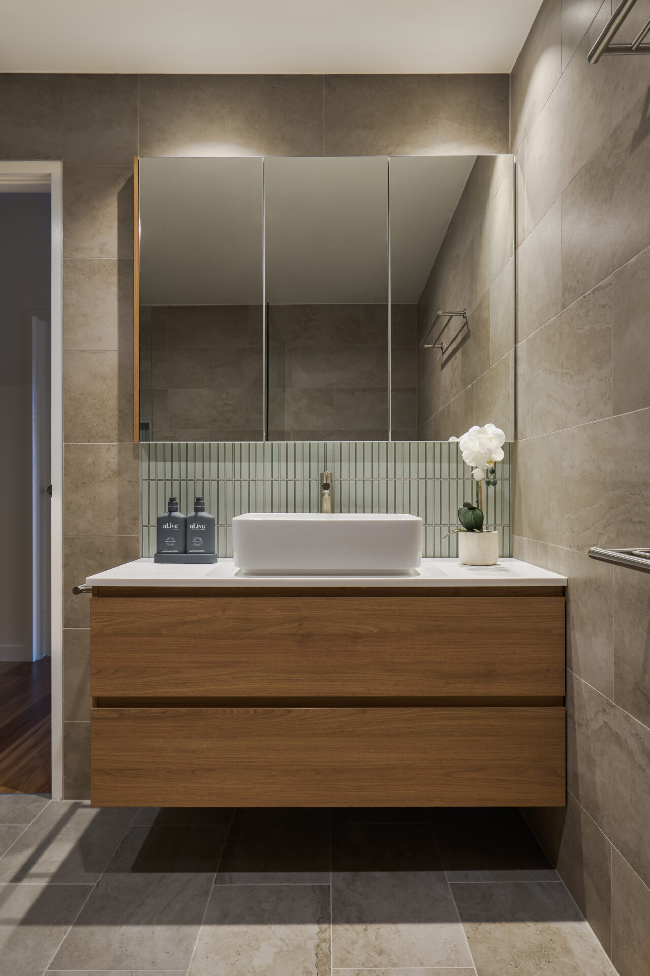 The building is carefully oriented to its coastal hinterland context, ensuring minimal overshadowing and maintaining privacy, while façades of stone, timber, and fine-grain detailing reduce scale and integrate it with its surroundings. Apartments are planned for light, ventilation, and views to Macauleys Headland, Jetty Beach, and the Great Dividing Range.