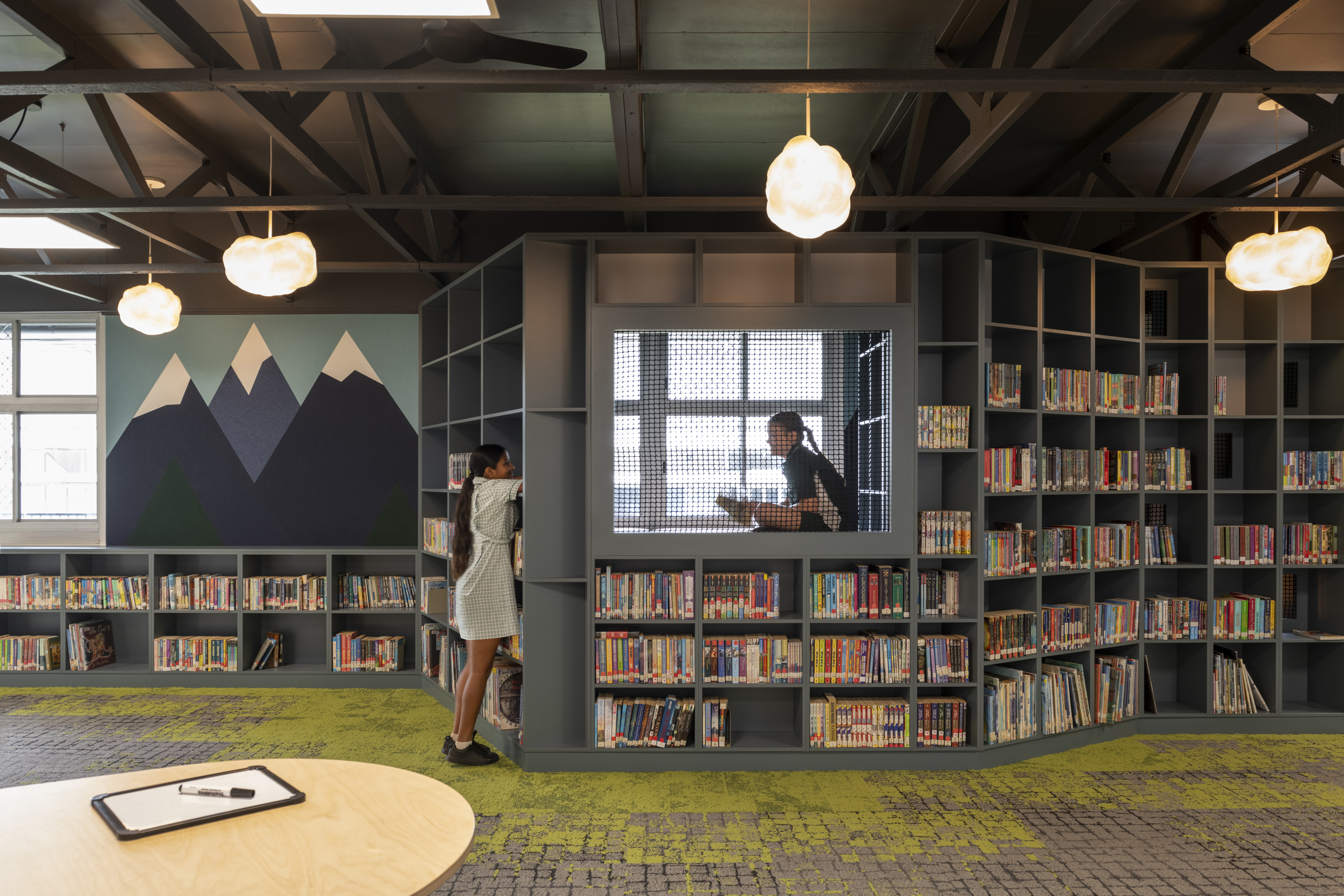 Cost-efficient and sustainable, the design preserves the existing structure while focusing new works on creative fit-out elements. While the new space exhibits library functionality it is more than a simple resource centre, it’s a refuge for retreat, a place to explore, and dream.
