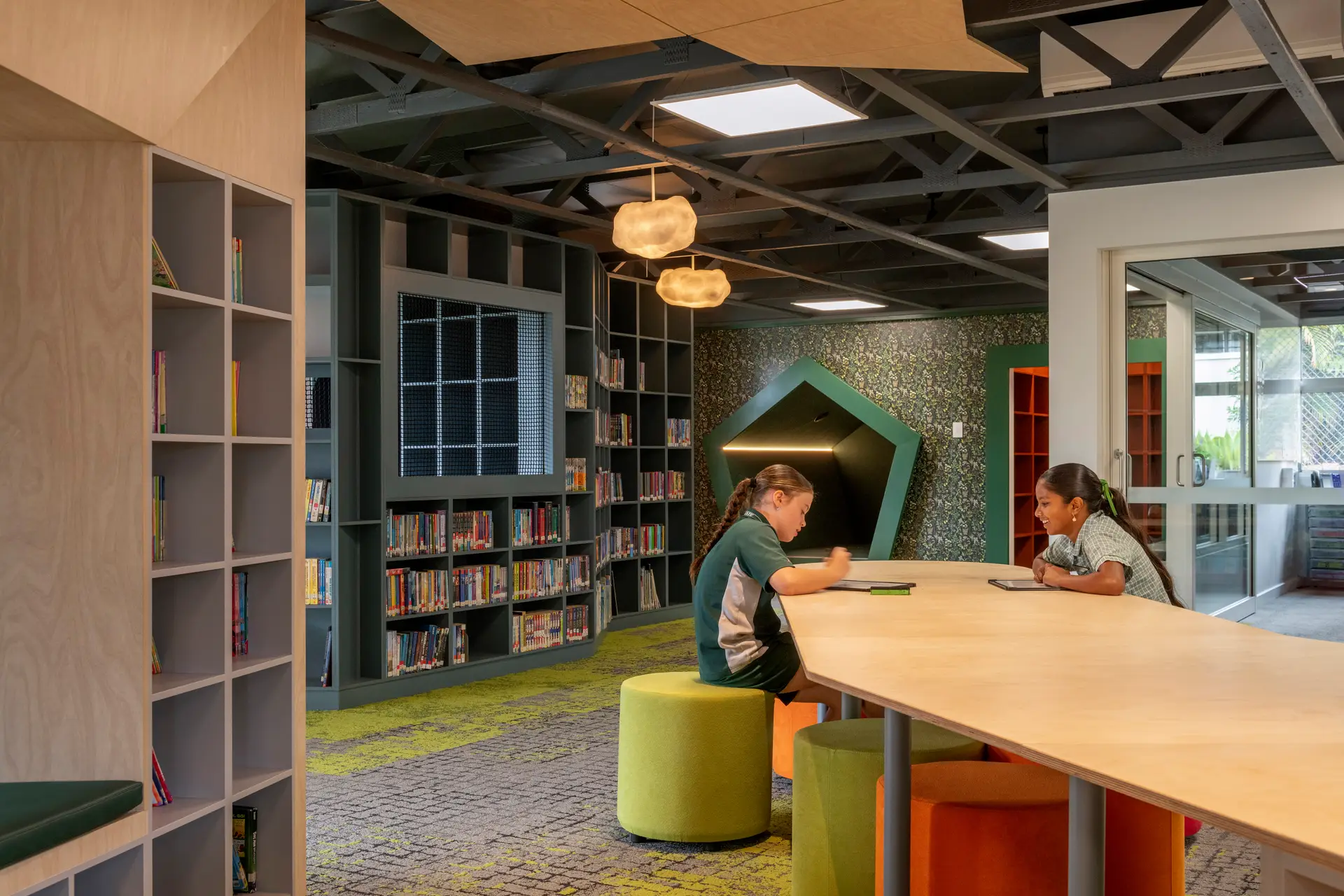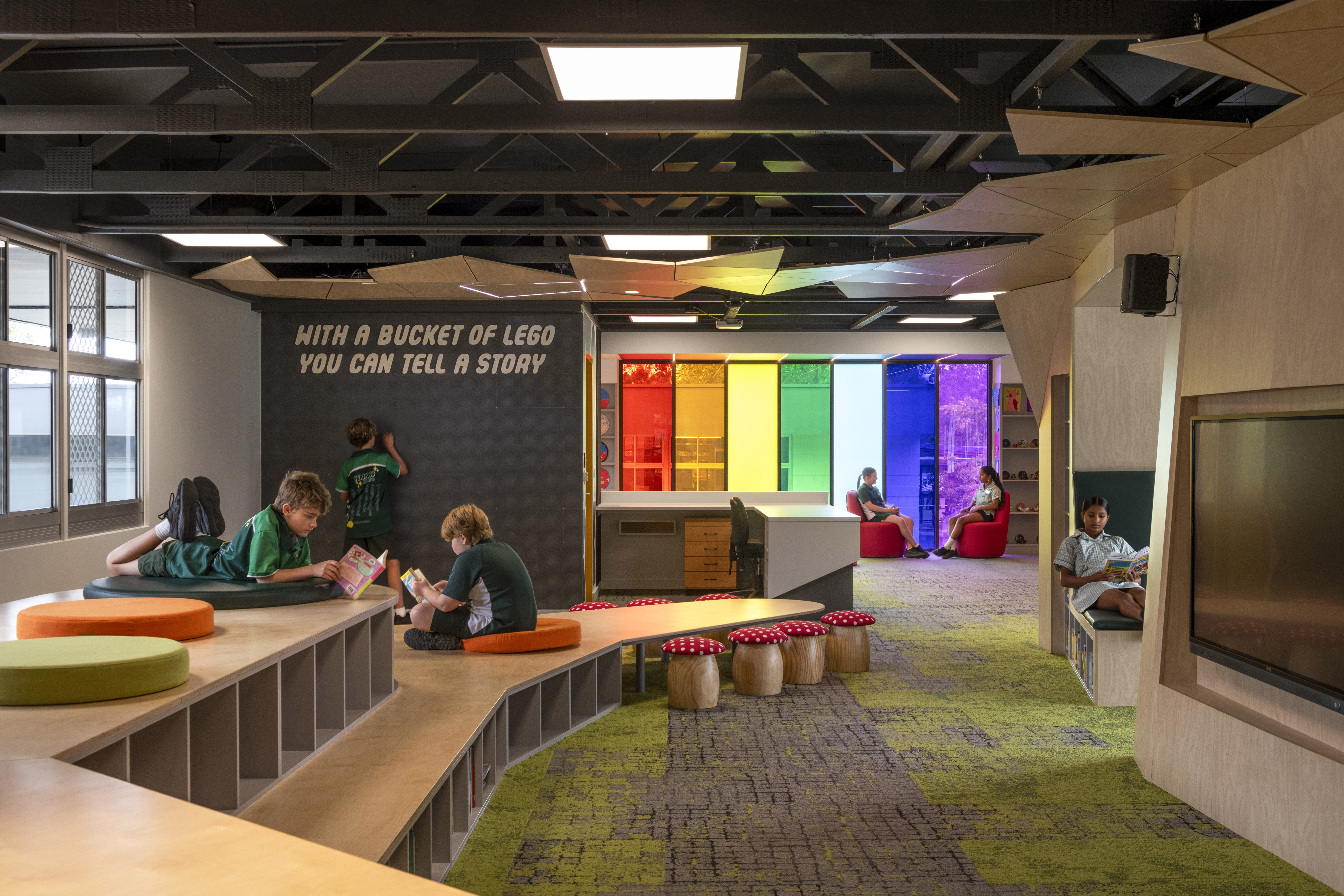 The Helensvale State School Library refurbishment transforms a 1970s building into a “Place of Wonder” inspired by Year 3 students’ drawings, including bear caves, rainbows, and hot air balloons. Designed to spark exploration, engagement, and comfort, the project reconfigures the northern entry to connect with a future landscaped outdoor learning area. A large northern window floods the space with rainbow light, creating a welcoming transition space.