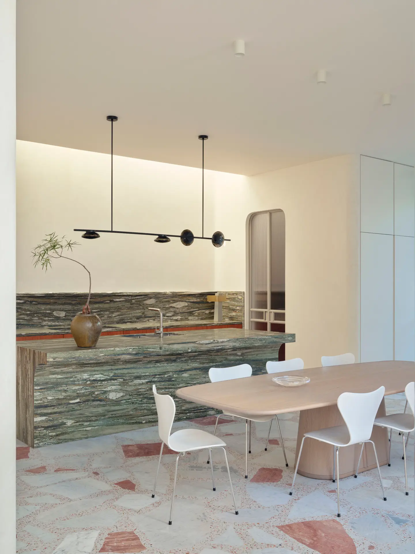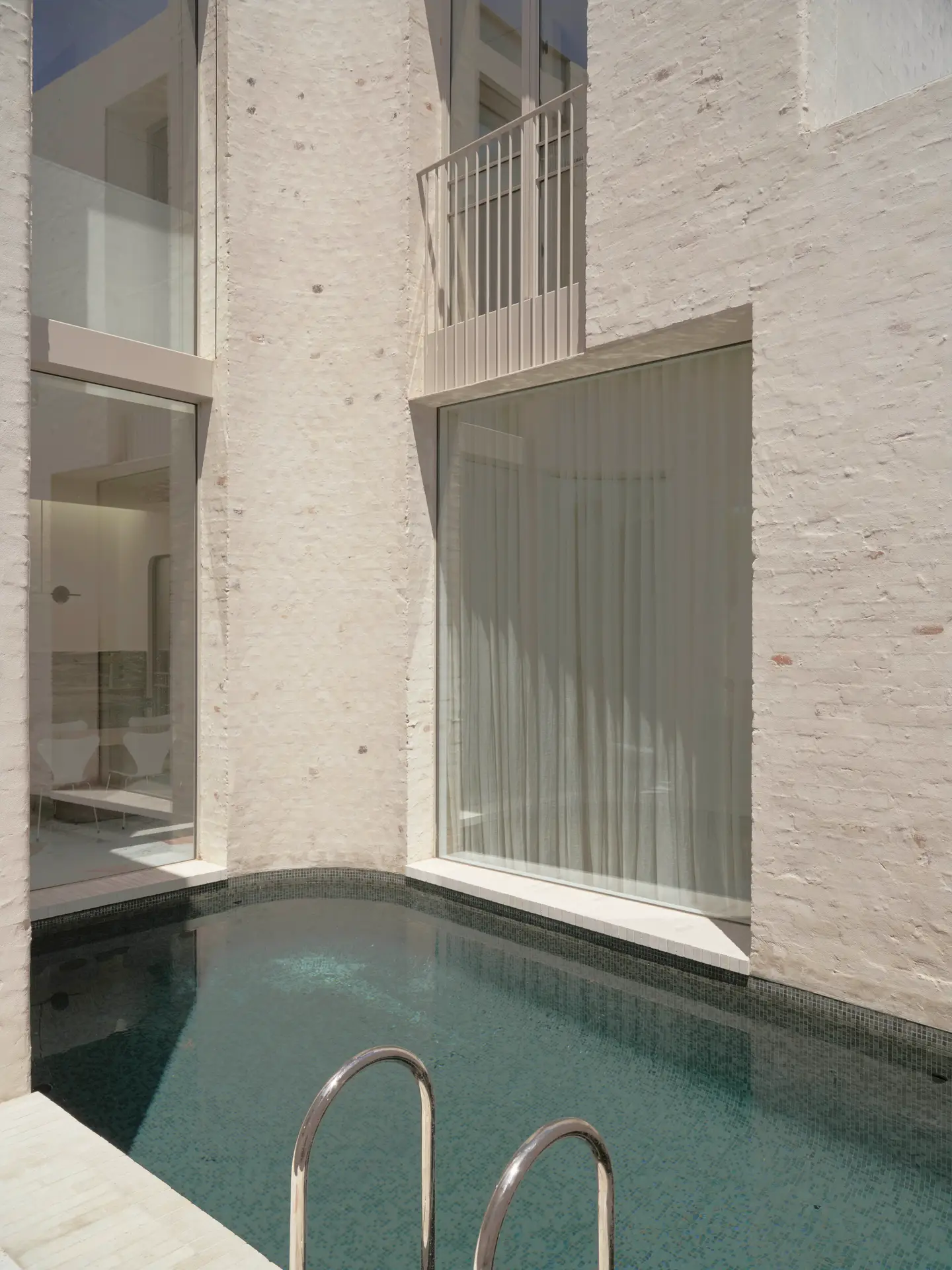 A curated entry sequence leads visitors through the heritage structure to a double-height, light-filled addition centred around a swimming pool—an homage to the client’s childhood memories. The pool becomes the home’s focal point, offering dynamic reflections and a serene outlook from the kitchen and upper level.