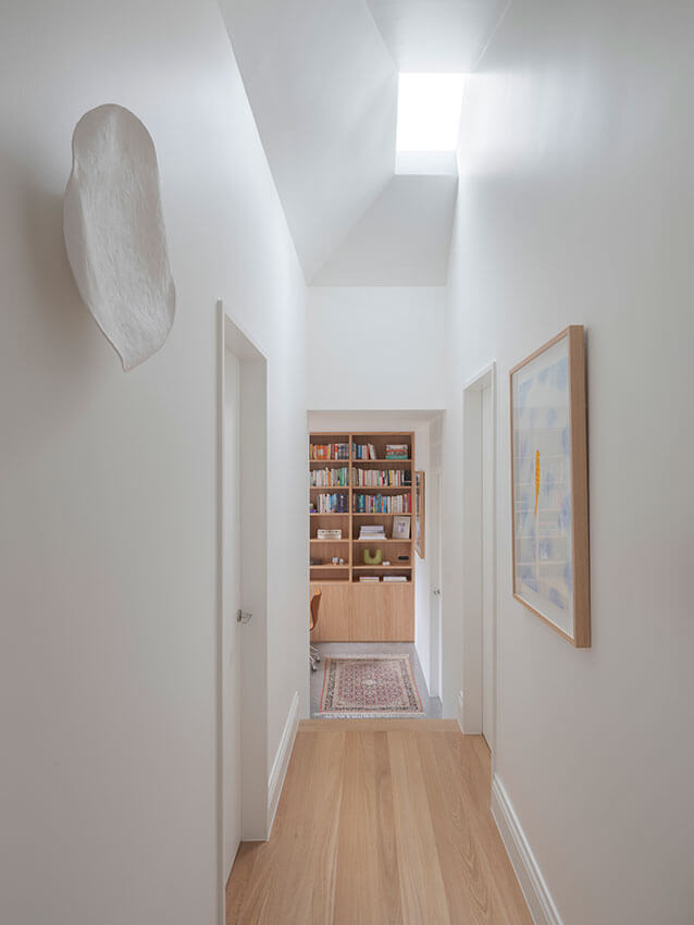 A hallway leading to the bedrooms scoops out the roof volume to draw in daylight before transitioning to the new sleeping and work spaces. Sited a few steps down, the addition responds to the sloping site and draws the outside in through generous apertures. A window seat, floating desk and deep sills are spaces to contemplate and enjoy the gardens.
