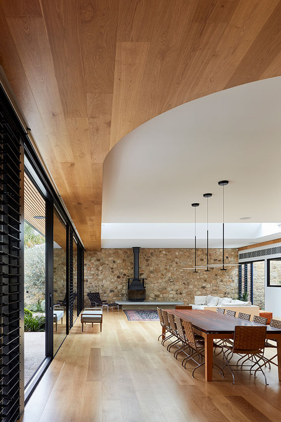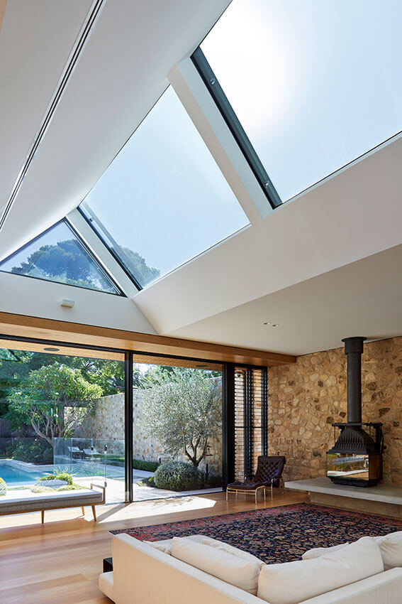 At the rear is a two-level addition, with a large living area opening out to a carefully landscaped courtyard and swimming pool. A large, glazed roof section shafts winter sun into the living area with an external blind providing summer shade. A wall of locally sourced random stone encloses the rear of the courtyard and extends through the lounge room, tying the interior and exterior to add to the feeling of space.