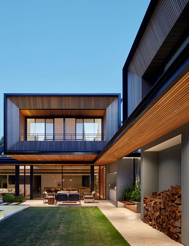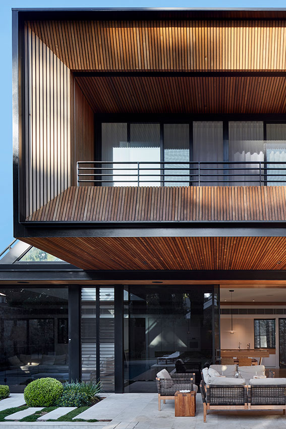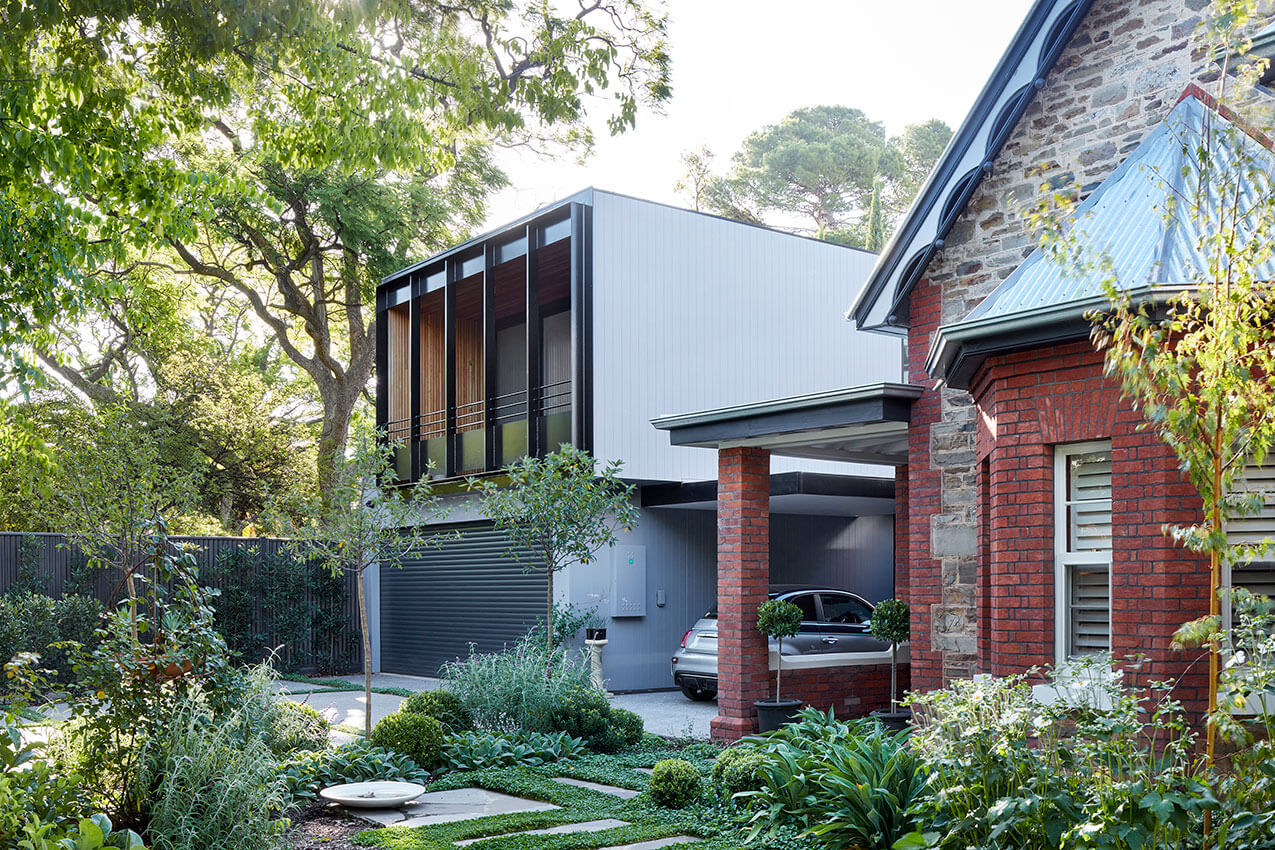 A two storey structure and with an undercroft presents as a distinctly separate modern structure, neutral and neat, not dominating the finely detailed original house.