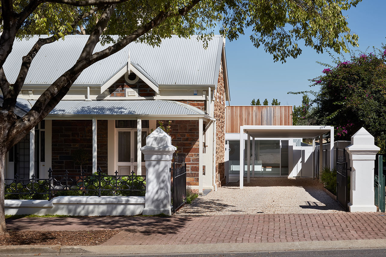The original 1890s villa was preserved and a collection of structures, including a new addition, carport and garage were respectfully inserted between existing site elements.