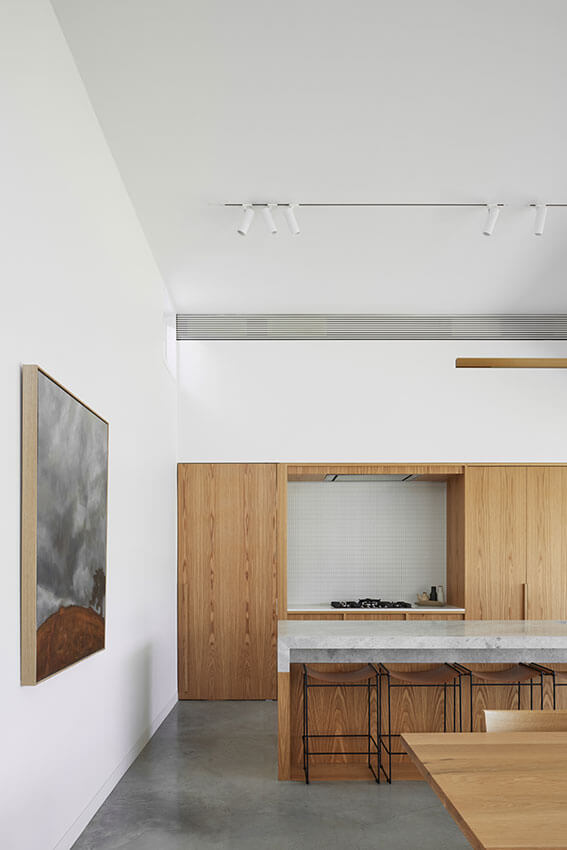 This deceptively simple, restrained addition at the rear of a symmetrical vila in St Peters, incorporates elegant, pared-back detailing typical of Architects Ink. The ultra-thin rear verandah shelters outdoor entertaining space and separates the addition’s glazed base from the cedar clad top. Rational planning and articulated ceiling volumes create human scaled, comfortable interiors enhanced by timber joinery.